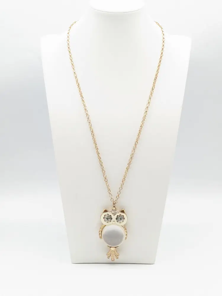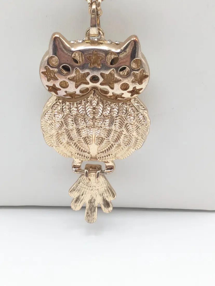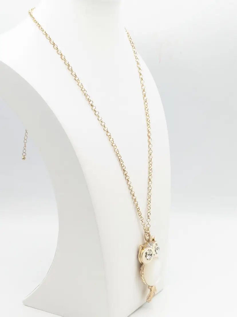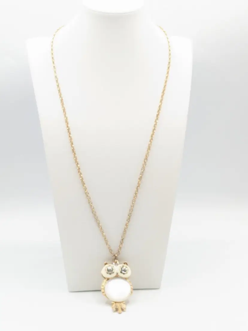 Good condition. Light scratches on acrylic white belly. Tail is articulated/moves. Owl measures 3" and chain is28" with a 3" extender.