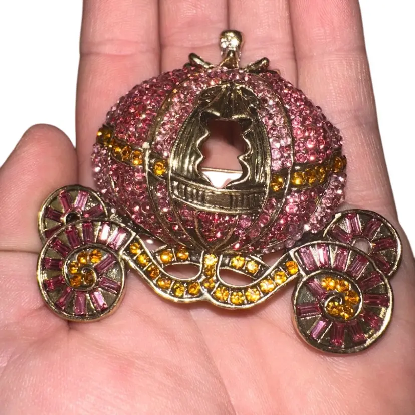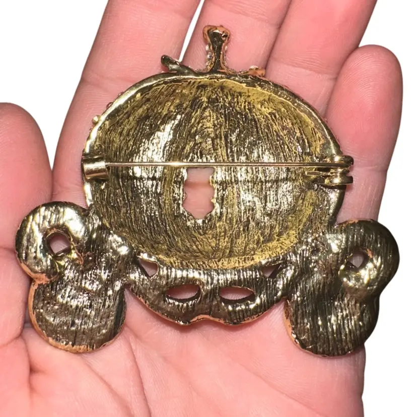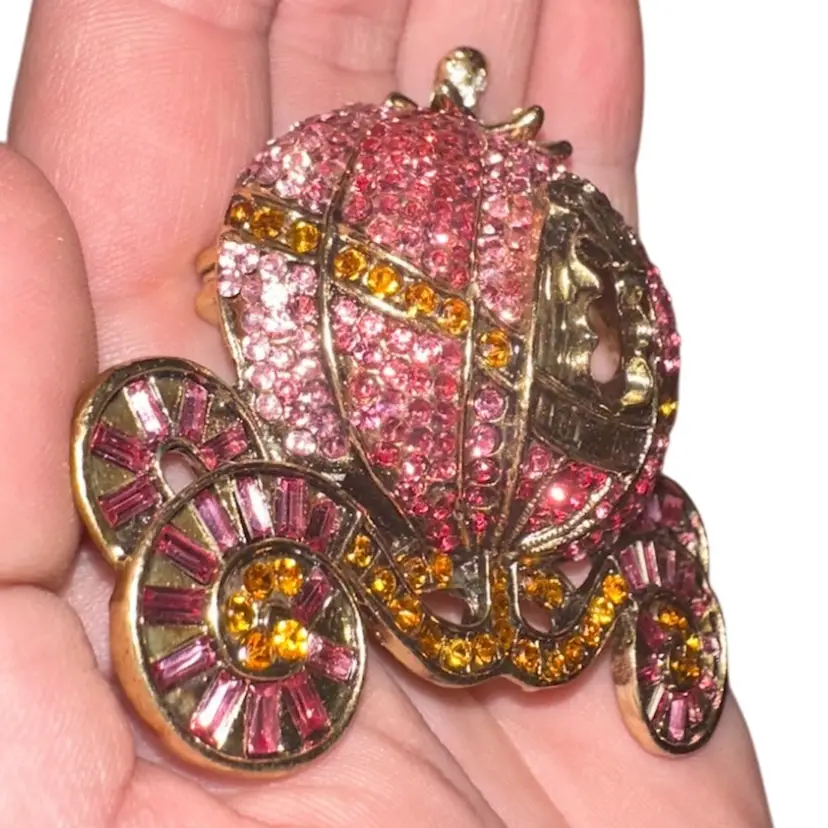 Gold Tone Pink & Orange Pumpkin Cinderella Coach Pin Rhinestone Brooch 2.5” tall x just over 2.5” wide