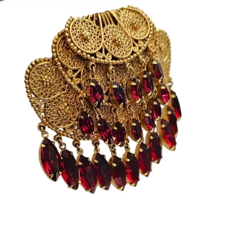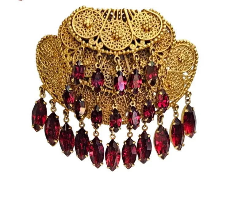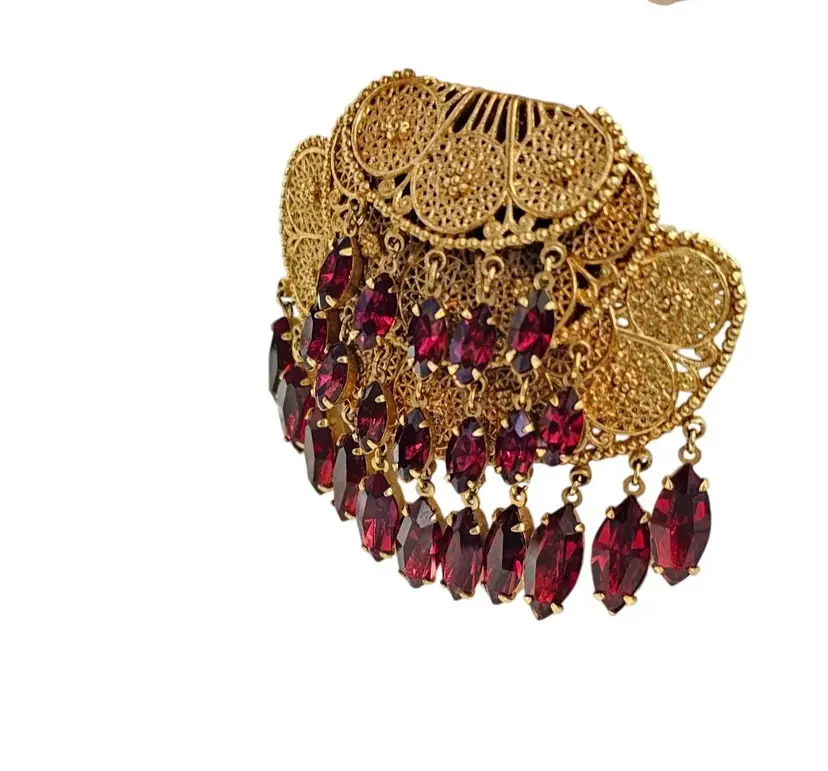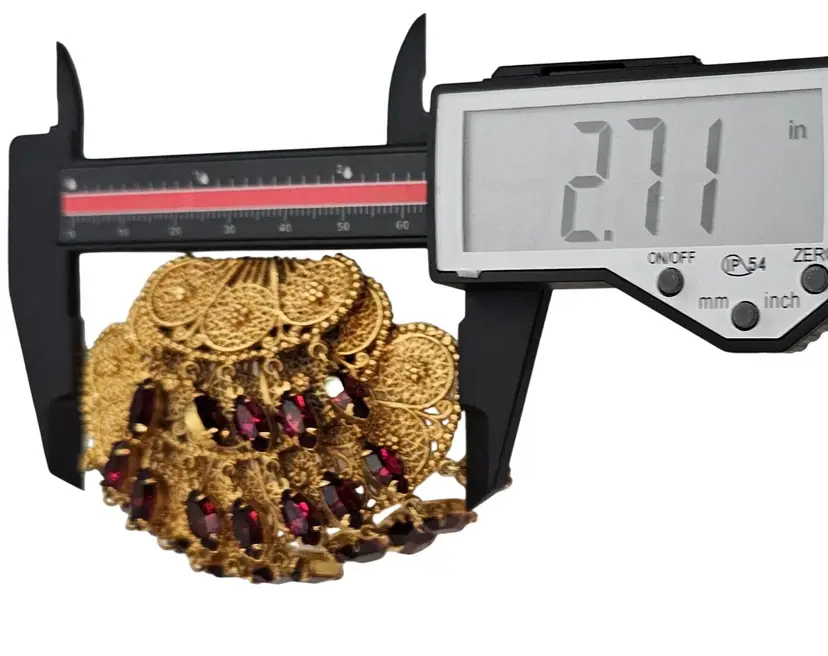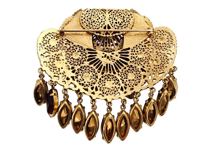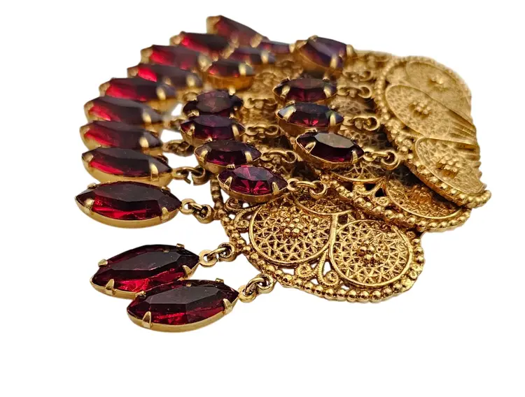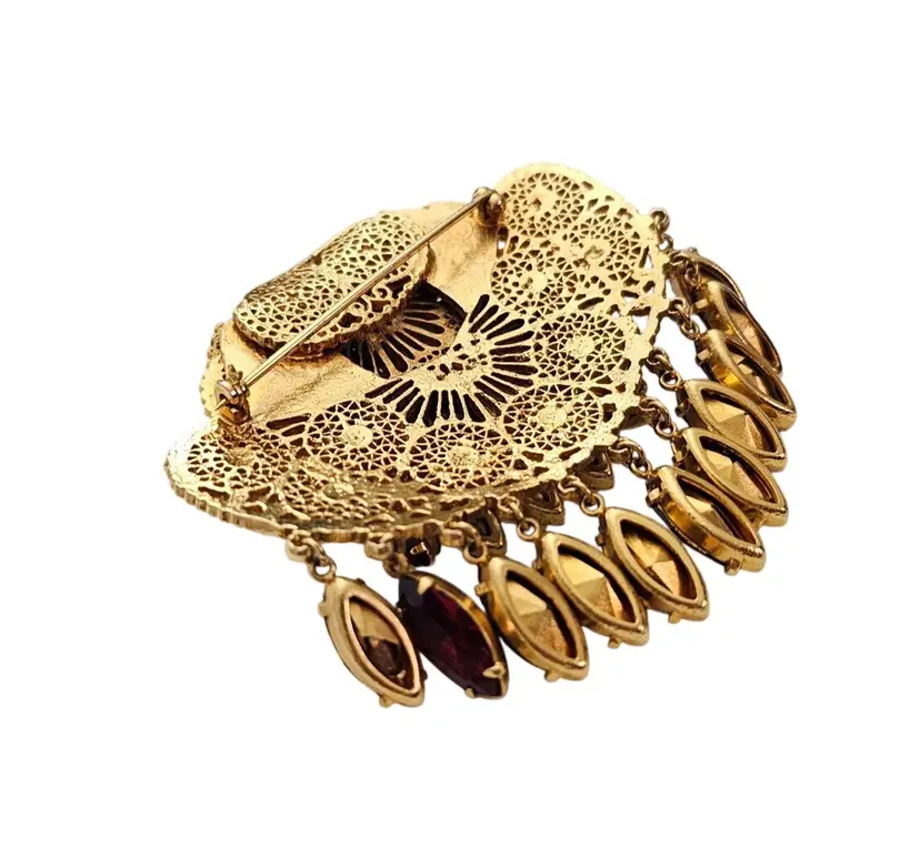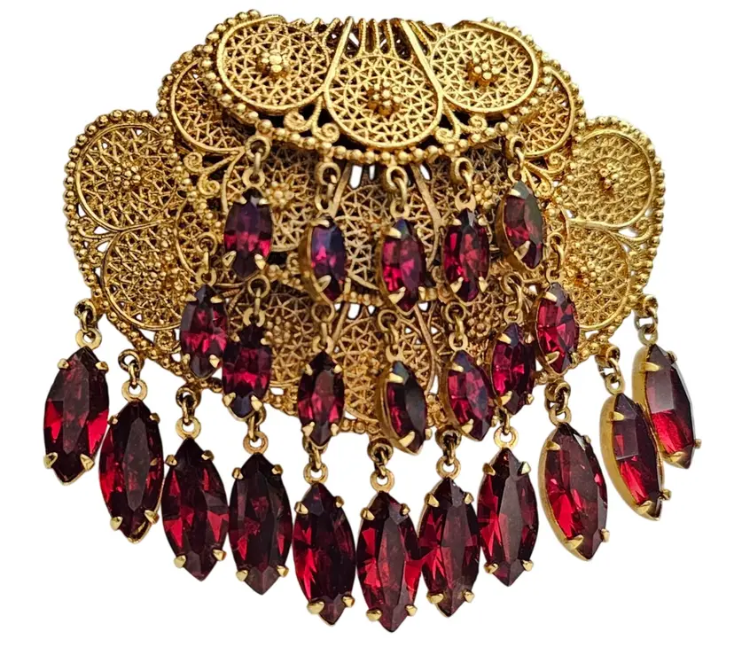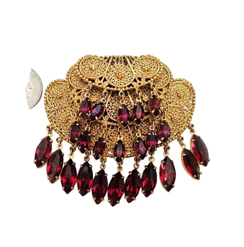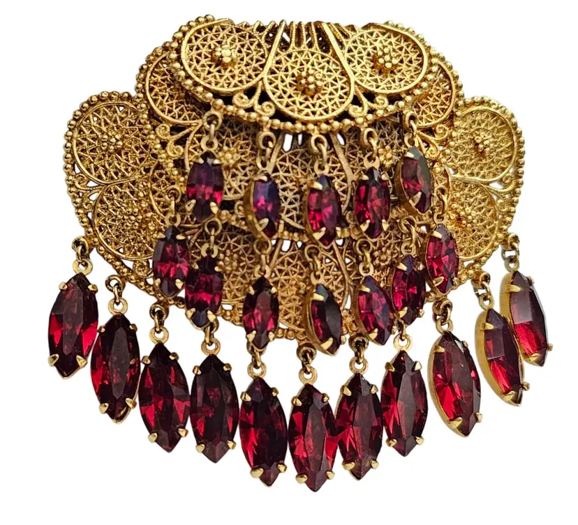• Gold Tone Tiered Dangle Brooch • Hard to find and rare item, costume jewelry • Spanish, Renaissance Revival jewelry • Gold tone base metal setting • Tiered and Filigree-style designed brooch • Red rhinestones dangle • Individually prong-set Navette-shaped rhinestones • It measures approximately 2.7 inches in width • The back is designed with a secure pin component, making it easy to fasten to any outfit or accessory • Unsigned vintage piece • Good condition • C245