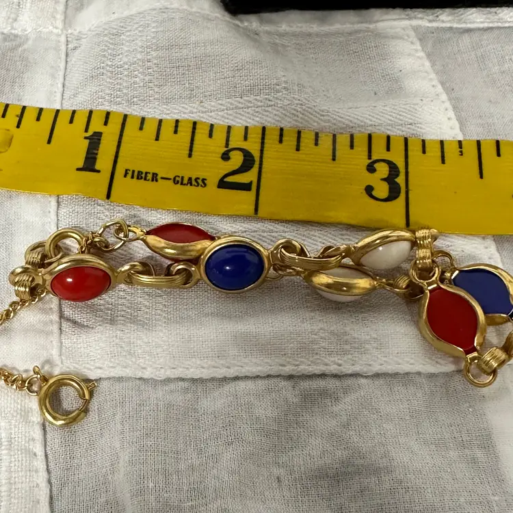 Plastic beads. 8” plus 2” safety clasp. Very nice condition.