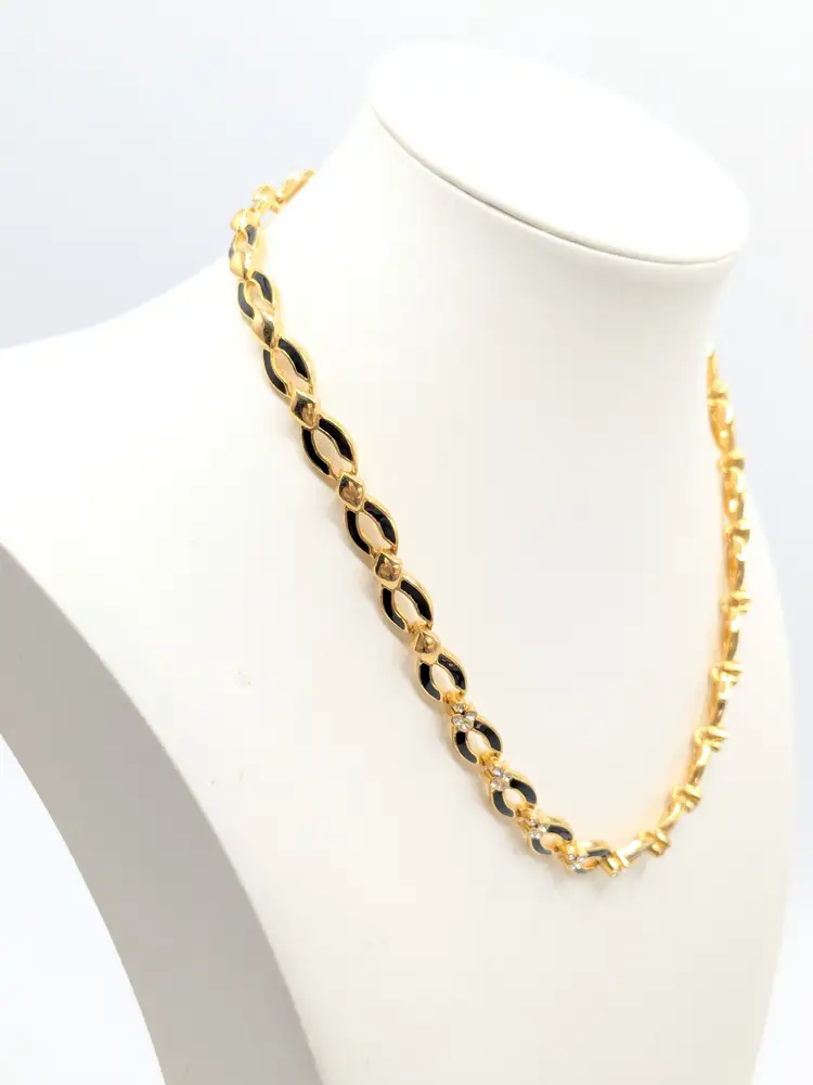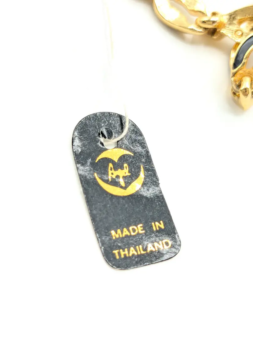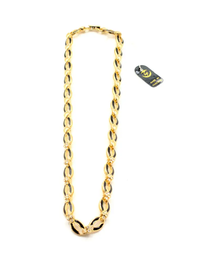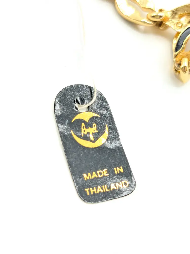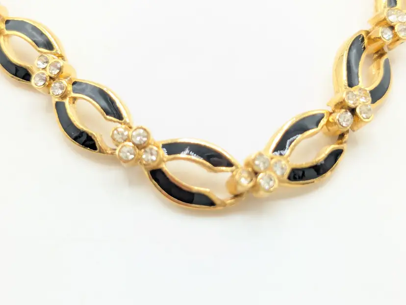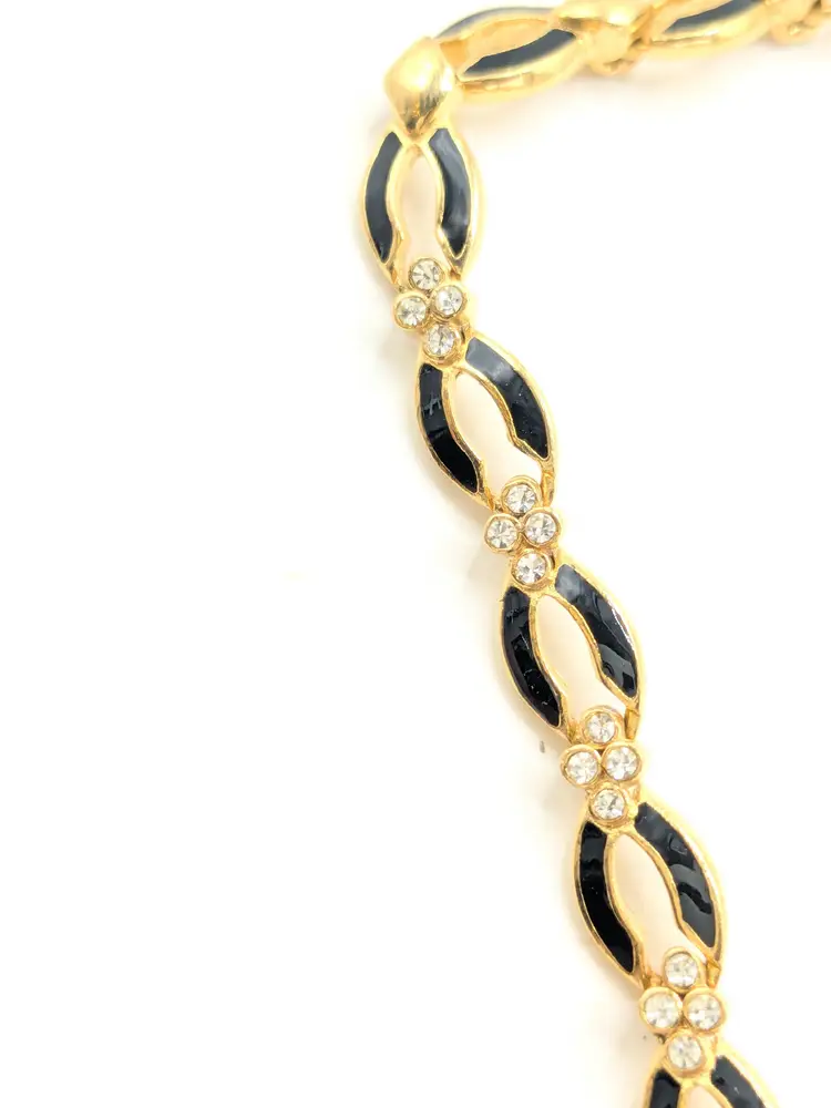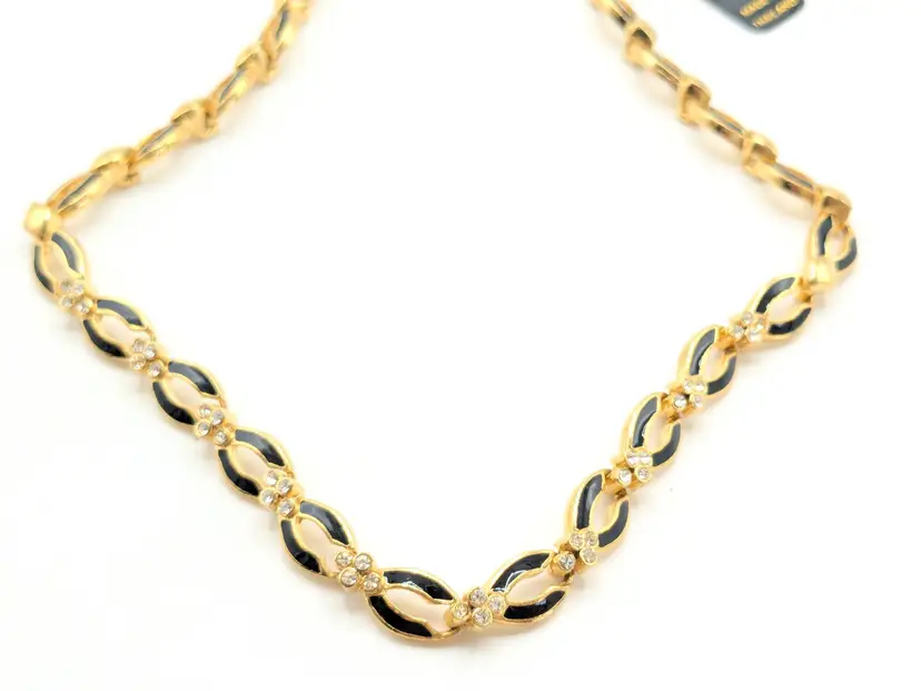 Good condition. New old stock. Gold tone is bright and shiny with no color loss. Features rhinestones and black enamel. Tag is marked Angel, an early QVC jewelry line. Made in Thailand. EN3 Measures 16" in length. EN3