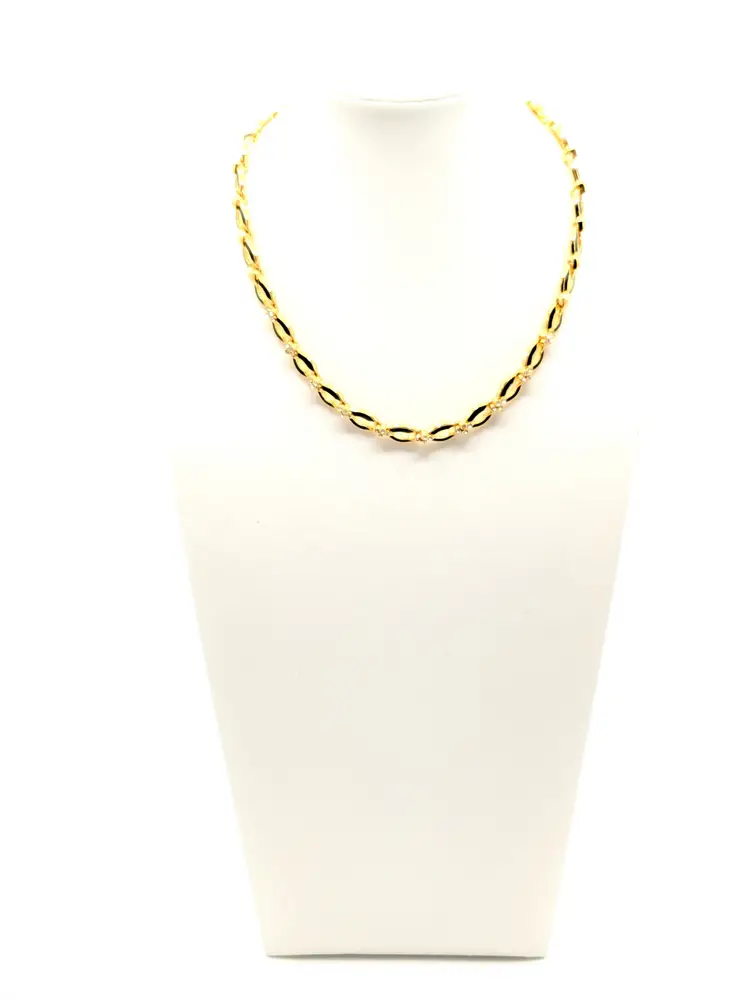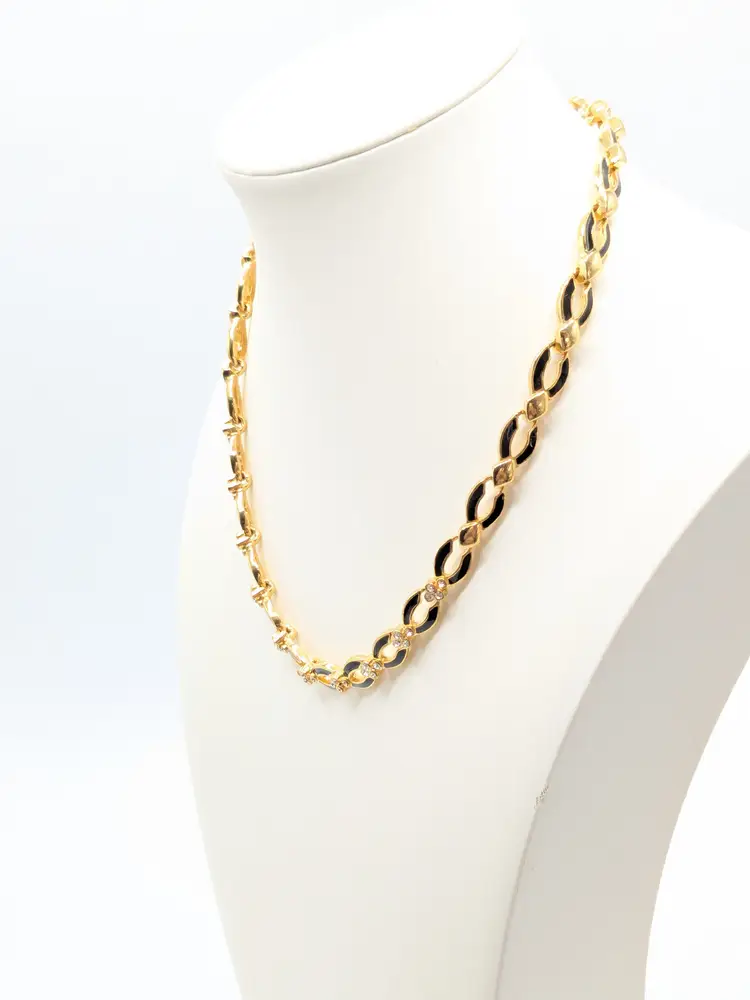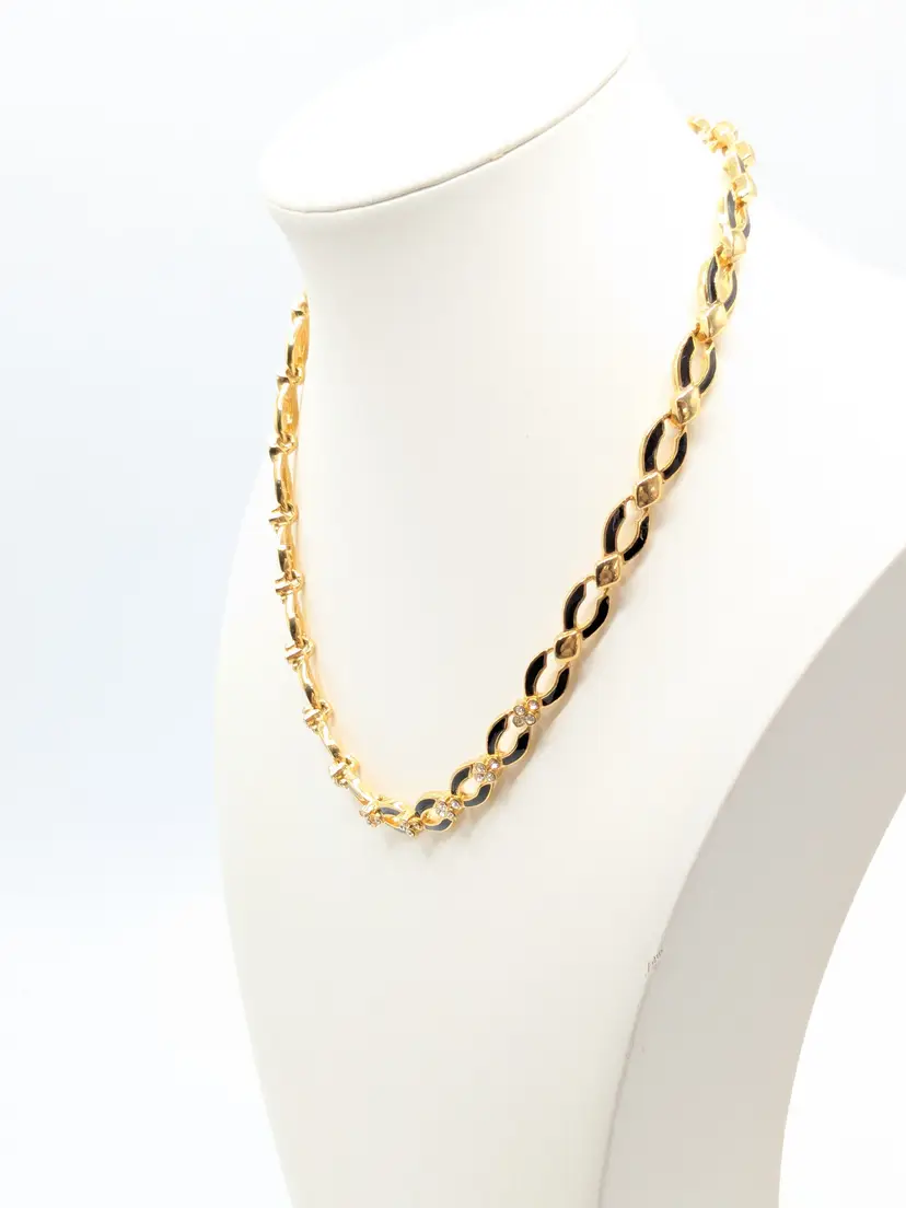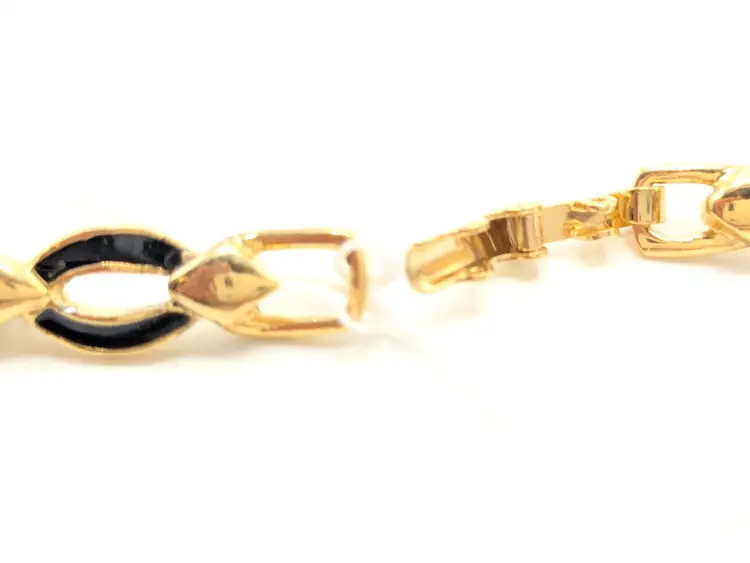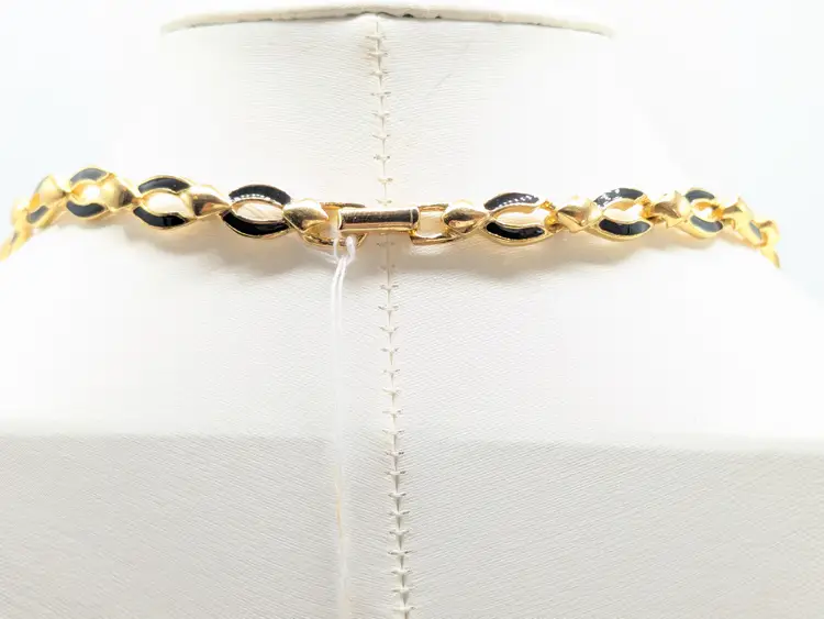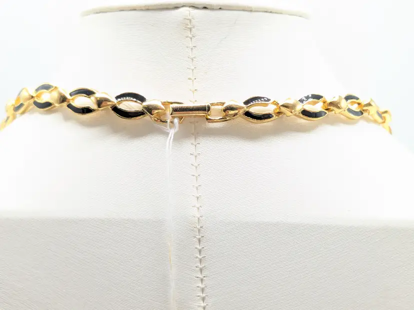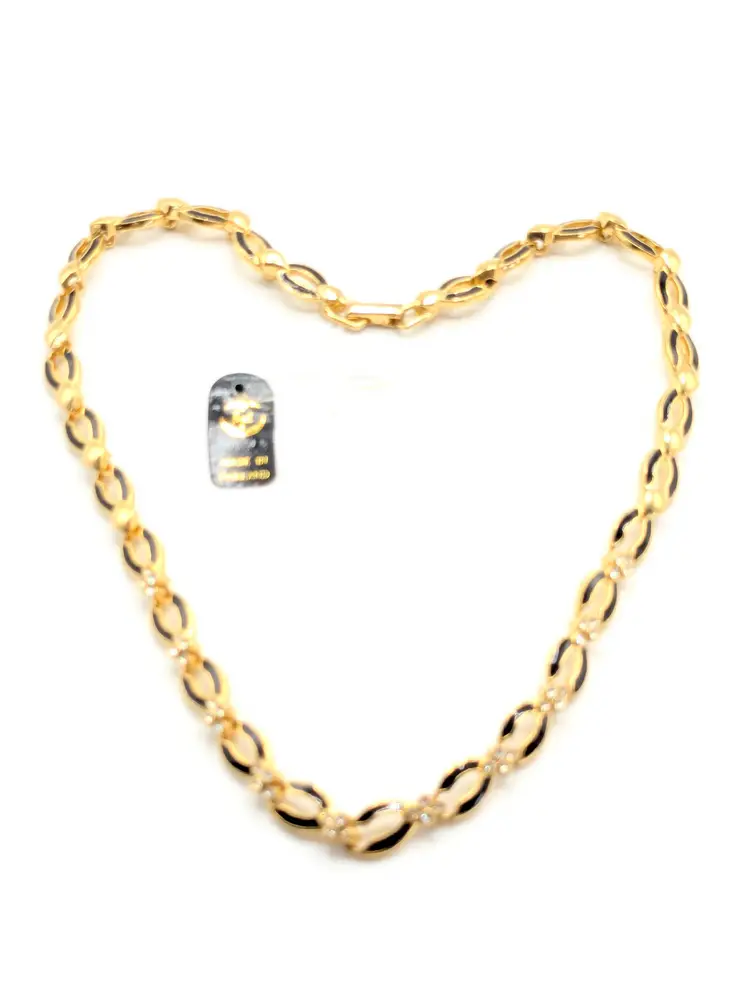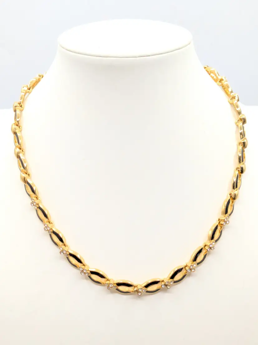 Good condition. New old stock. Gold tone is bright and shiny with no color loss. Features rhinestones and black enamel. Tag is marked Angel, an early QVC jewelry line. Made in Thailand. EN3 Measures 16" in length. EN3