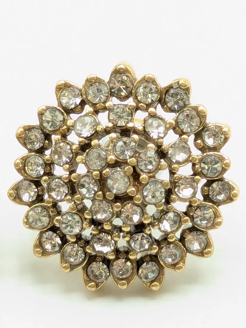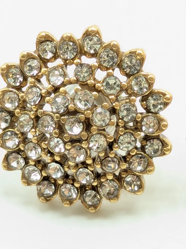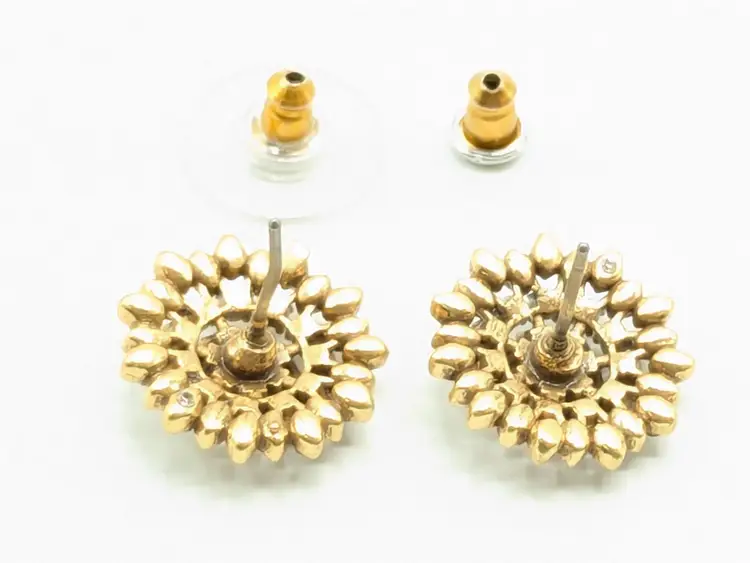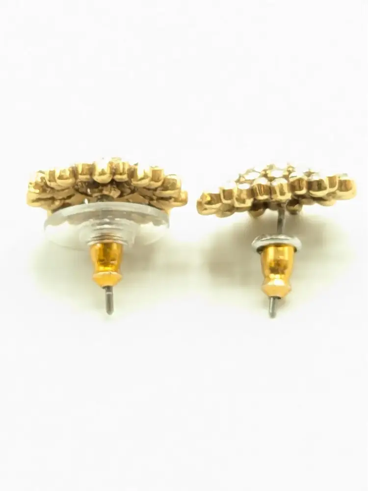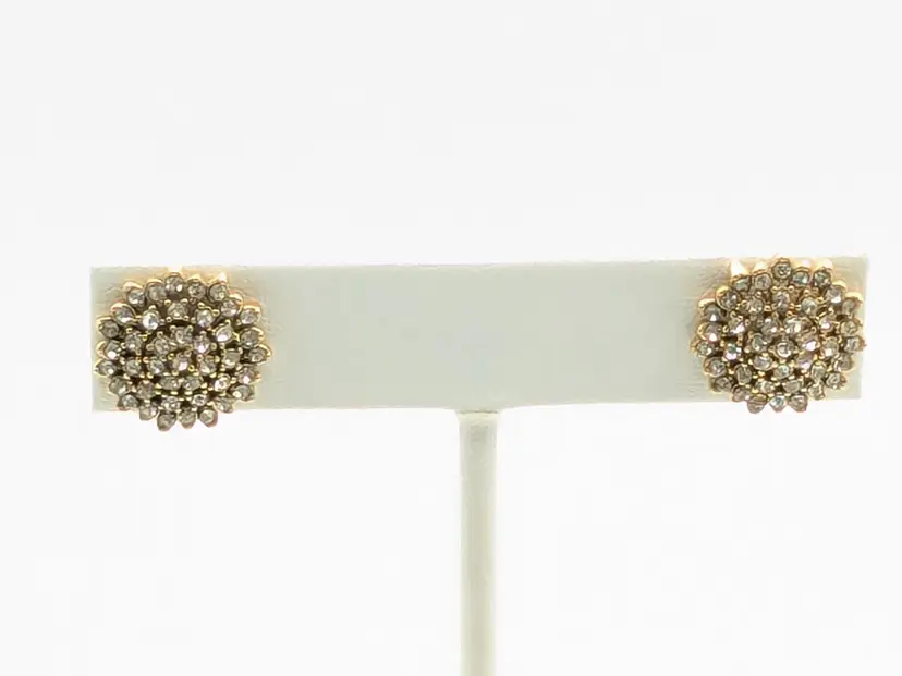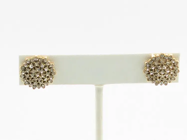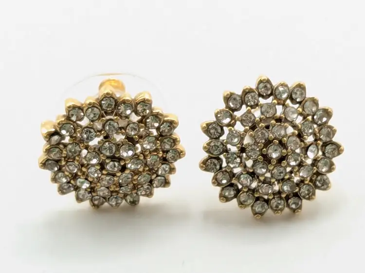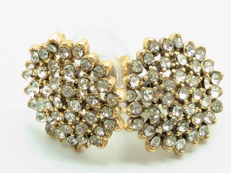 One of the posts are bent but still works as intended. Gold tone with sparkling rhinestone clusters. Perfect for adding a touch of glam to any outfit. Each earring measures approximately 1/2 inch in diameter. (EN1)