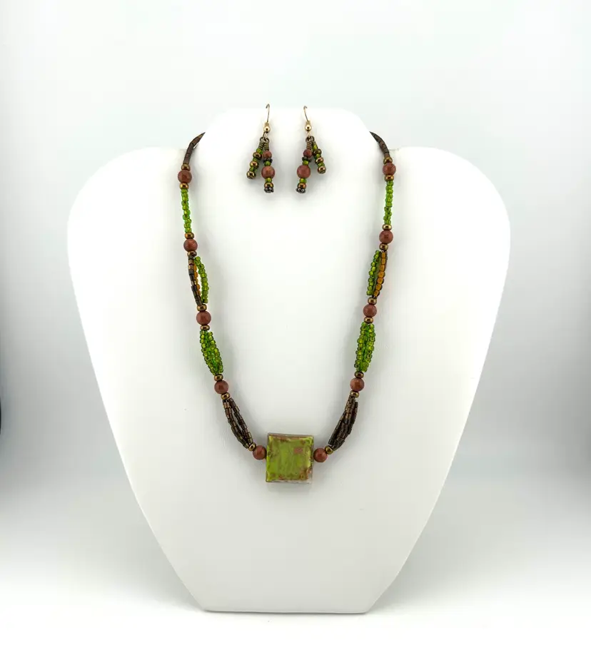 Glass pendant bead. Necklace is 13.5” Earrings are 1.5”