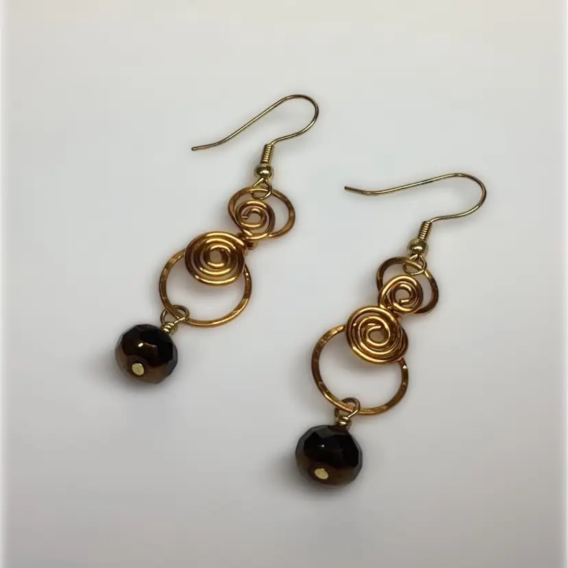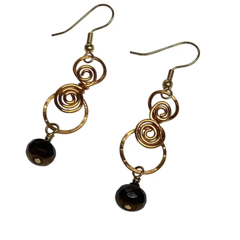 Fascinated by spirals? Me too! These wirework earrings are hand turned by me in my Lancaster PA studio. These are made from a warm golden hued wire and have gold tone ear hooks. The drop at the bottom is a black faceted Czech glass bead with copper highlights and the facets really reflect! The earring is approximately 2.25” in length. These are gorgeous! The neutral color really goes with a lot of skin tones and would make a great gift. #earrings #handmade #gold #black