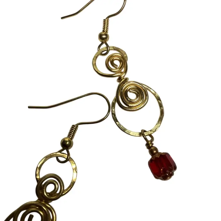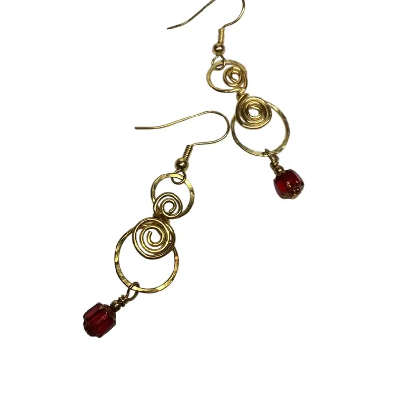 Fascinated by spirals? Me too! These wirework earrings are hand turned by me in my Lancaster PA studio. These are made from a golden hued wire and have gold tone ear hooks. The drop at the bottom is a red cathedral glass bead with golden highlights and the facets really reflect! The earring is approximately 2.25” in length. These are gorgeous! The neutral color really goes with a lot of skin tones and would make a great gift. #earrings #handmade #gold #red #wdesigns #spirals
