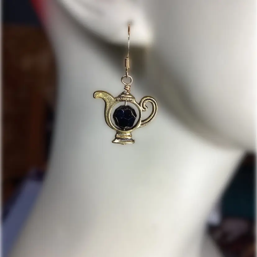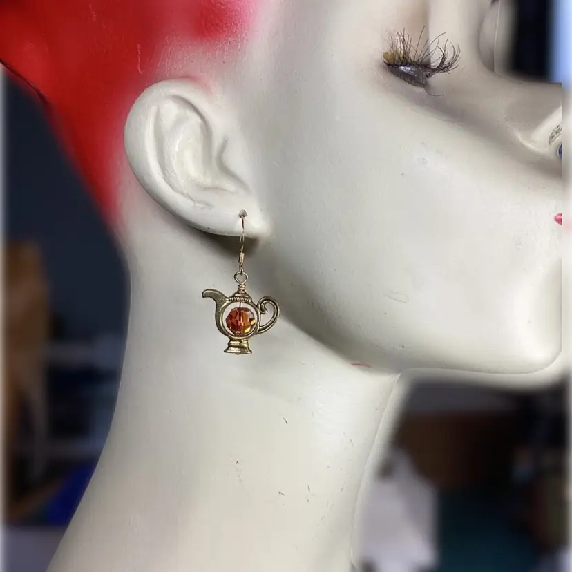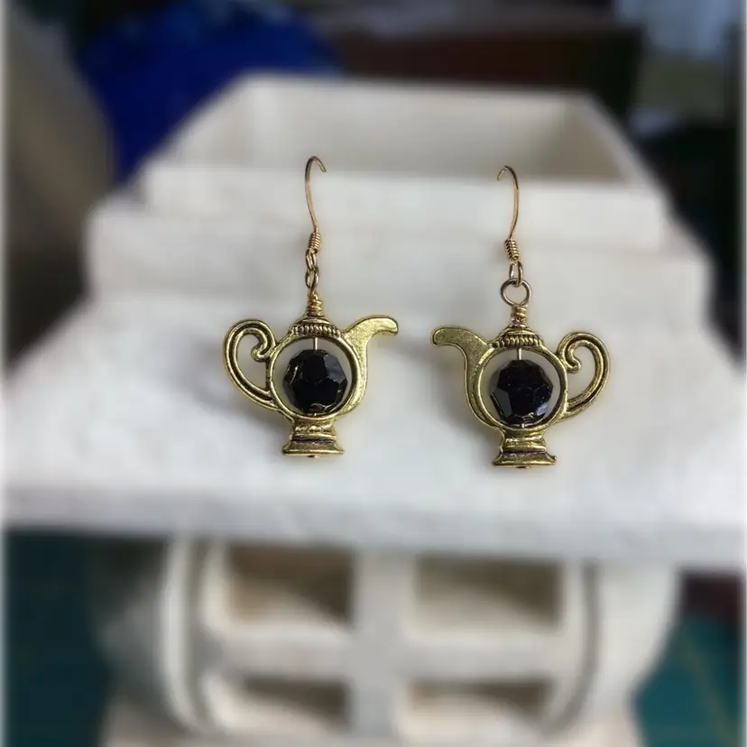 Goldtone teapot earrings featuring Swarovski crystals and pearls with gold tone ear hooks. Teapots measure .75” and total hang length of earring is approximately 1.5 inches. Tell the world you love tea in these stylish earrings. #tea #teapots #swarovski #earrings #gold