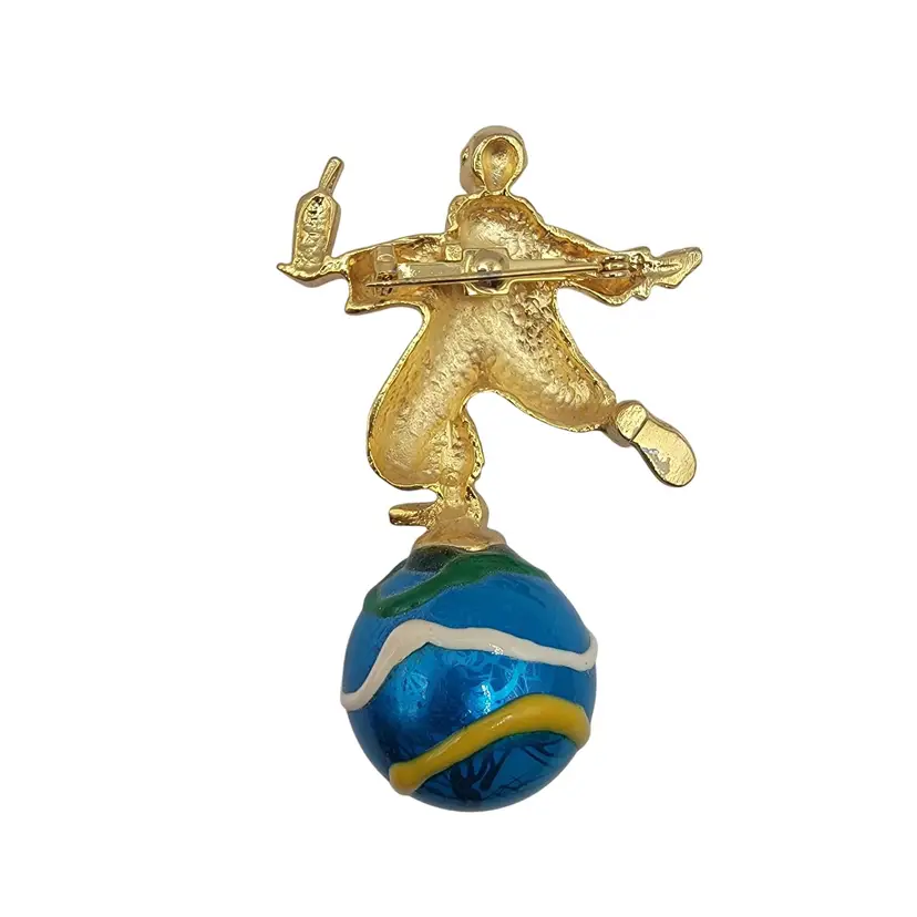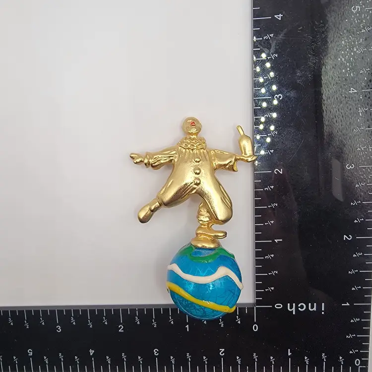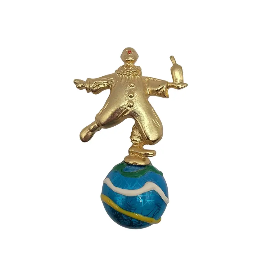 • Gold-tone metal construction • Hand-painted vibrant blue globe • Detailed clown design with red accents