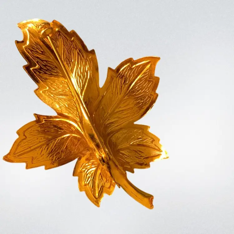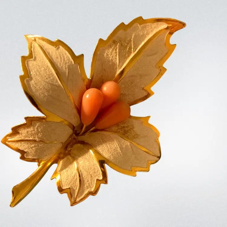 Gold Tone White Enameled Leaf Brooch With Pink Beads In Center