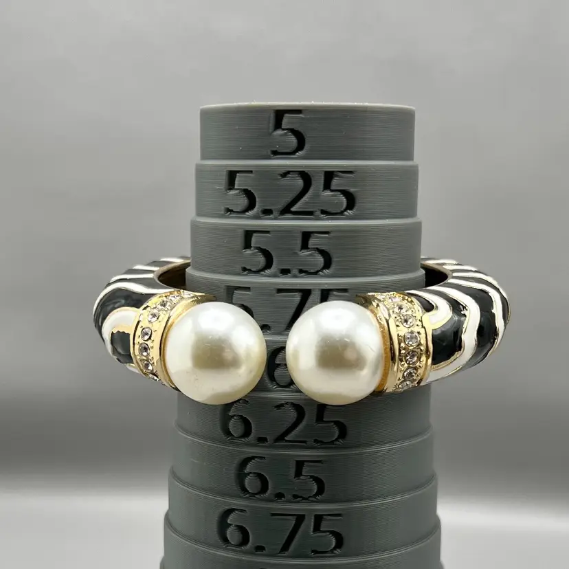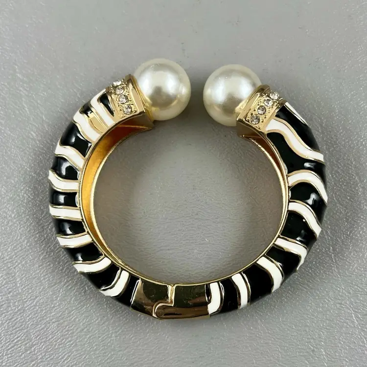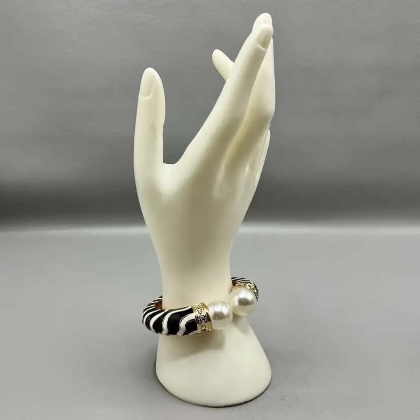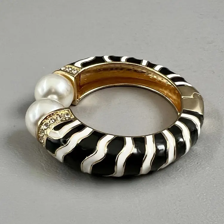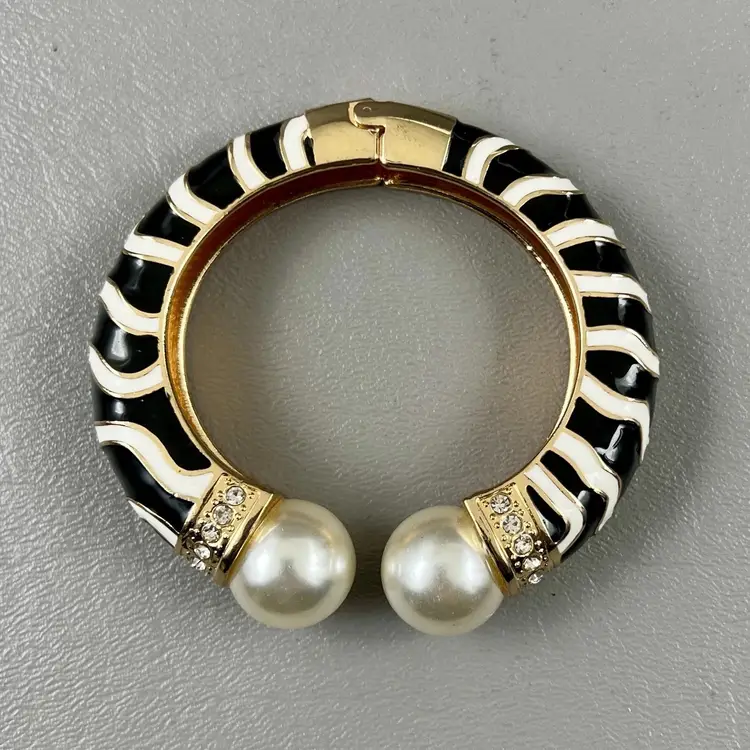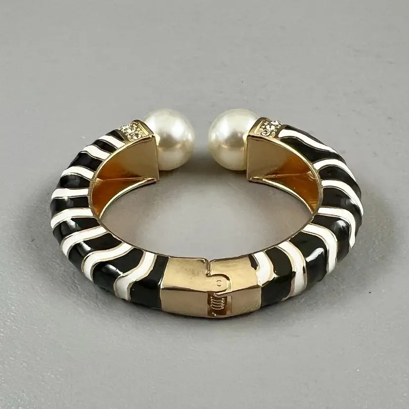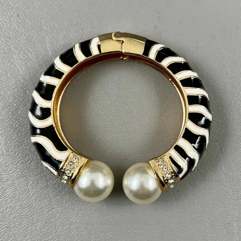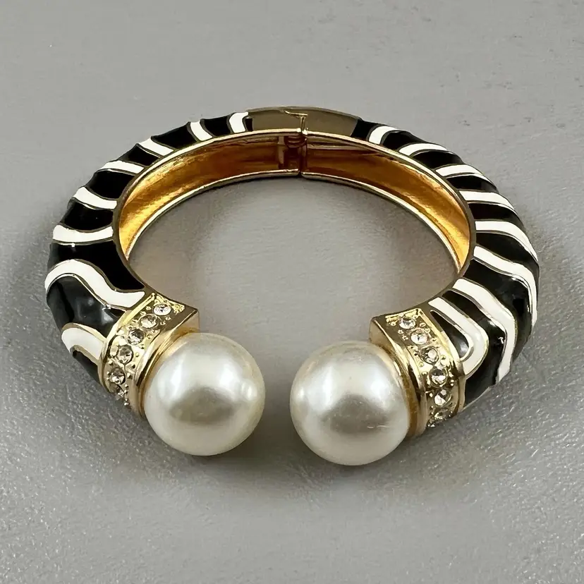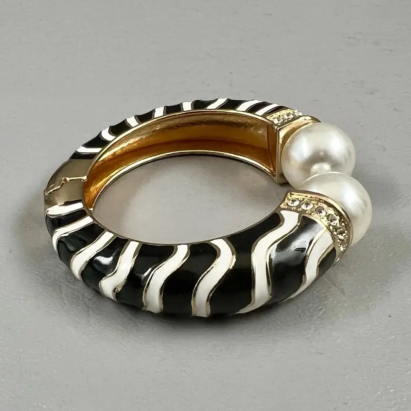 Gold Tone Zebra Enamel Hinged Bangle Bracelet Faux Pearl Rhinestone Statement 5.75" Black & White Enamel Pearl End Caps