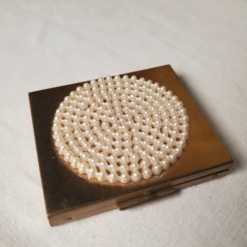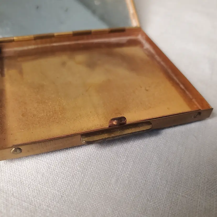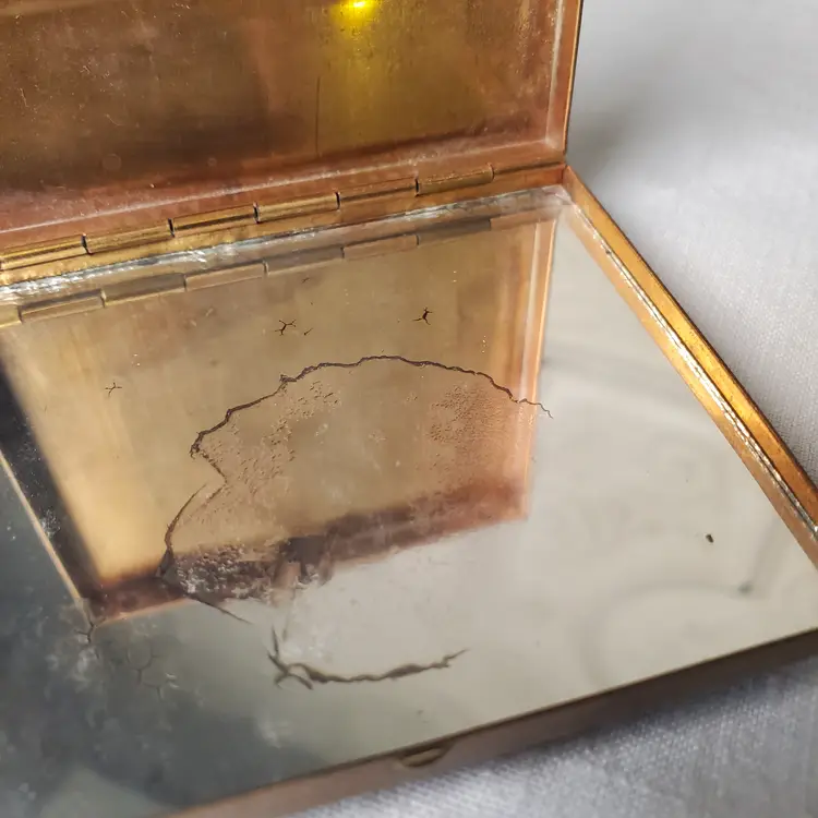 Sweet vintage compact that is in usable condition but would also be a fabulous display piece with it's old Hollywood charm. Has some wear on both compact itself and mirror. 2 3/4" x 2 3/8"