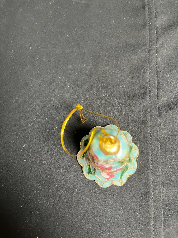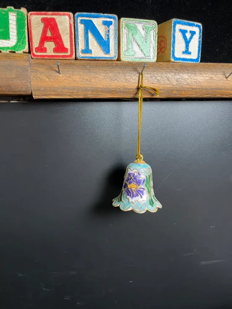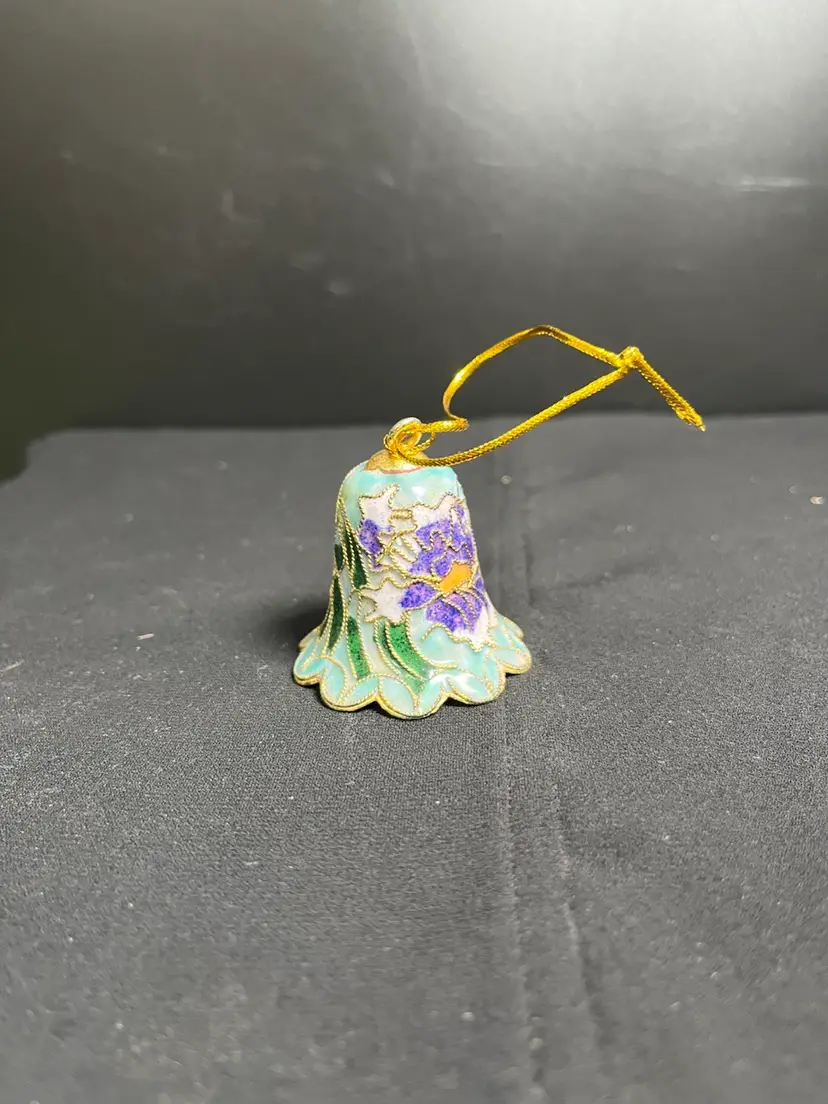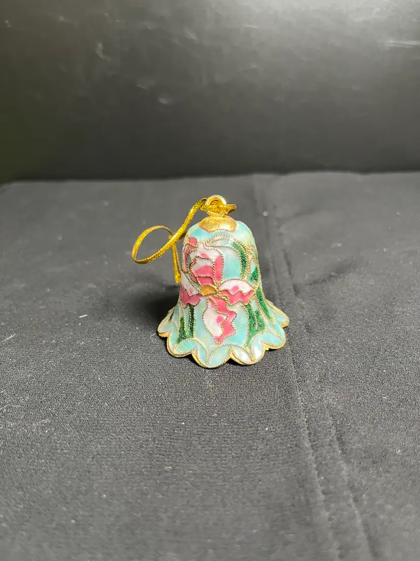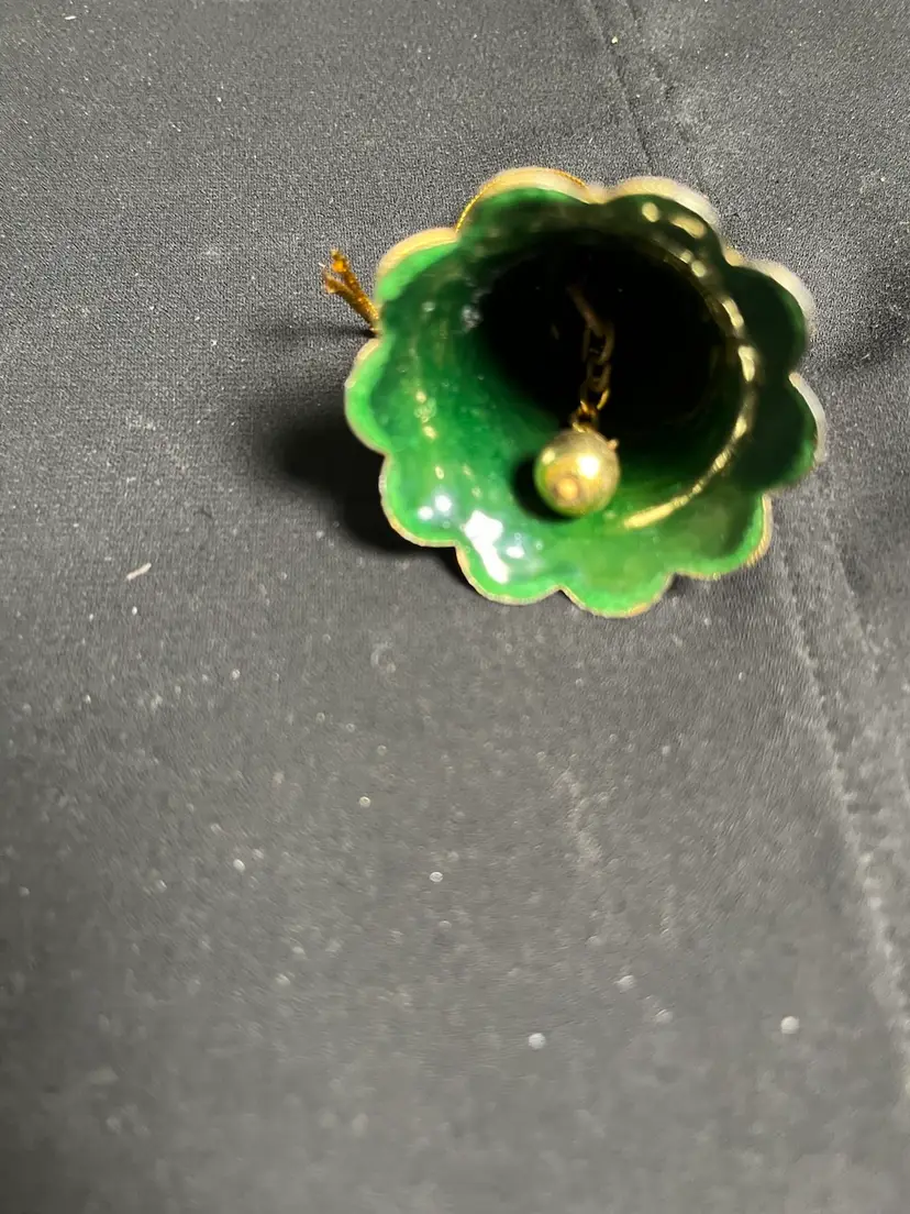 Inside of bell is Hunter Green enamel painted. Has clanger. No chips or cracks. Some wear on Gold tone on the hanger part. Is overall in great condition. Measures approx 2"H, 1.75" Diameter at base of bell, 1 Oz
