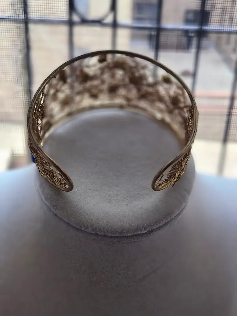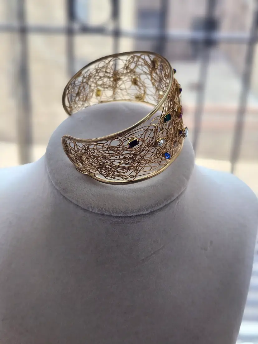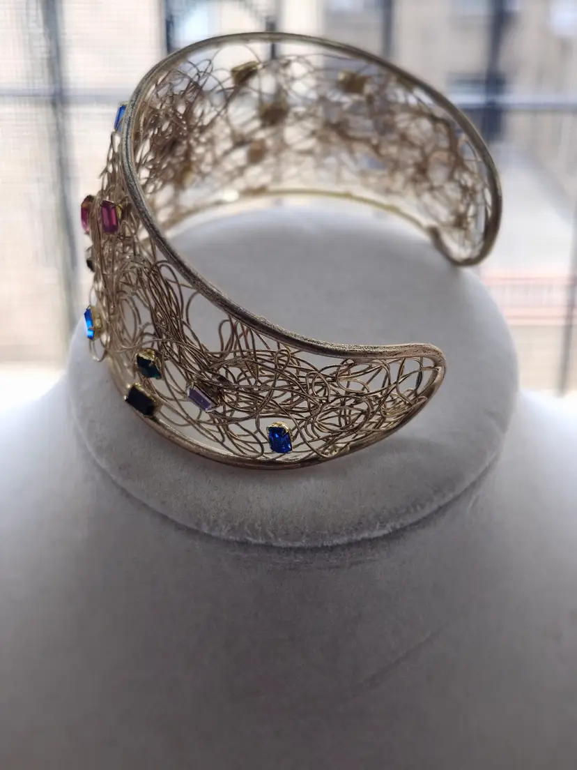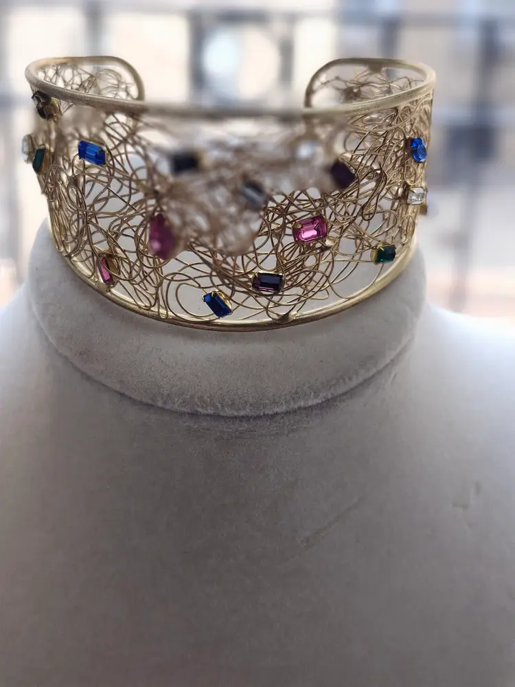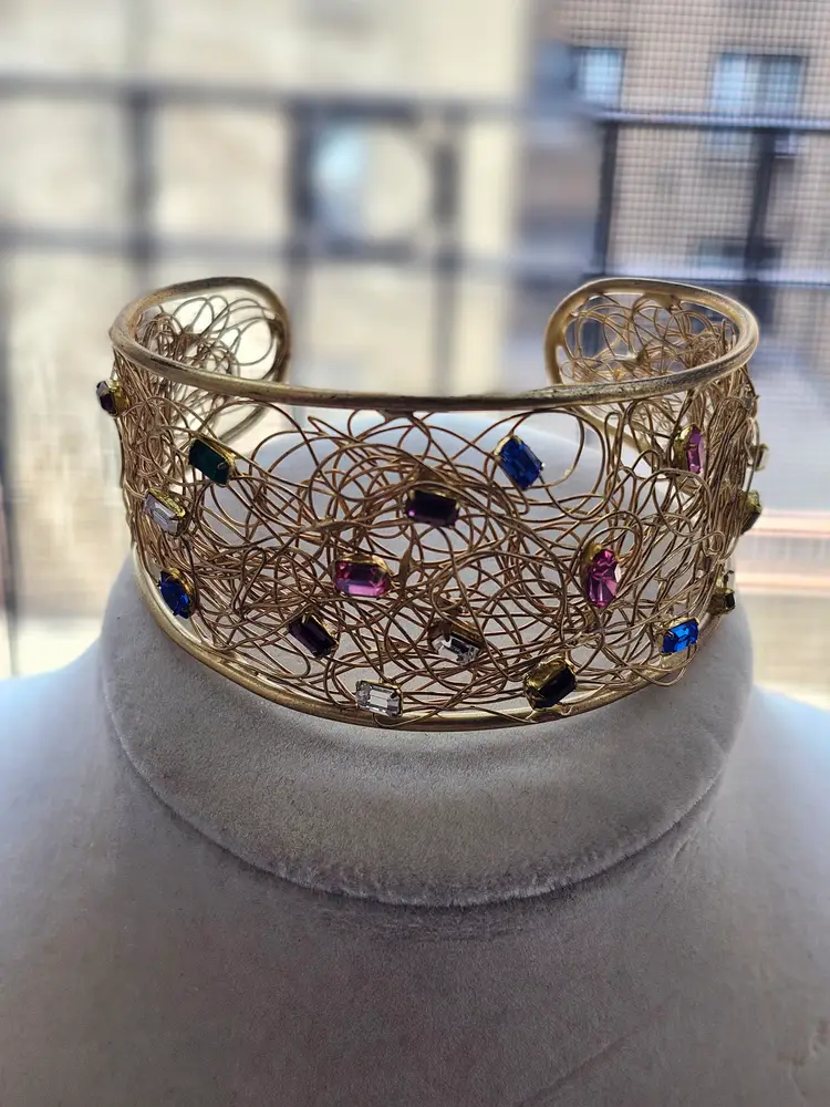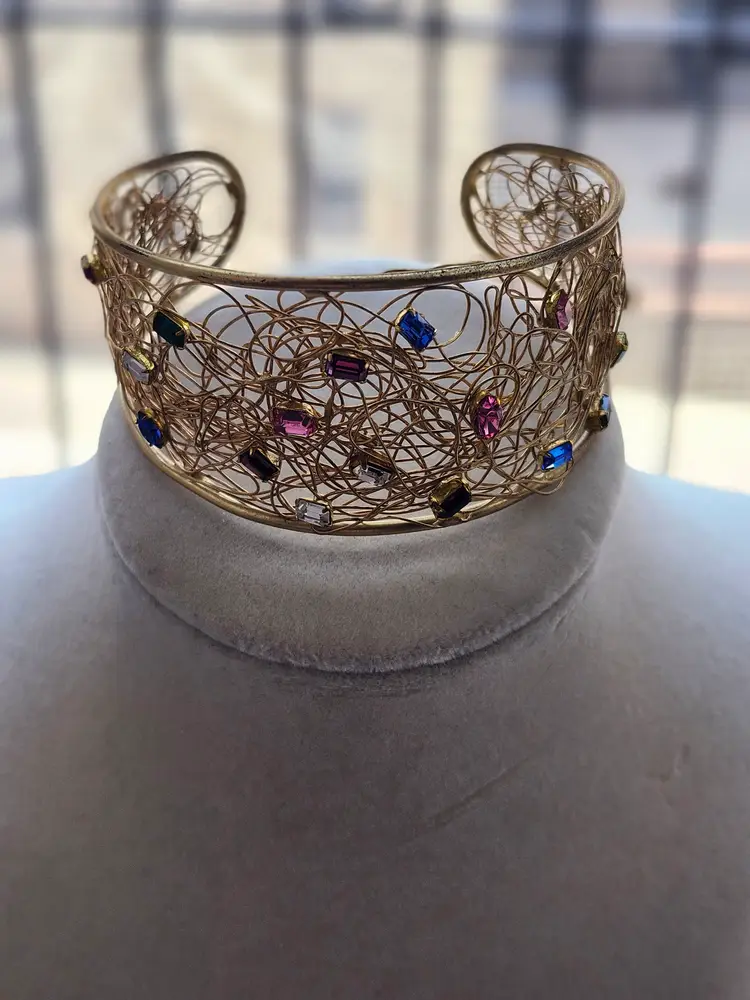 The image shows a gold-toned metal cuff bracelet adorned with multicolored Swarovski crystals. The bracelet has an open, cage-like design made of interwoven wires, with various rectangular and round crystals embedded within the structure. The crystals are in a variety of colors, including blue, pink, and clear. The bracelet is displayed on a white, rounded stand, likely a mannequin or display bust.
