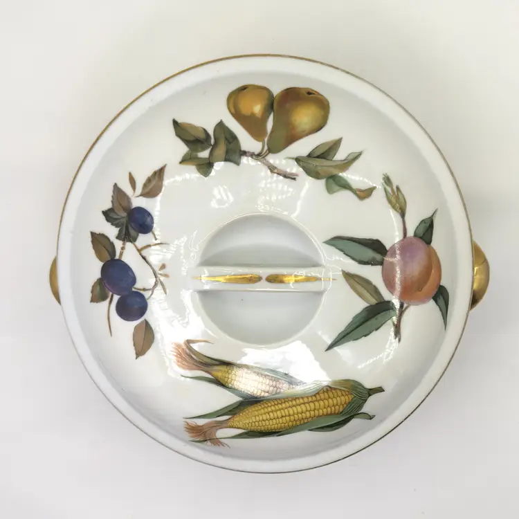 Bring English heritage to your table with this Royal Worcester covered casserole, crafted in England (c. 1950s–1970s). Features hand-painted fruit and corn, rich gold trim, and durable fireproof ceramic—perfect for oven-to-table serving or display.