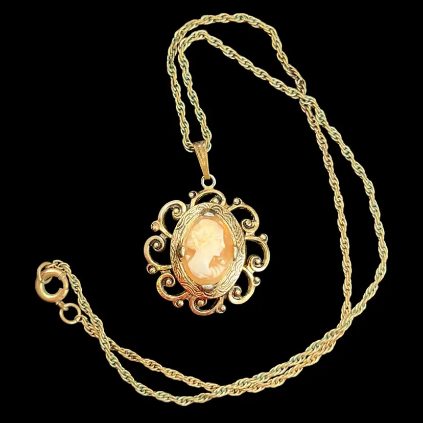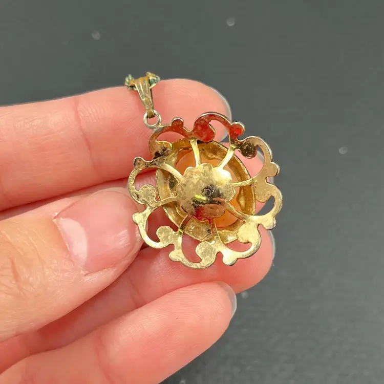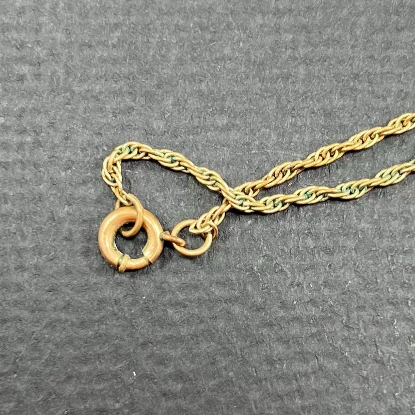 Approximately 7.5” hang. Pendant is approximately 1” in diameter. Please note there is some wear to finish and verdigris present in the chain/clasp.