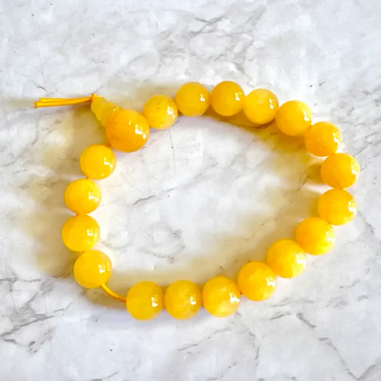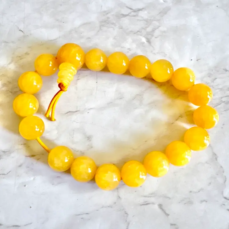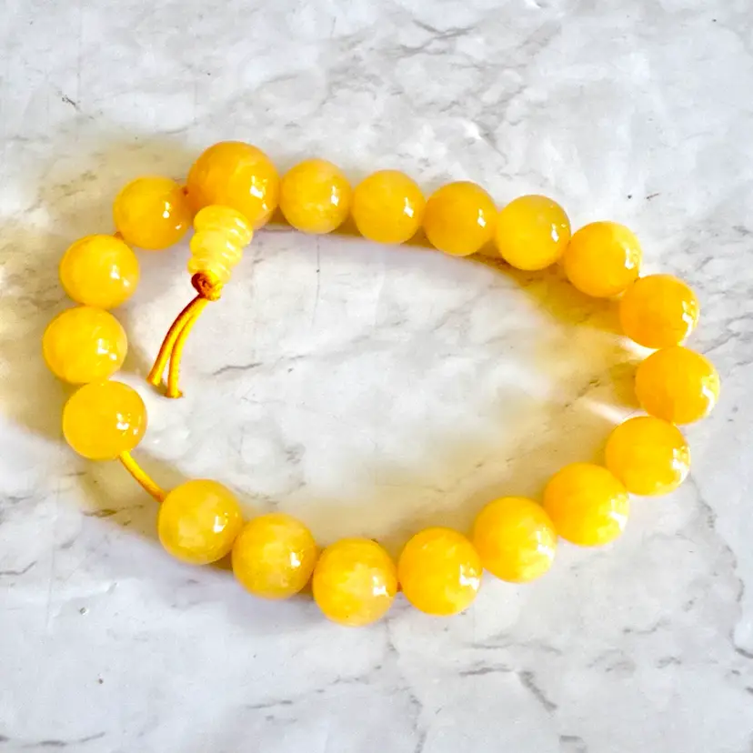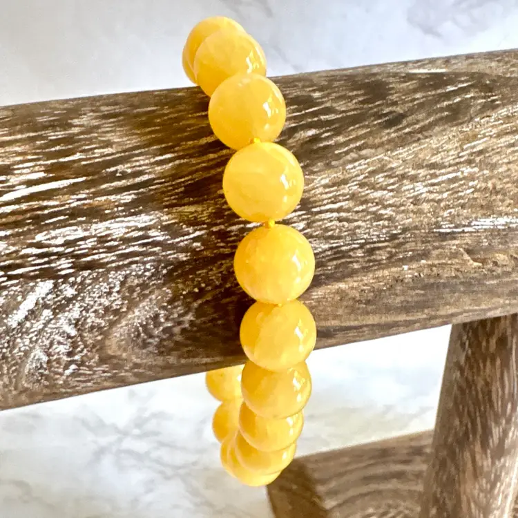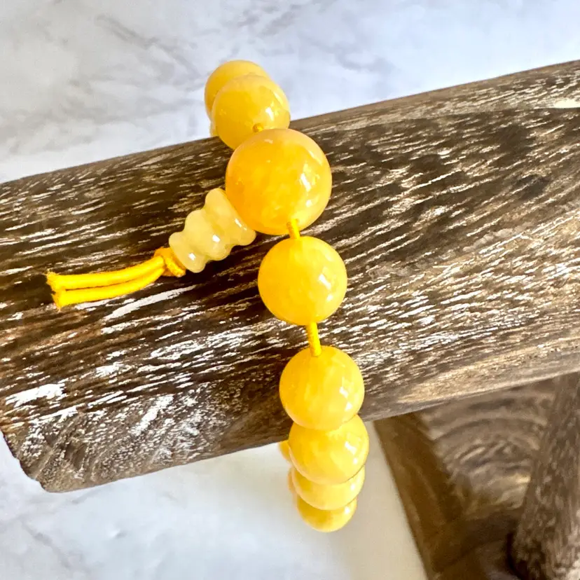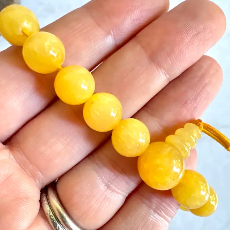 Good condition to the beads. Elastic is slightly stretched out and may need eventual replacement. About 7” long. This adjustable bracelet features smooth amber beads, showcasing a warm golden hue and reflecting Eastern cultural influences. Linked to vitality and protection, it’s perfect for stacking or gifting.