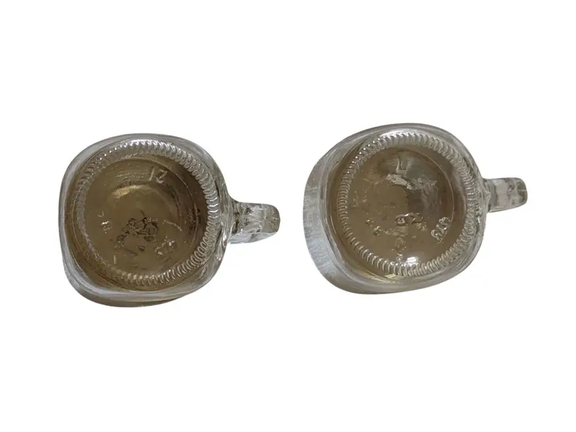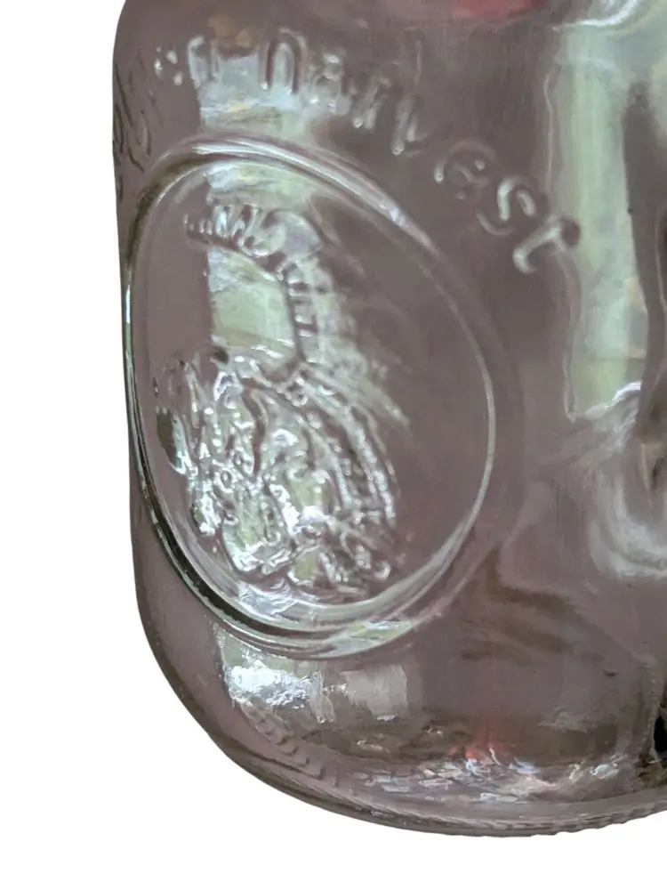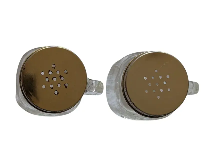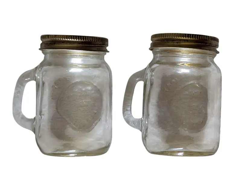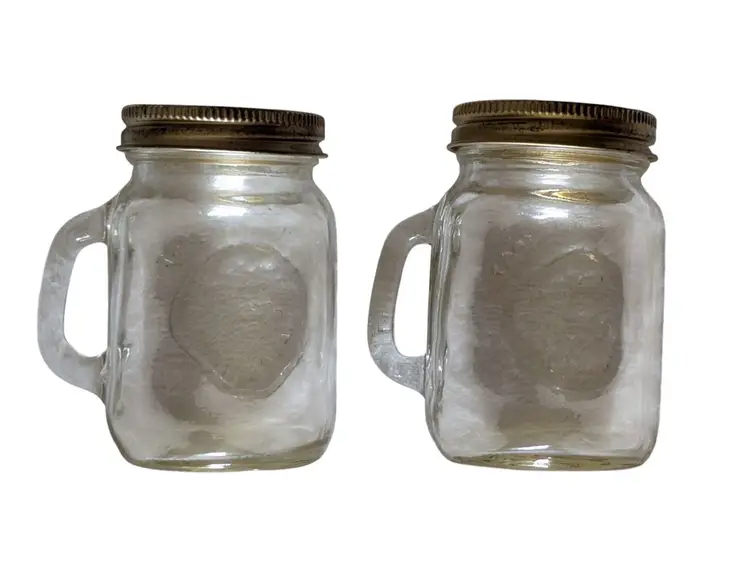 This Golden Harvest Mason Style Jar Salt and Pepper Shakers set includes two small square and round glass bottles with vintage anchor design metal lids. The shakers are in a country style with a clear color and a universal food compatibility. Made in the United States during the 1960s, this original set features a Golden Harvest pattern and is perfect for all occasions. Each shaker has a lid and is a unique addition to any kitchen or home decor collection.