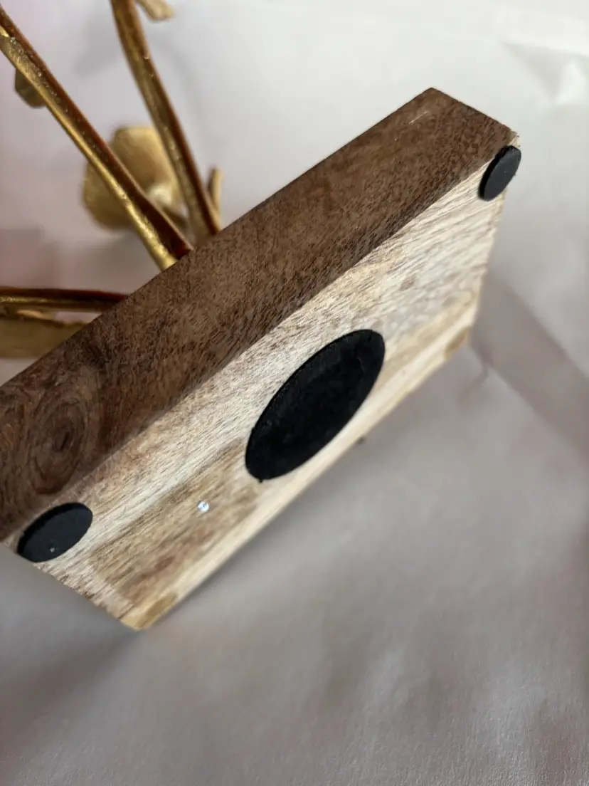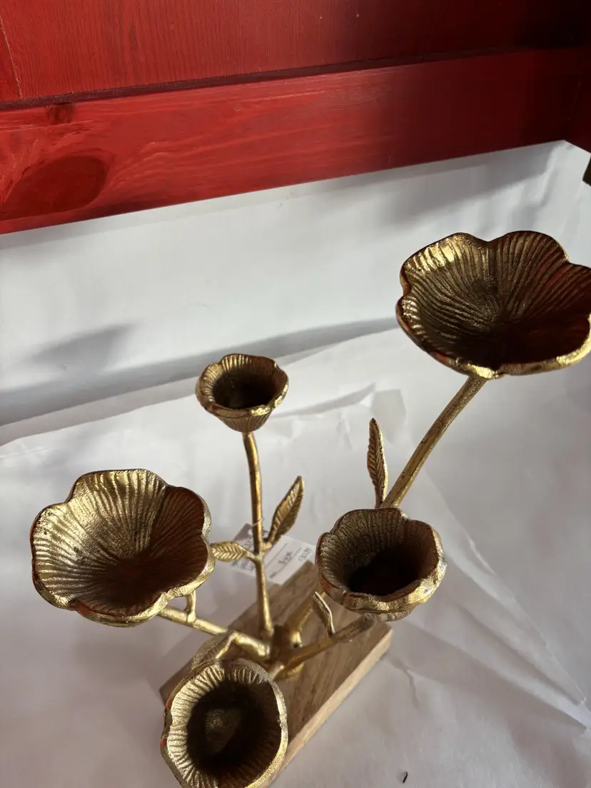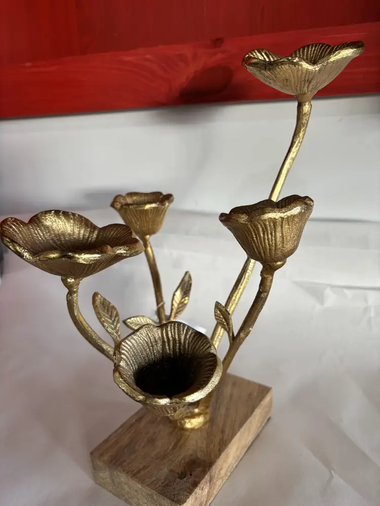 Golden Lotus decor on wood that holds candles. This would look amazing on any sun porch.