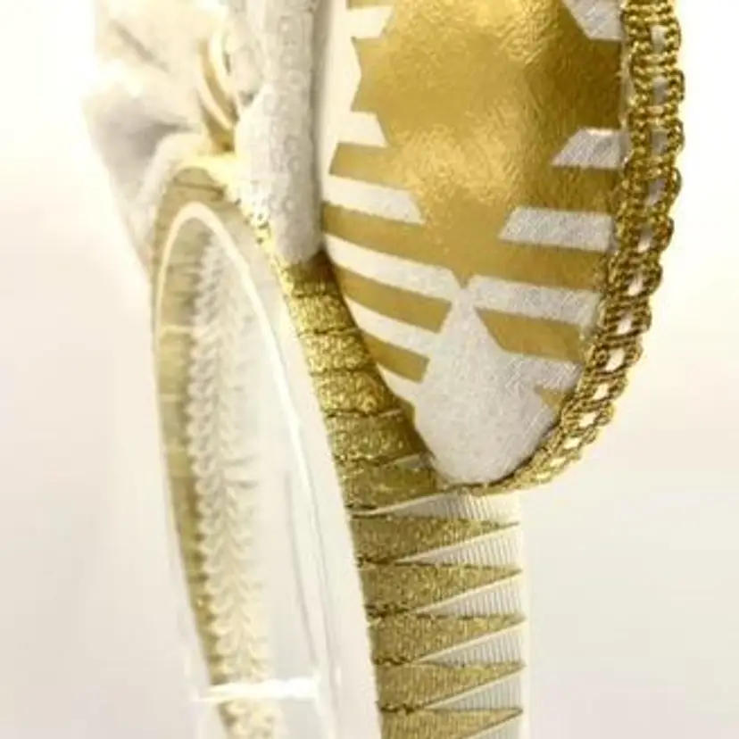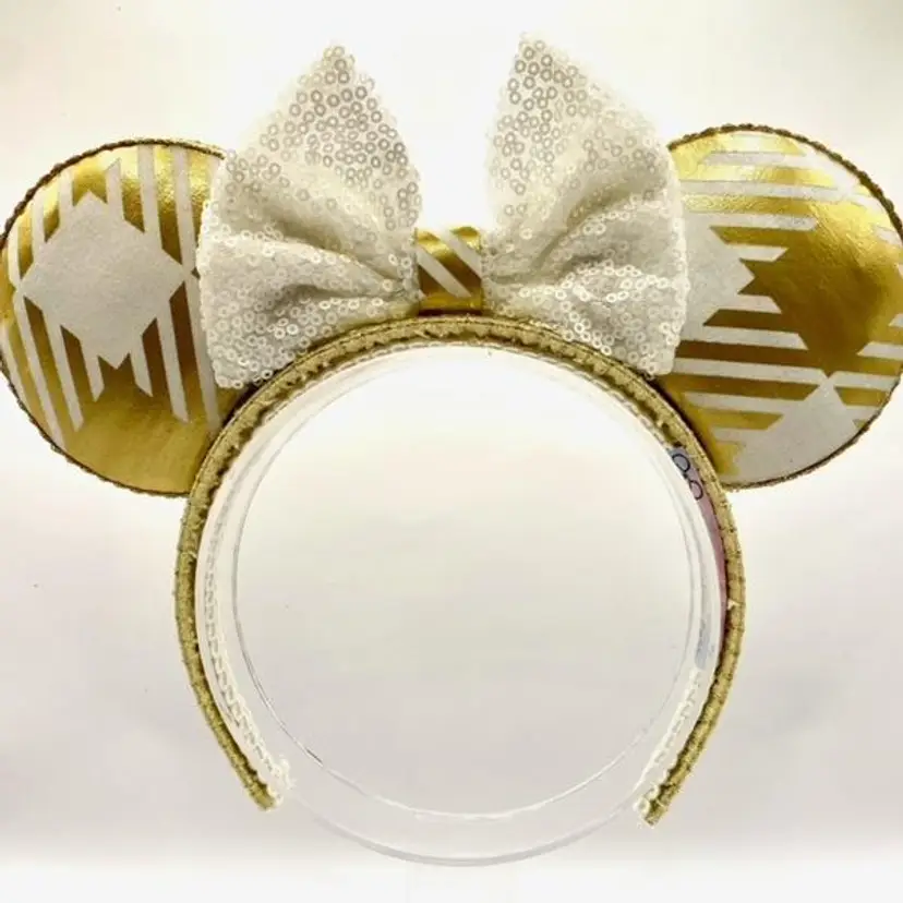 Here's your chance to outshine everyone with these fantastic golden ears! A oversized plaid pattern in white and gold set the stage for this look and each ear is finished with a golden brocade edge. The gold and white glittery chevron-woven headband and bright white sequin bow make these ears the gold standard!