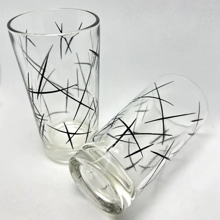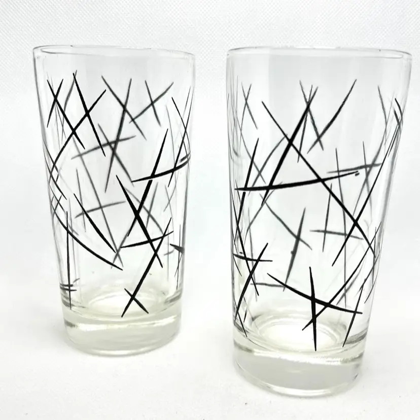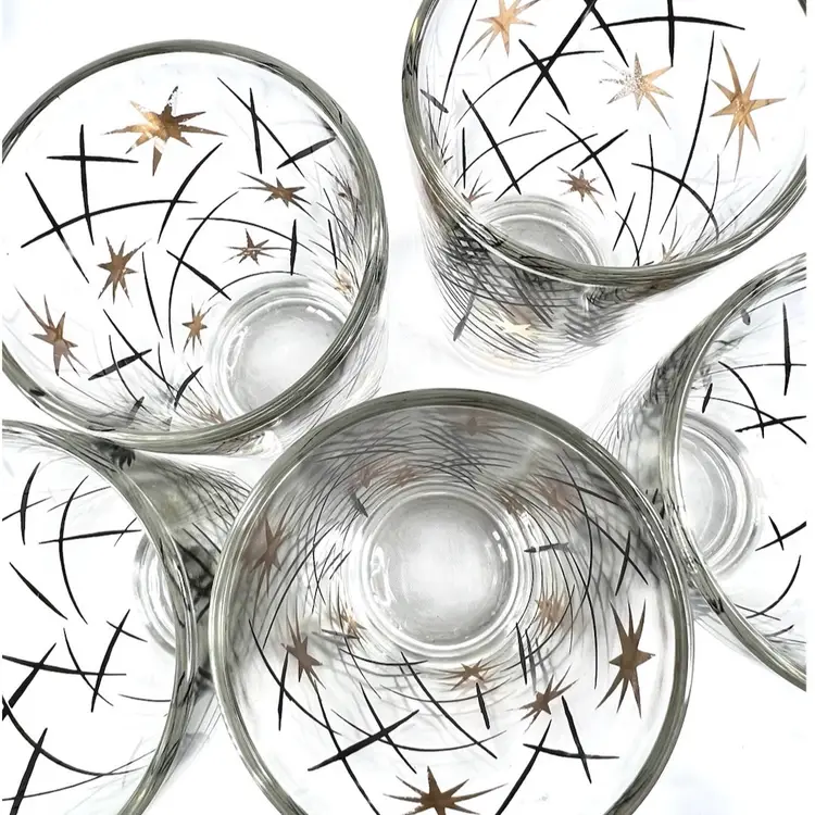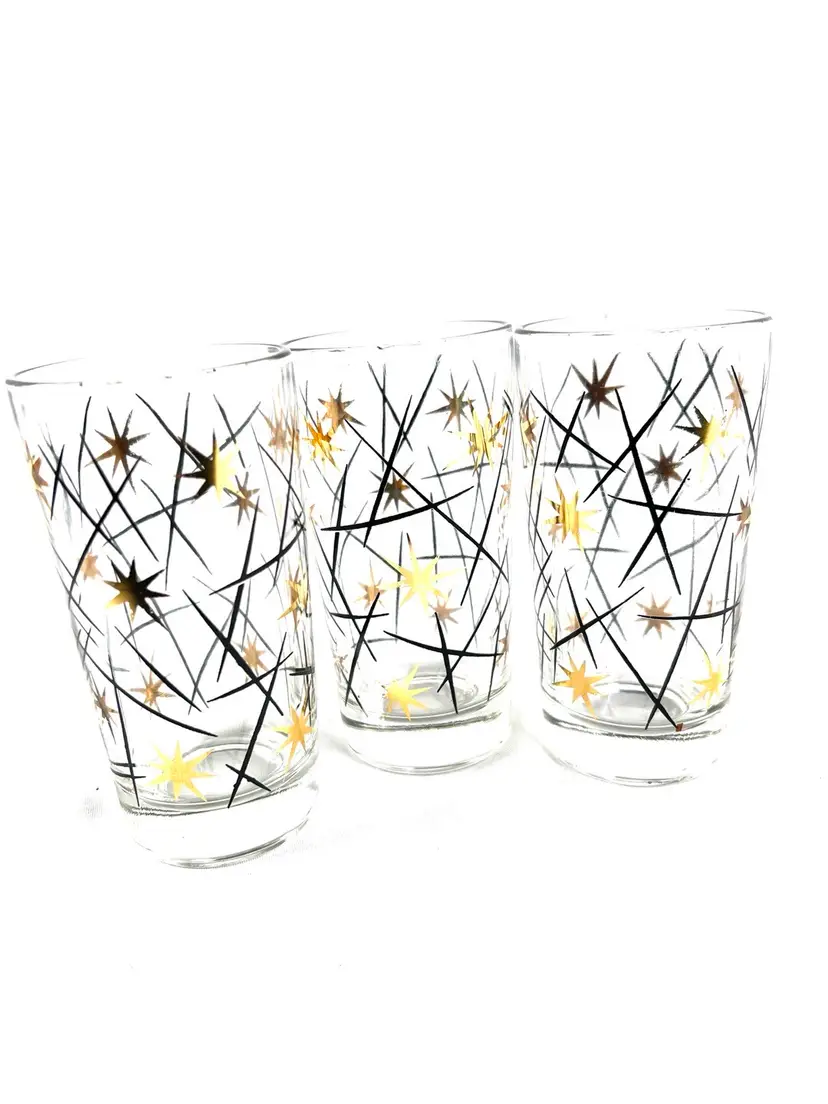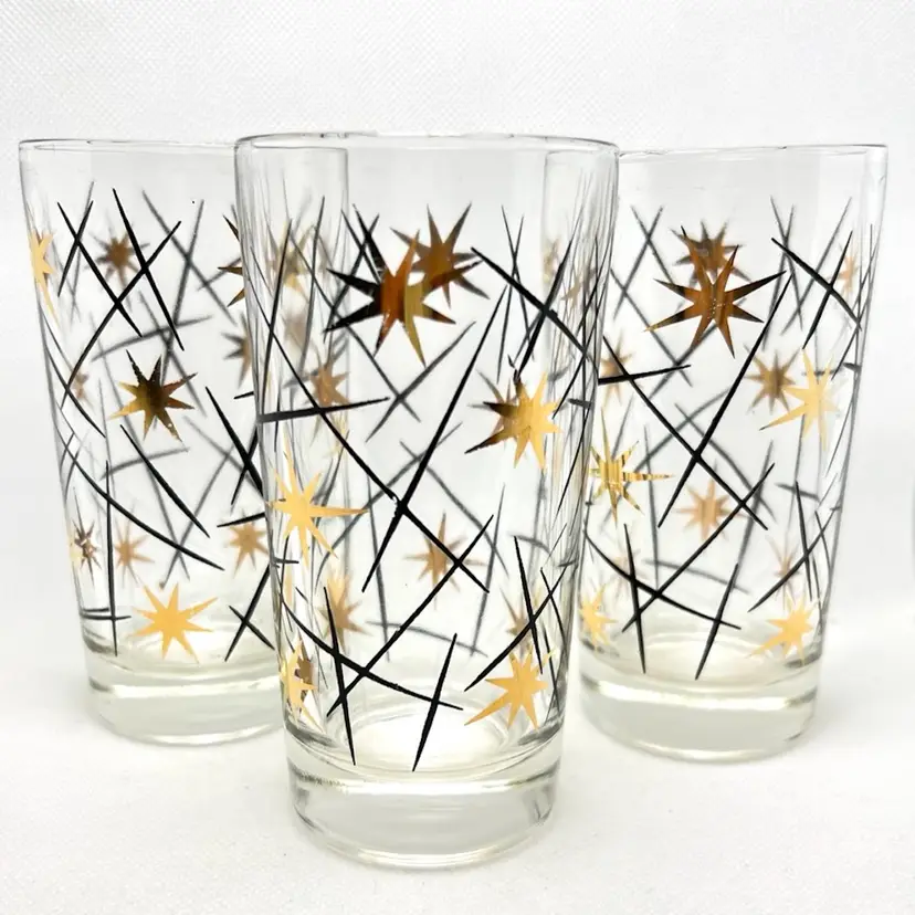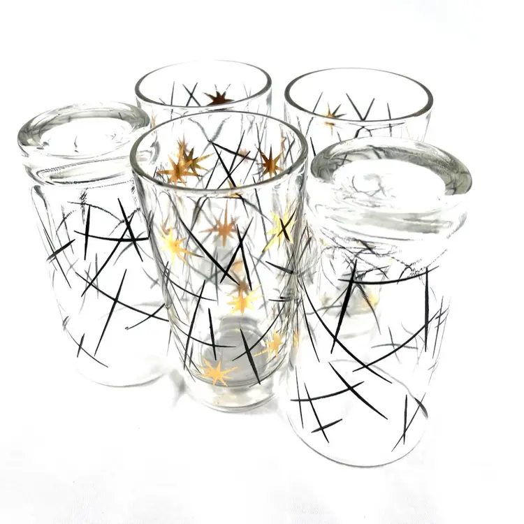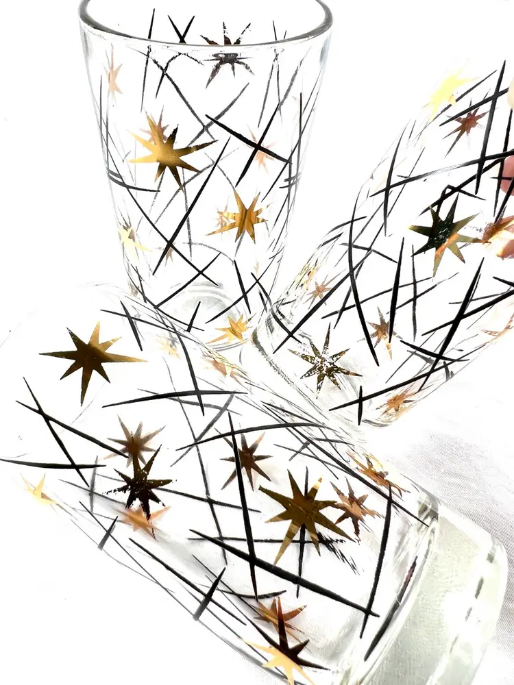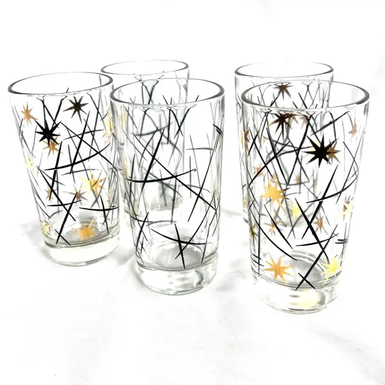 💫 Set 5 💫 5” tall tapered tumblers ⭐️ 3 with gold stars and black “comet” trails 💫 2 with only the black “comet” trails ⚖️Weigh ~3-1/2 lbs total. 💫 Great condition: some gold loss on stars (see photos) No manufacturer marks- perhaps Libbey glass?