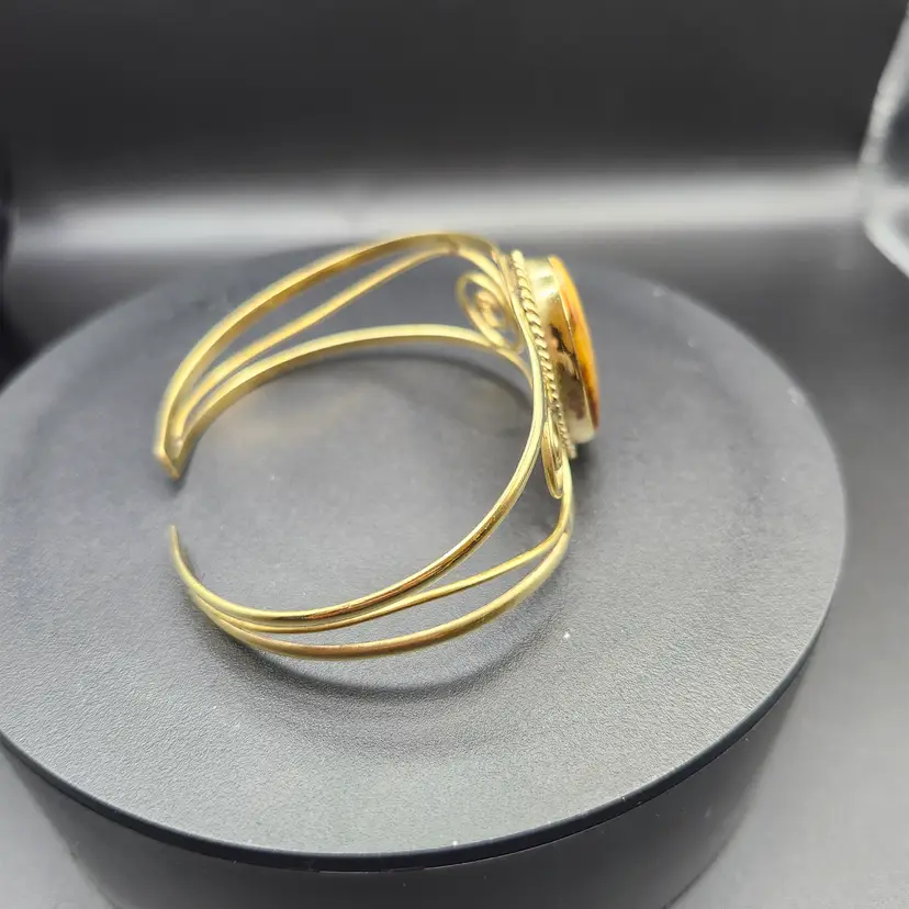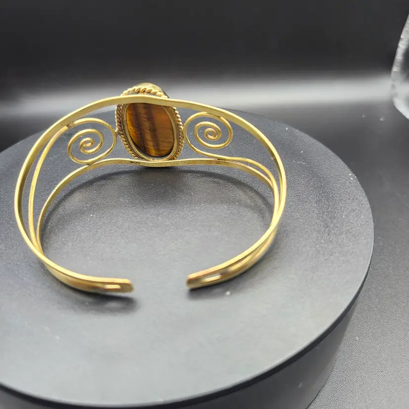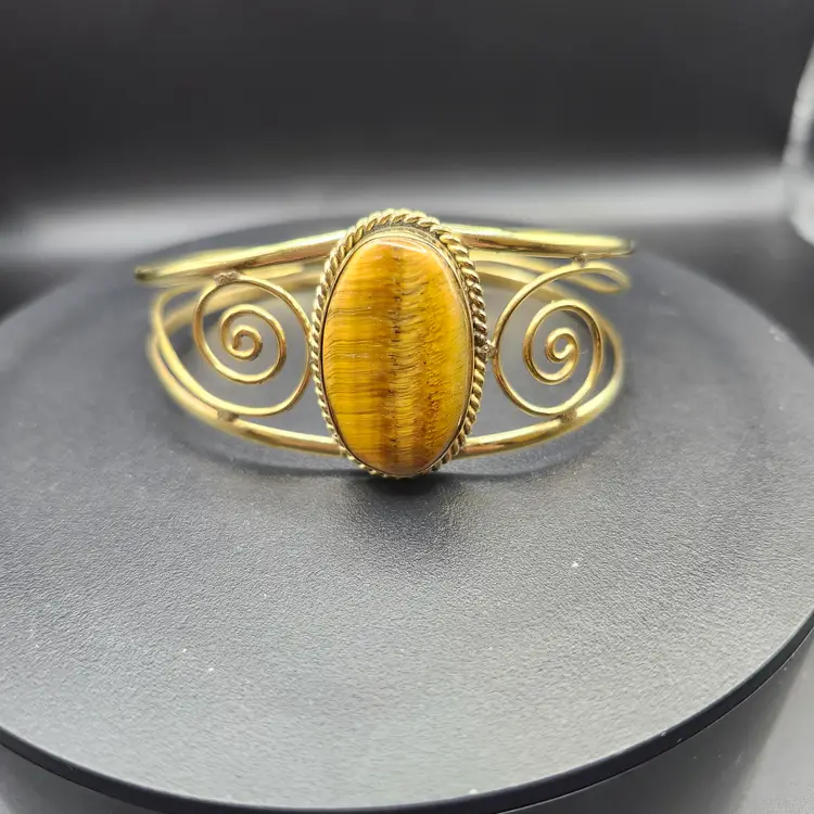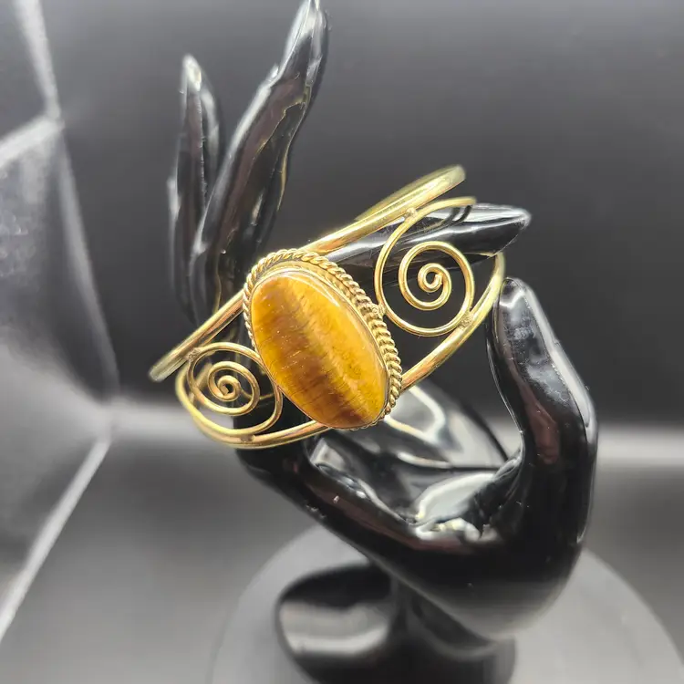 Embrace the earthy elegance of the Golden Swirl Tiger's Eye Cuff Bracelet. Featuring a captivating tiger's eye stone at its center, this bracelet is framed by intricate golden swirls that add a touch of whimsy. Perfect for adding a natural yet sophisticated flair to any outfit, whether you're dressing up or keeping it casual.