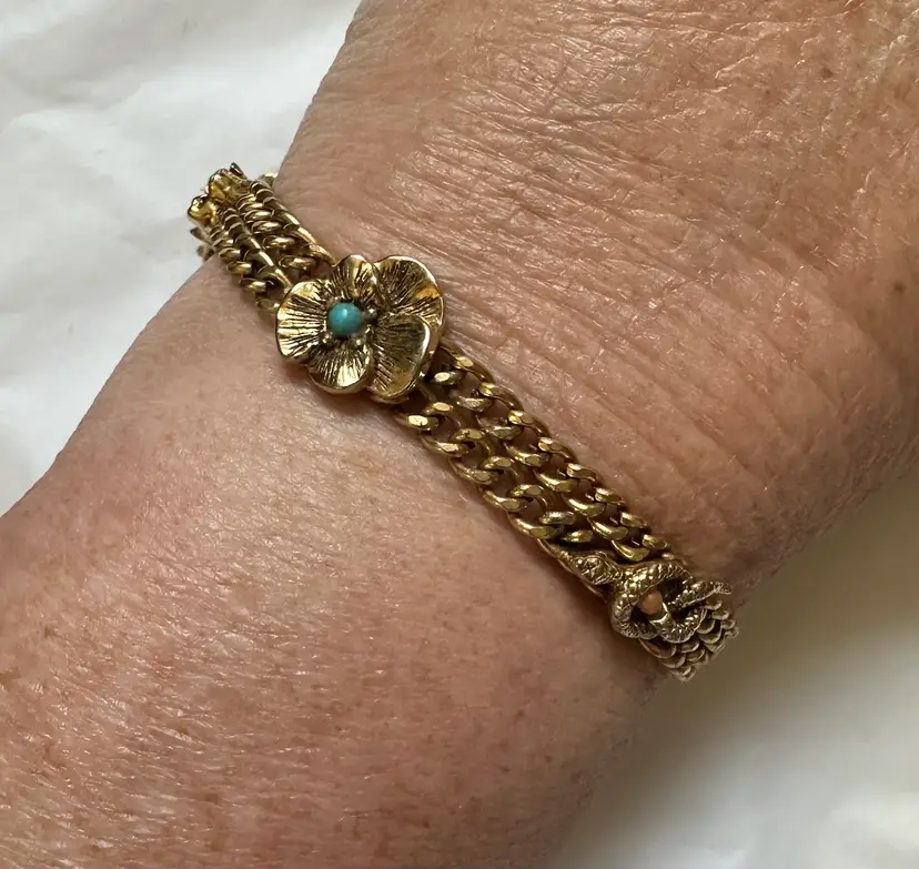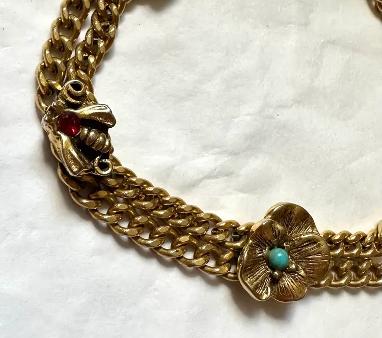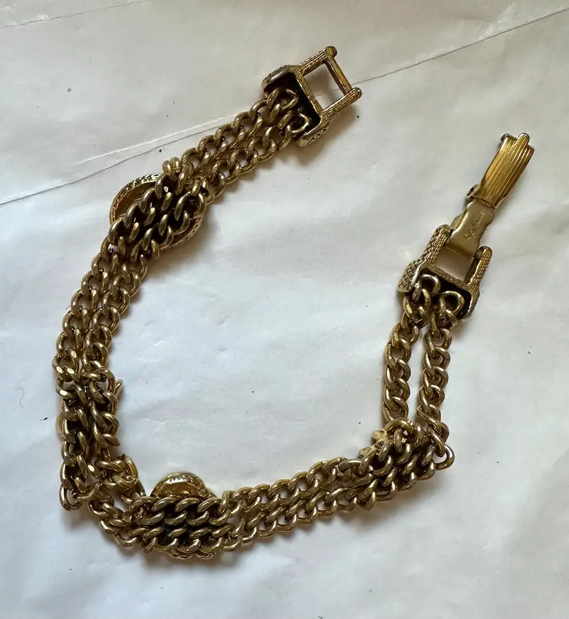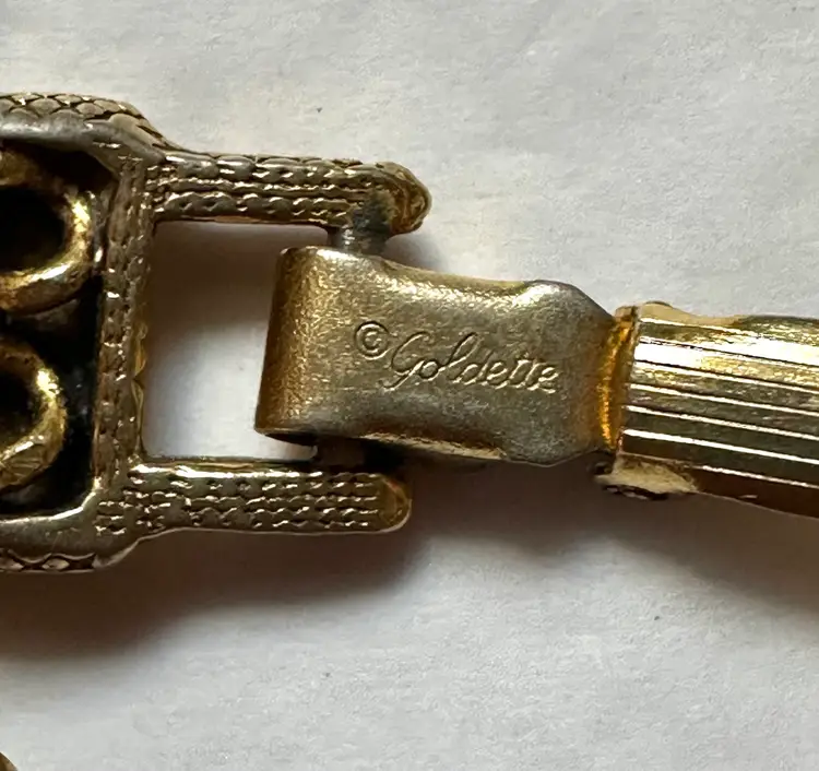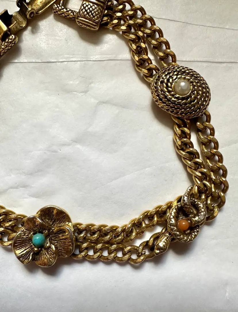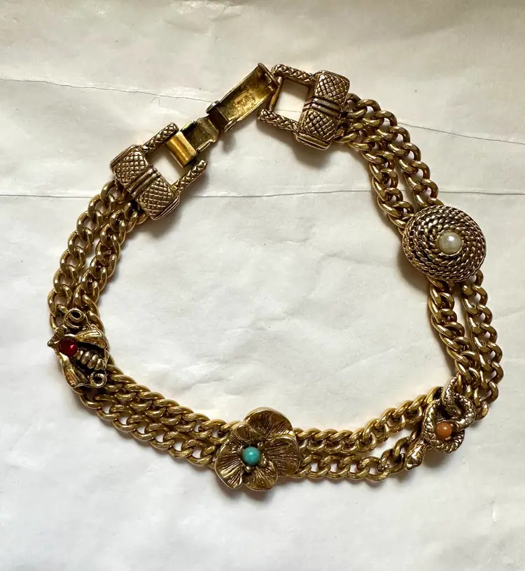 Vintage Goldette Victorian revival style bracelet with 4 slide charms which are stationary. It measures 7” x 1/2”. Excellent condition.