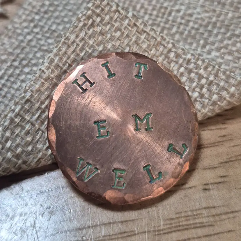 Our hand-hammered copper golf ball marker, with green lettering is crafted from high-quality copper, each one meticulously shaped to create a unique, textured finish that shines on the green. Personalize yours with custom initials engraved on the back, making it a distinctive accessory or an ideal gift for golfers. Durable and brimming with rustic charm, these markers reflect the passion and pride of our Midwest roots. Mark your spot with "Hit em Well" and swing with confidence! Size is 1.25" diameter and 1/8" thick.