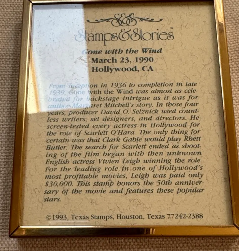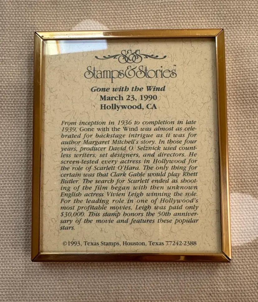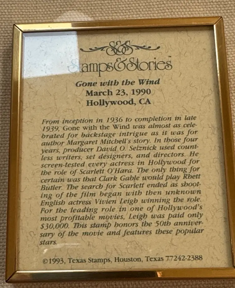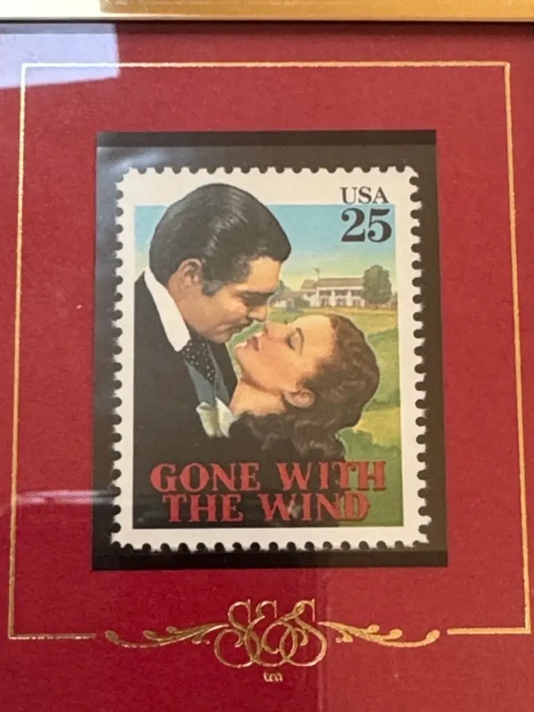 Framed art featuring a Gone With The Wind stamp. Elegant gold frame with red matting. framed Gone with the Wind commemorative stamp from 1990. Product Type: Movie memorabilia, featuring a 25-cent postage stamp depicting Clark Gable and Vivien Leigh. Features: The stamp is mounted in a double-matted frame, brass-colored, and was part of a series honoring classic Hollywood films. Historical Context: The stamps were dedicated in Hollywood on March 23, 1990, to honor films from Hollywood's golden era. 3 1/8” by 2 5/8” Excellent condition (25534262)