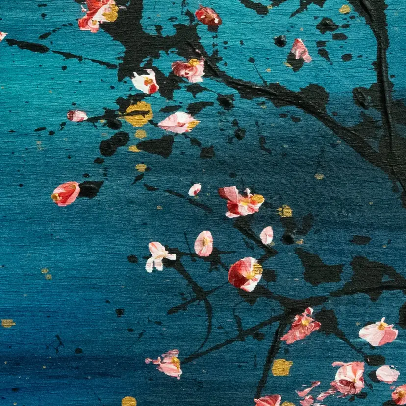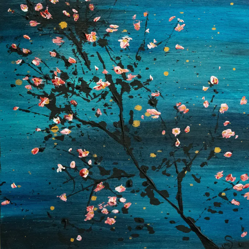 Blossoms - their beauty is fleeting. One strong gust, and the blossoms are gone. Gone with the wind. Acrylic on wood, approx. 21.5 x 21.5cm, black edge, d-rings and wire at back for hanging Located in Canada