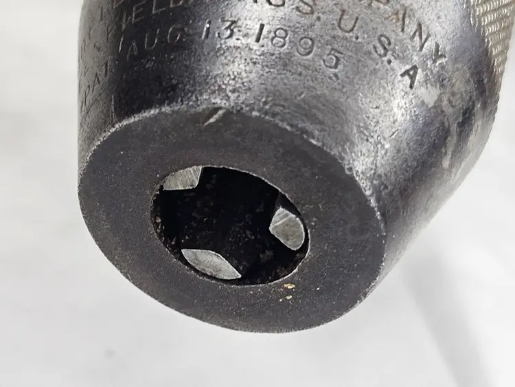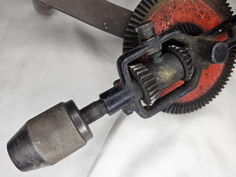 I believe this is a No. 6 or No. 245 based on the G-P catalogs. One model had nickel plating, the other didn't. This drill has two speeds that can be changed by adjusting the shifter knob to switch between "fast" and "slow" for drilling in different materials. 3-jaw chuck takes round shank bits 0-1/2".