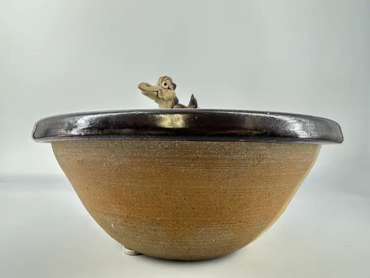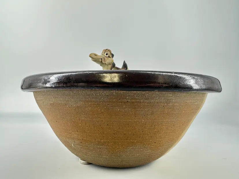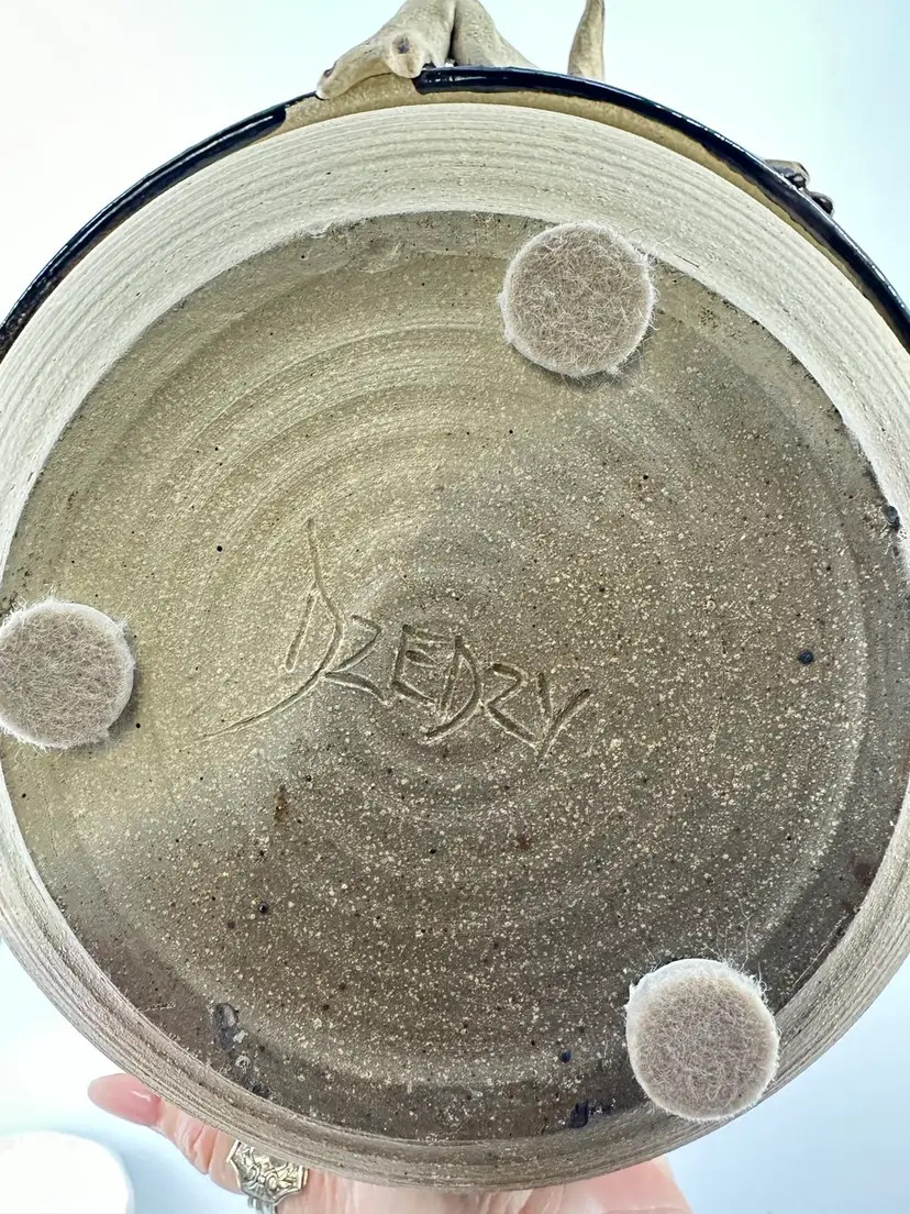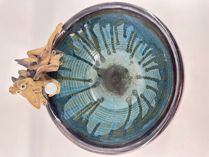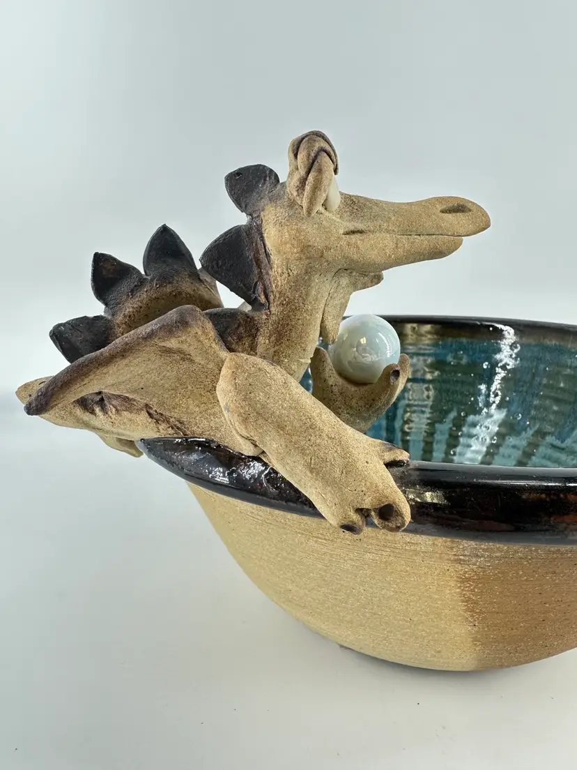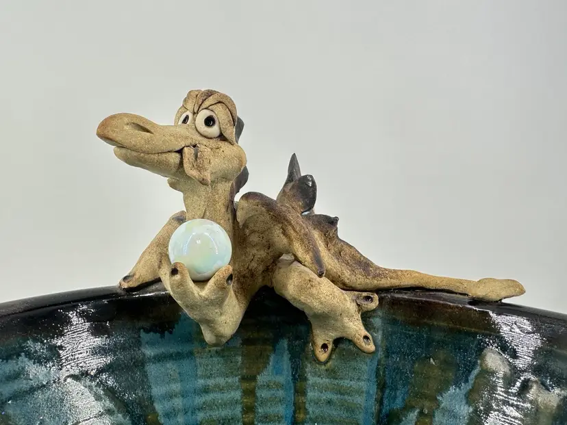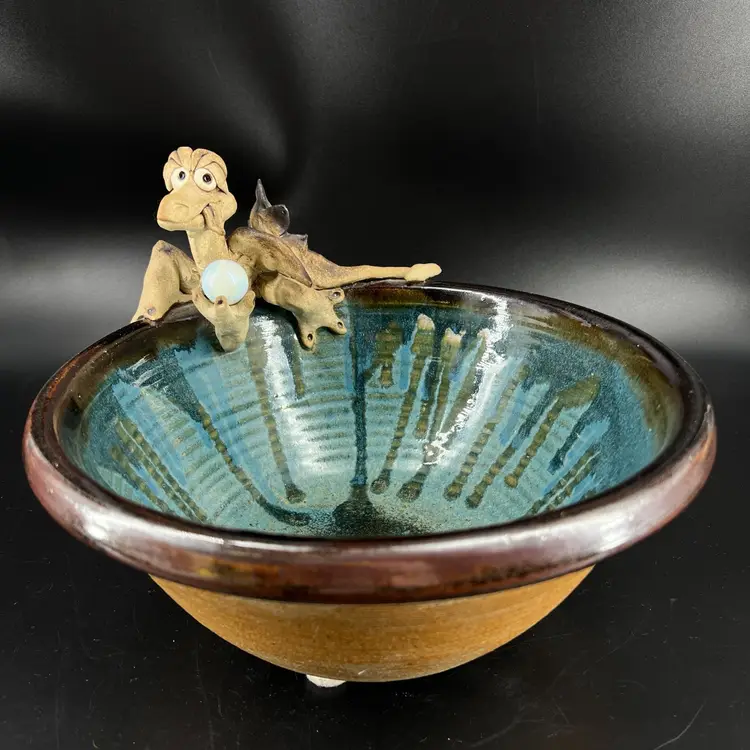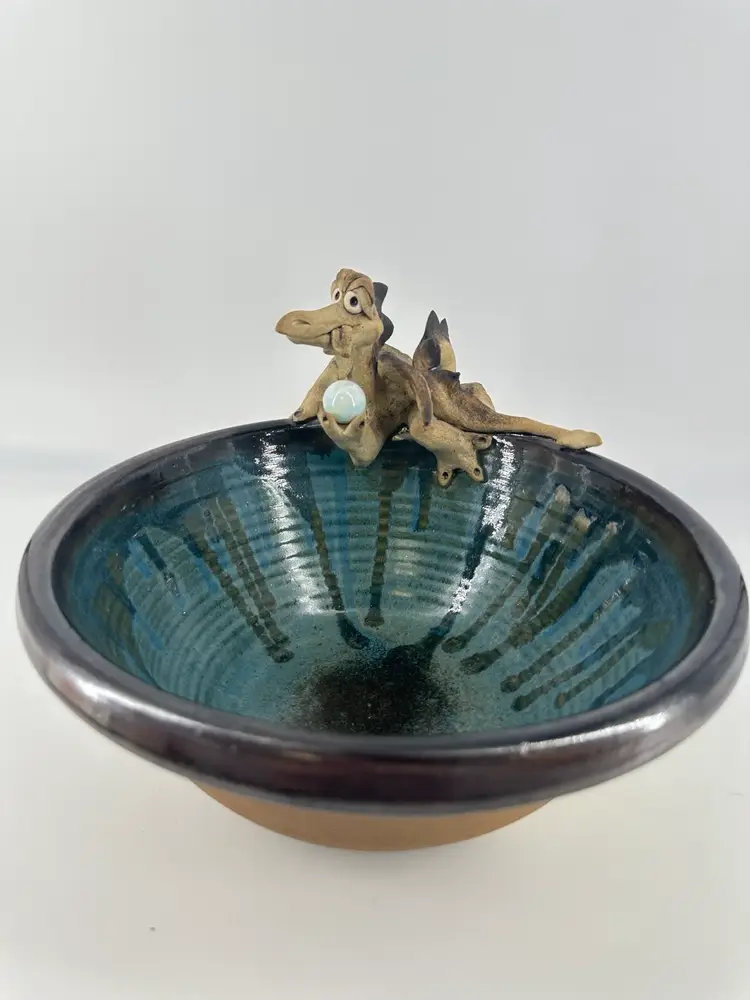 This large bowl measures approximately 4” tall and 10” wide. It features a dragon holding a magic marble. It has a drippy glaze effect on the inside. The dragon and the underside of the bowl are unglazed. There are no chips or cracks. It is signed Dredzy.