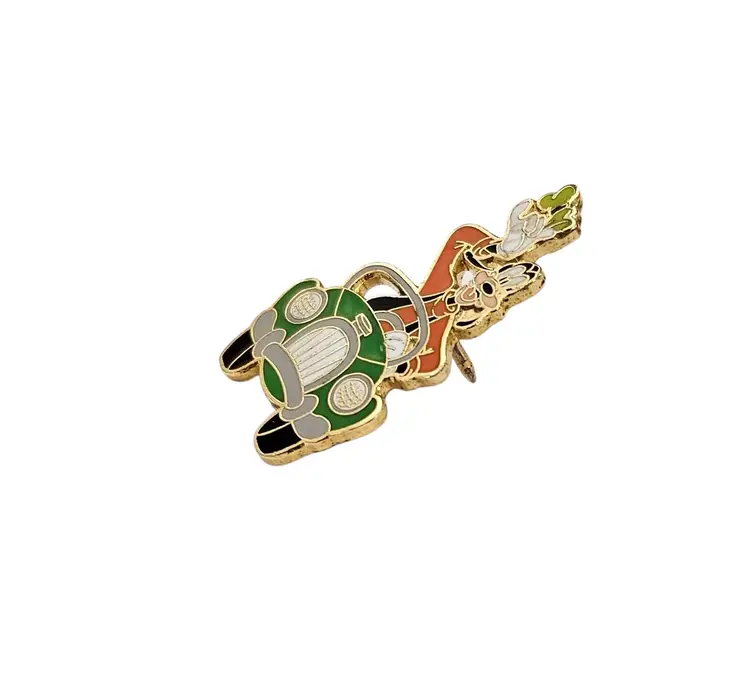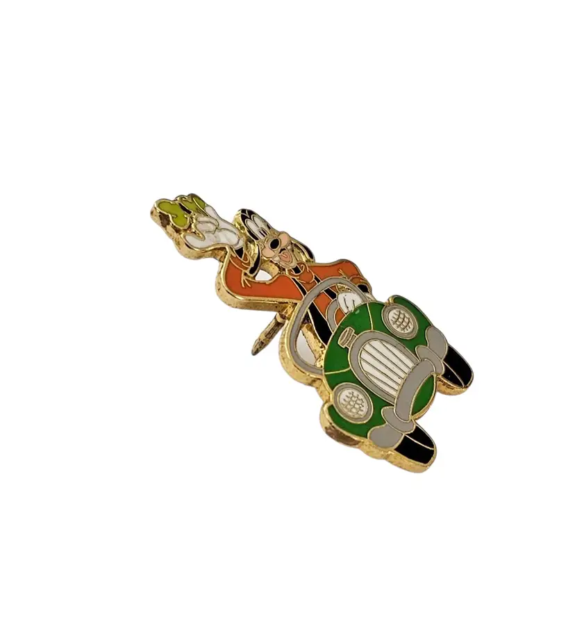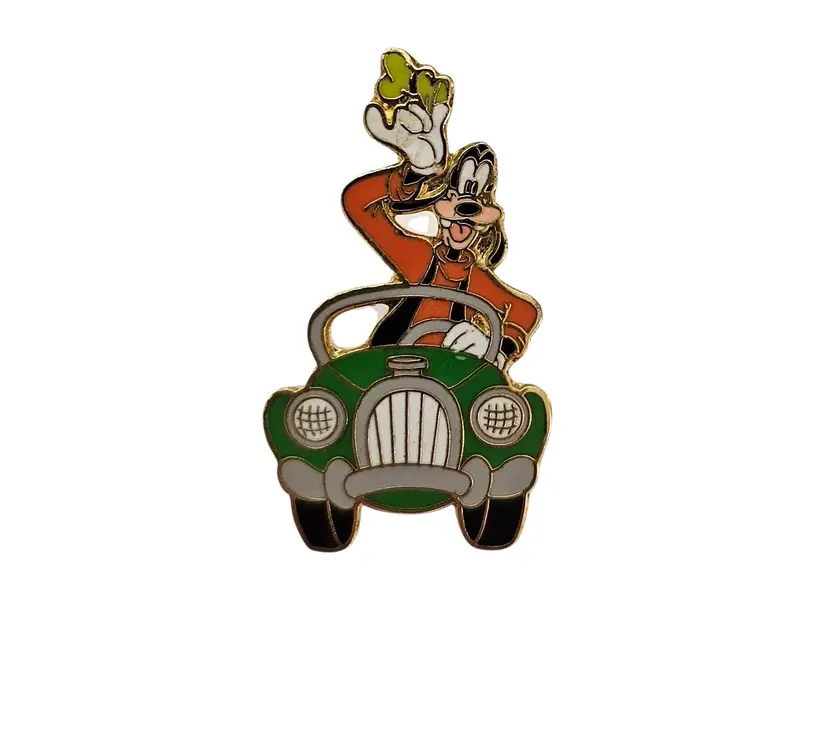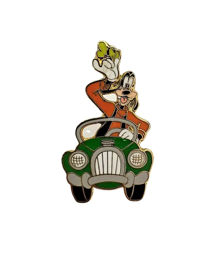 • Goofy In Car Driving Vintage, Disney Pin • Walt Disney Travel Company - Goofy in Car • Walt Disney World Pin • Open edition • This pin was given to guests who booked a Flex Vacation Package • Through the Walt Disney Travel Company. • It features Goofy driving a green car with his hat in his hand, waving • The back is marked © Disney Walt Disney Travel Co., Inc. CHINA • It has a single post, with a gold-tone butterfly clutch locking component • Good condition • C200