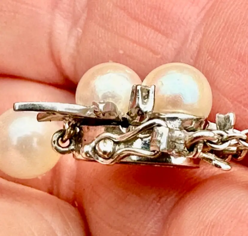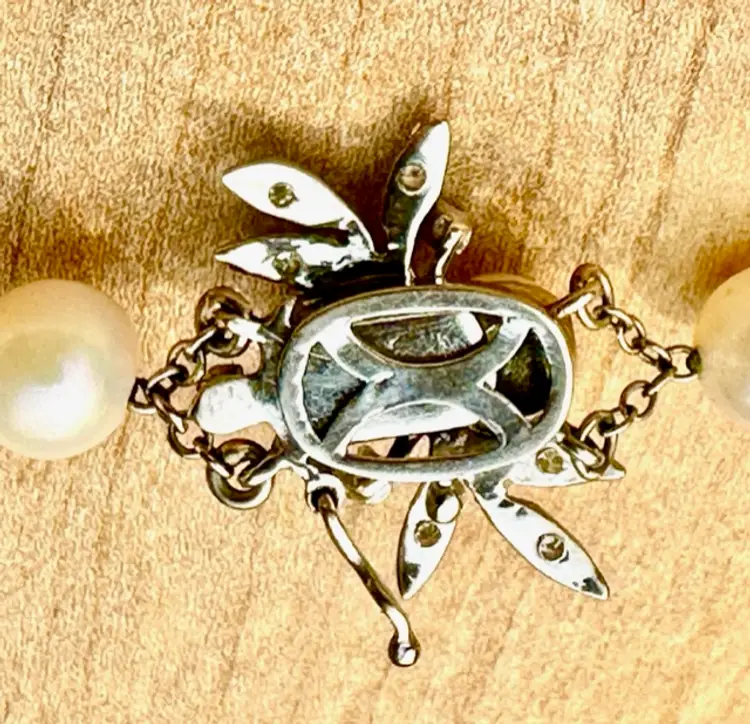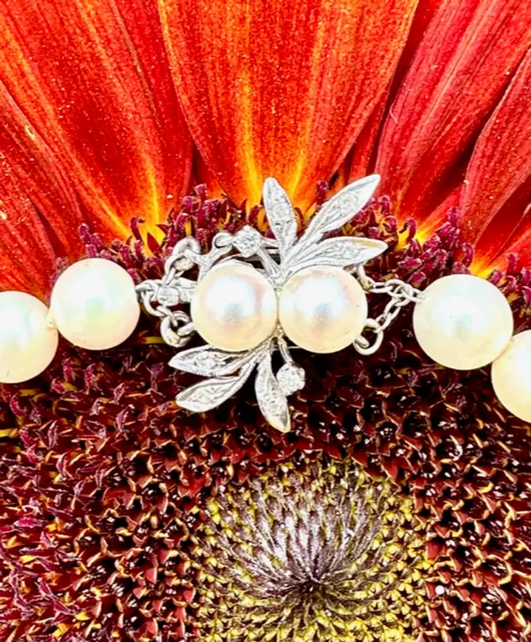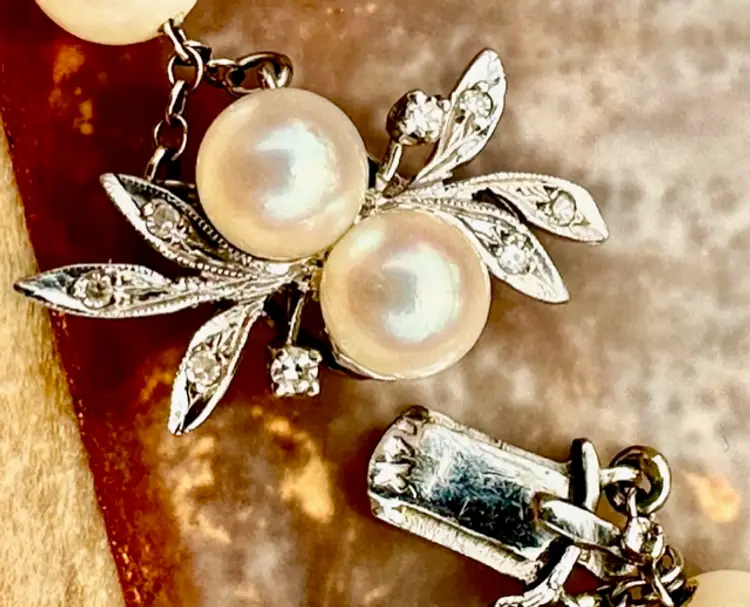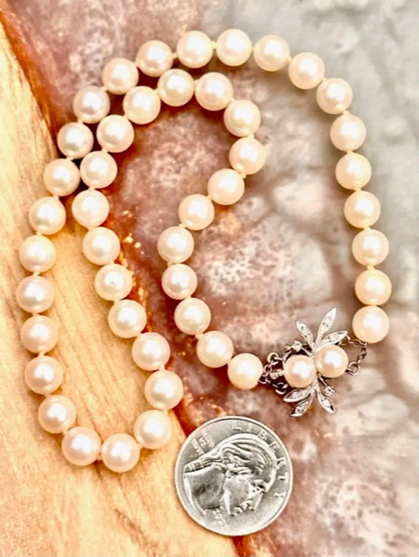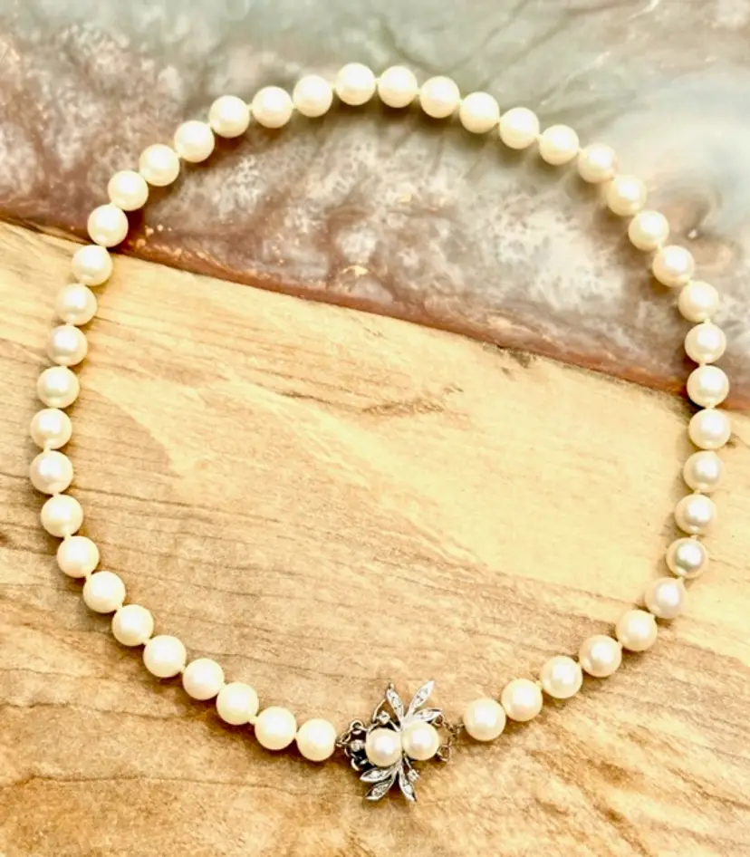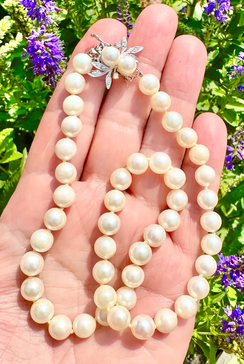 This timeless vintage Akoya Pearl Necklace is stunning! The 14K clasp can be worn in back or in front as a beautiful choker style necklace and is a piece of art by itself. Very nice diamond highlights.