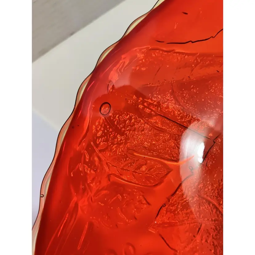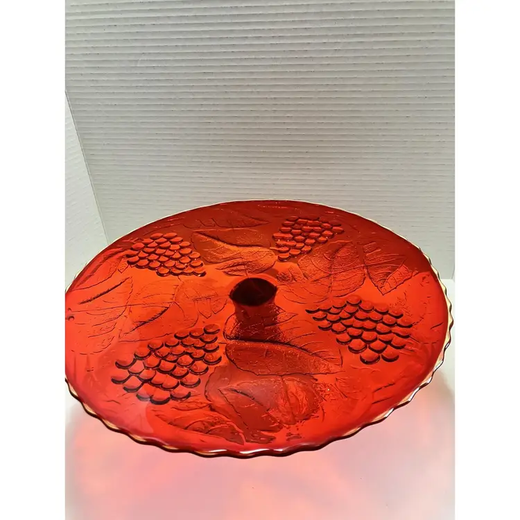 This gorgeous amberina cake plate has a grape and leaf motif pattern with scalloped edge . Has bubbles in the glass, refer to picture. Measures 12” in diameter and is 5 inches tall. Weighs4.5 pounds. Beautiful heavy piece.