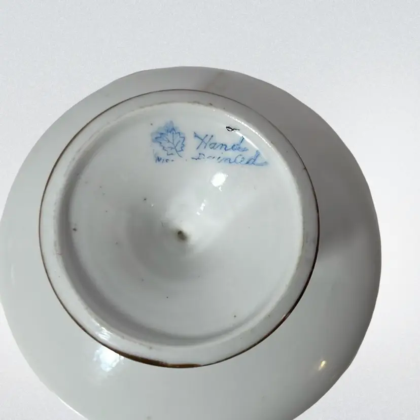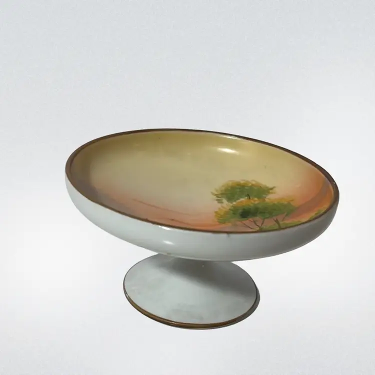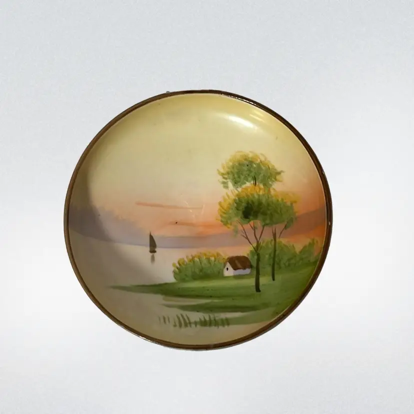 Decorated seascape featuring house on lake with trees and sailboat and lovely sky. In excellent vintage condition, no chips or cracks, minor wear on gold trim. See photos for conditions.