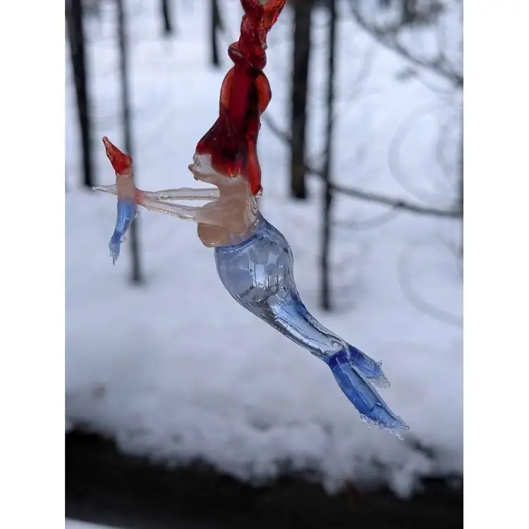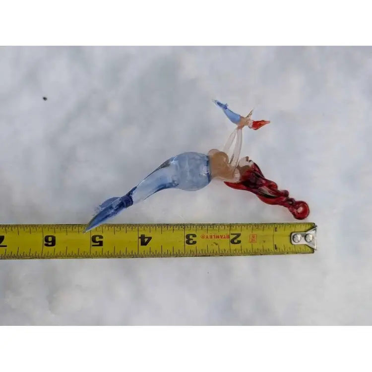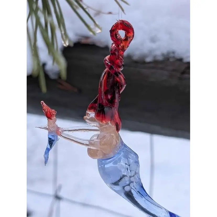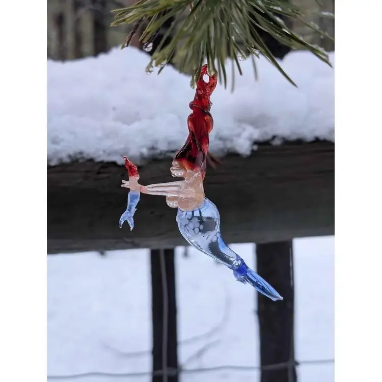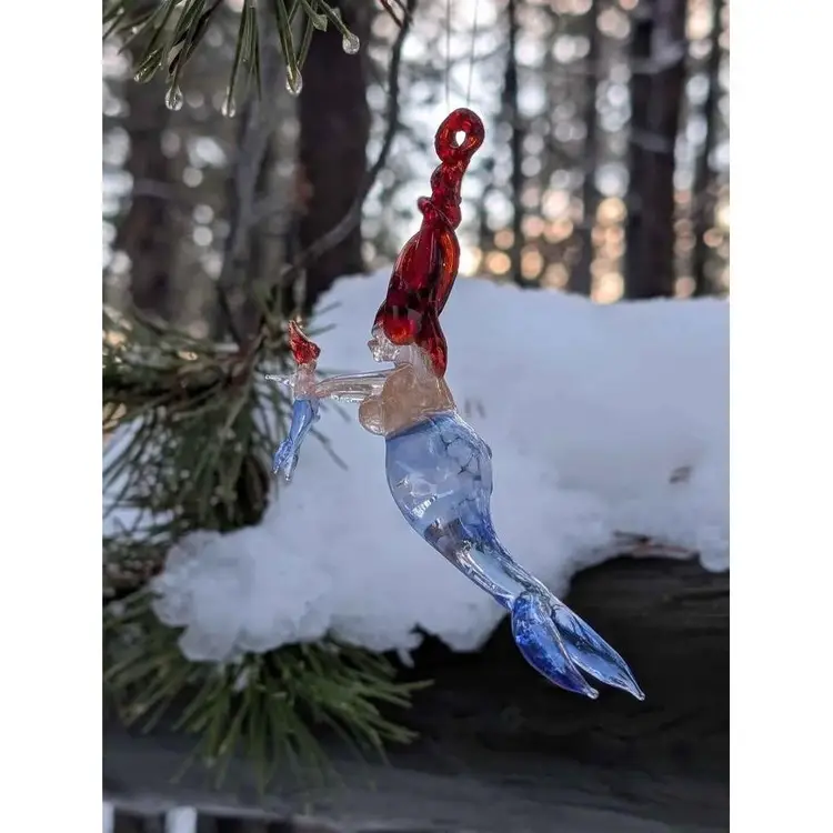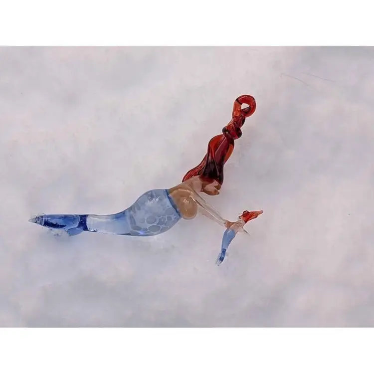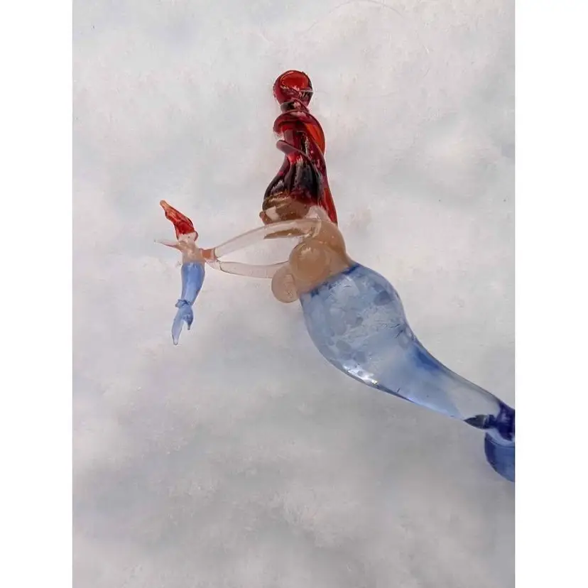 Gorgeous blown spun glass mermaid mother with baby ornament. This ornament is so unique - the glass work is impressive and so well made and delicate. She has twisted red hair that has a loop for hanging and a beautiful blue tail with spotted details near the bust. She is holding a small mermaid baby with delicate arms and the baby has all the similar features. This is in perfect condition with no chips or cracks - would make a great gift for any mermaid lover and can be displayed during the holidays or year round and would also be a fun decor piece for any beach house or coastal decor!
