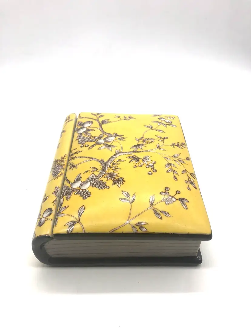 This exquisite porcelain trinket box, designed to resemble a book, is a stunning piece that adds a touch of vintage elegance to any space. The intricate floral design is beautifully detailed, creating a captivating piece of art.