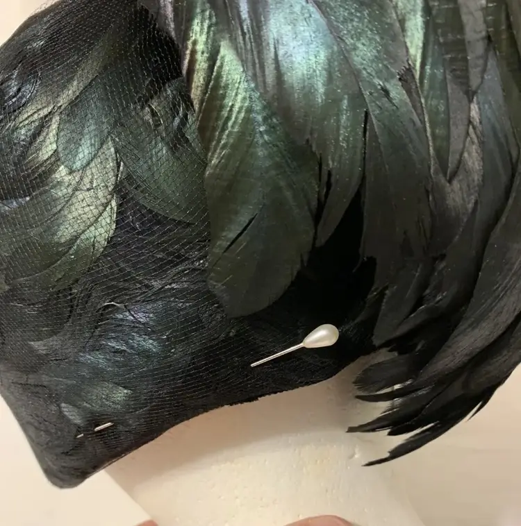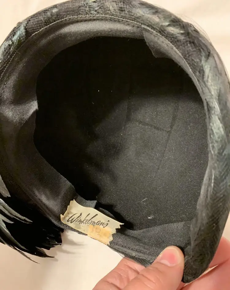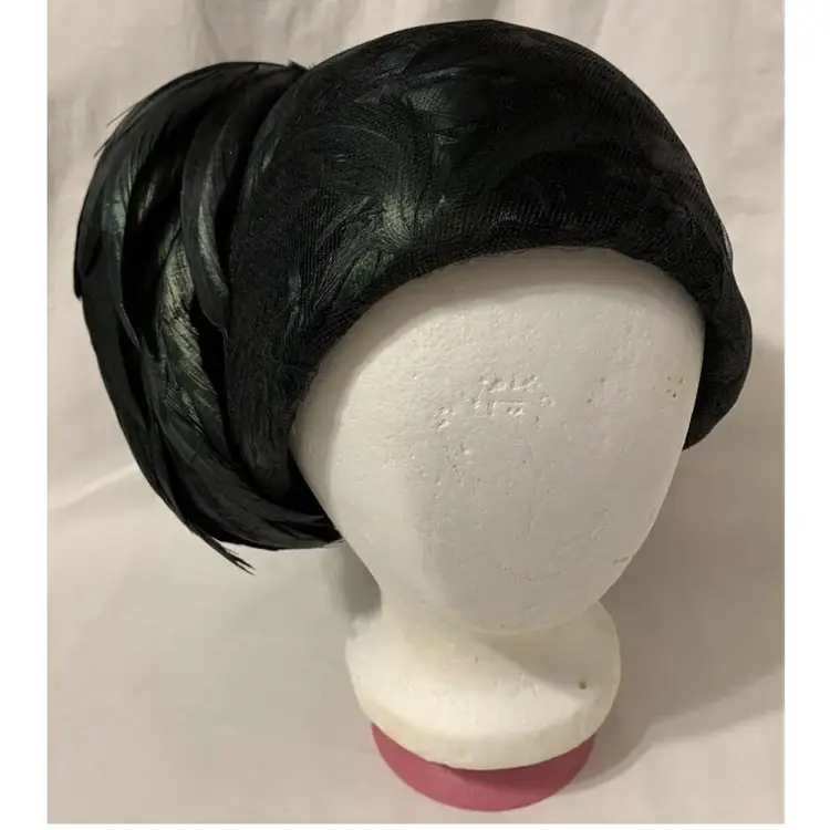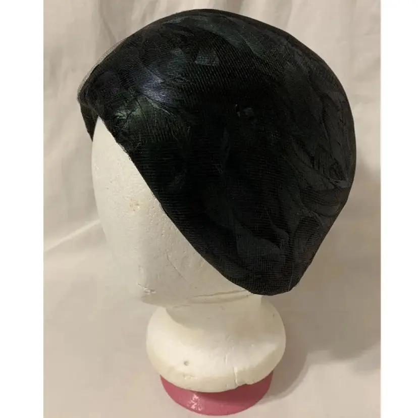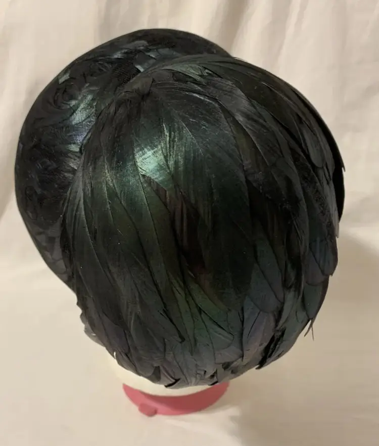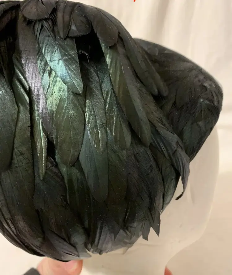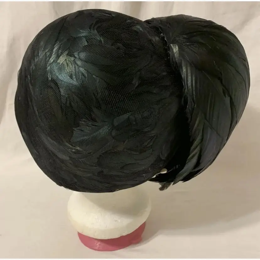 Gorgeous c. 1940s/50s Winkelman’s Iridescent Black Rooster Feather Women’s Pillbox Hat. Large tuft of feathers attached on the outside. Outer hat lined with feathers under a layer of mesh. Very stylish and elegant hat. No size. Measures 8” long, 7” wide, and 6” deep. Would fit nicely on an average sized head. Great condition some wear to the material and feathers but no major damage.