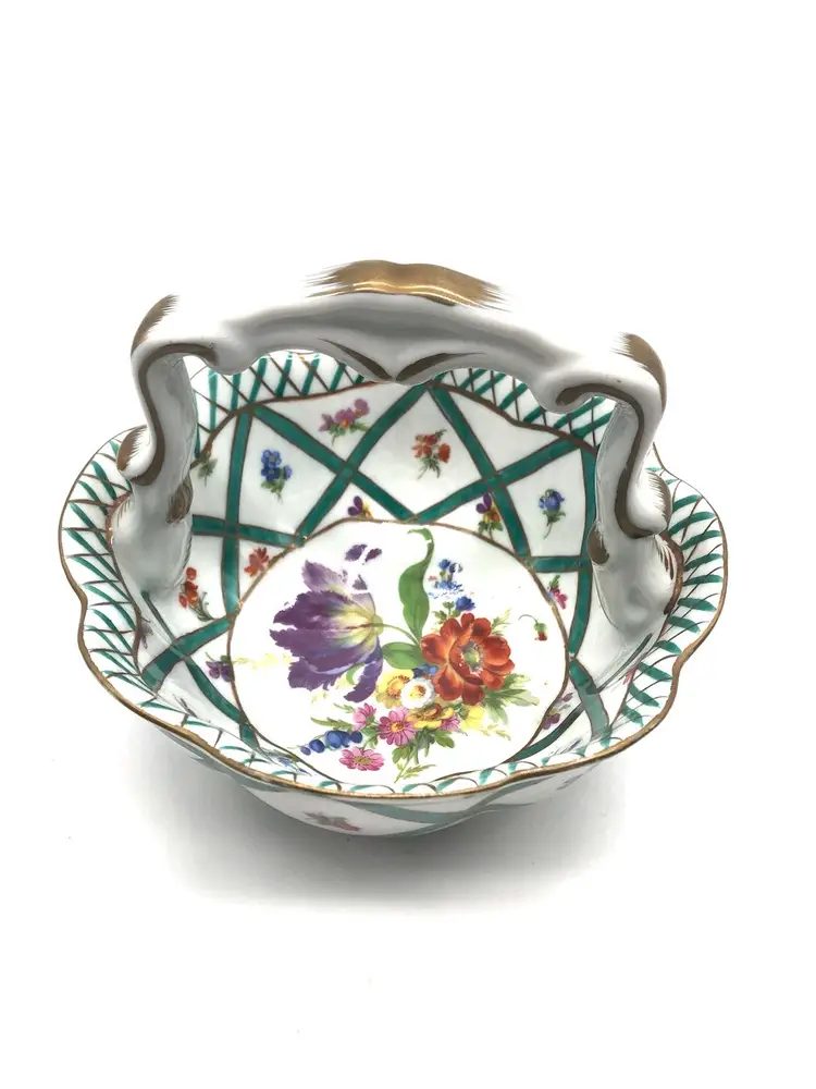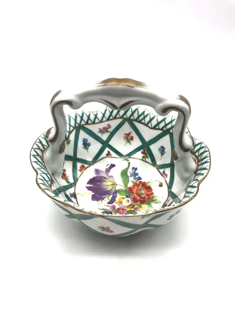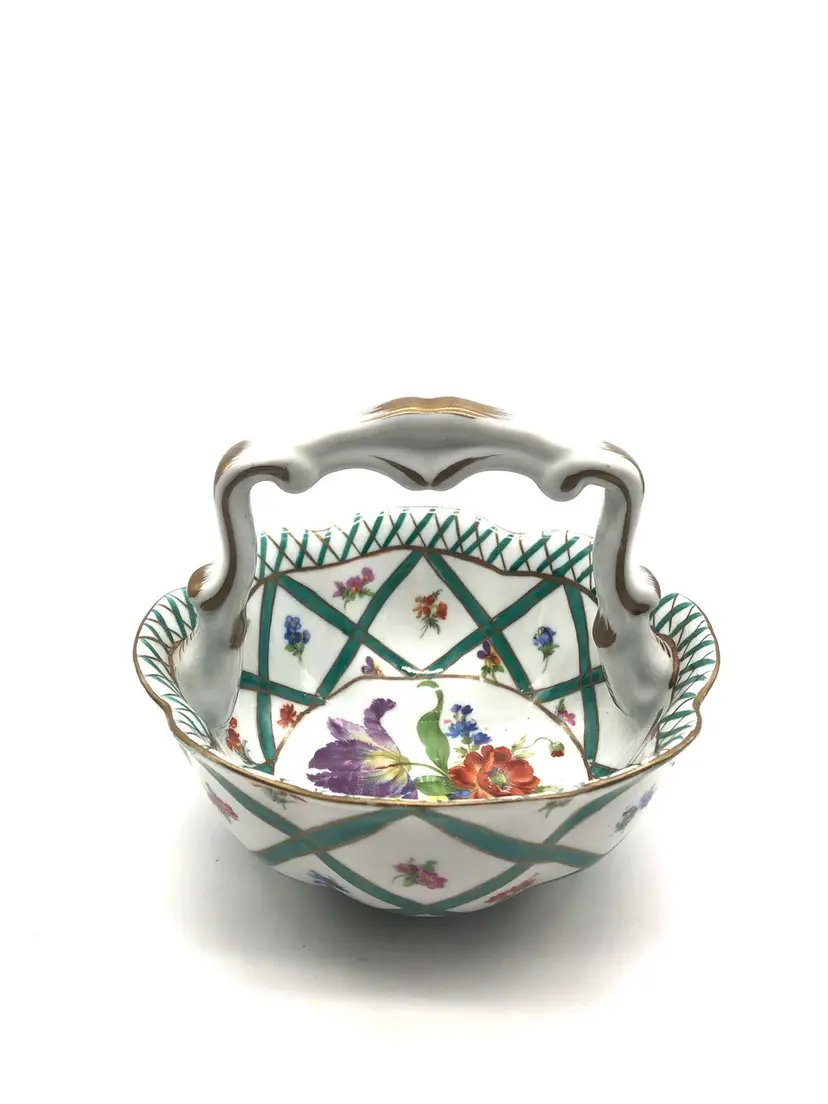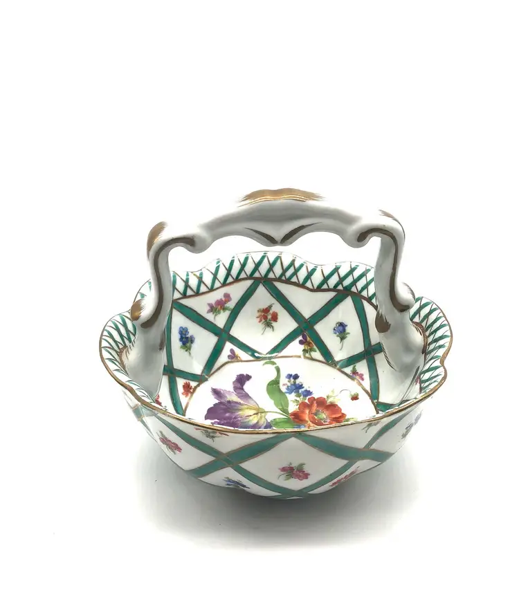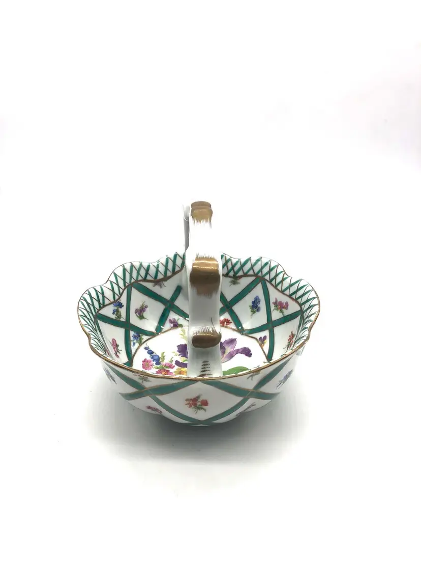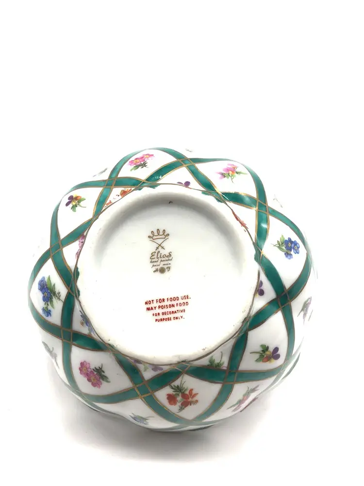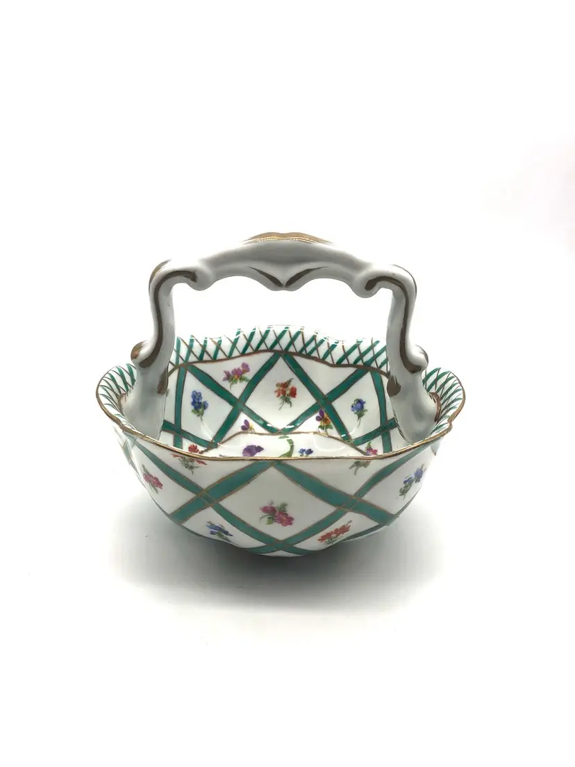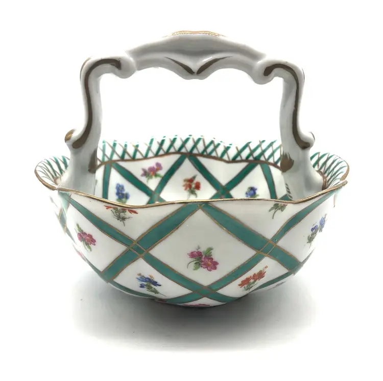 This stunning Elios porcelain basket showcases a vibrant blend of greenish blueish teal floral designs, hand-painted with exquisite detail. The intricate plaid pattern adds a touch of texture and visual interest.