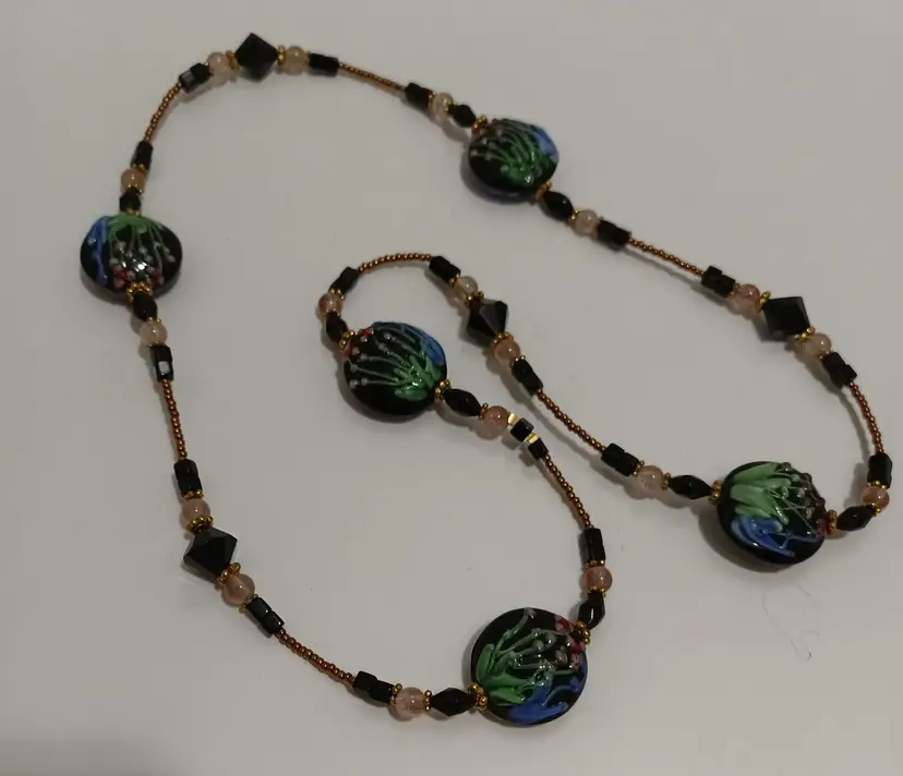 Hand Blown 1" Glass Lampwork Floral Beads with Rose Quartz and Black Glass and Gold Tone Beads Compliment Each other to Create this Stunner; Nice Spring Statement and Wearable Art! 24" Long; No Clasp