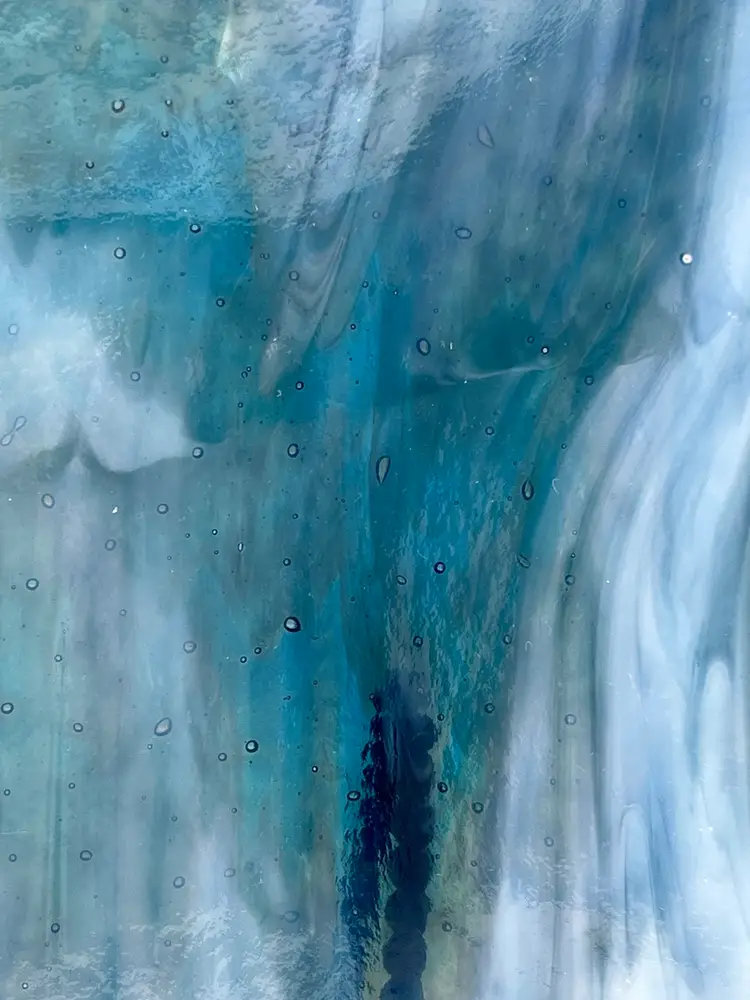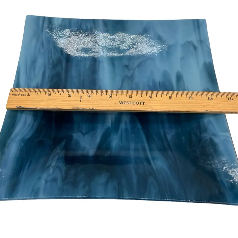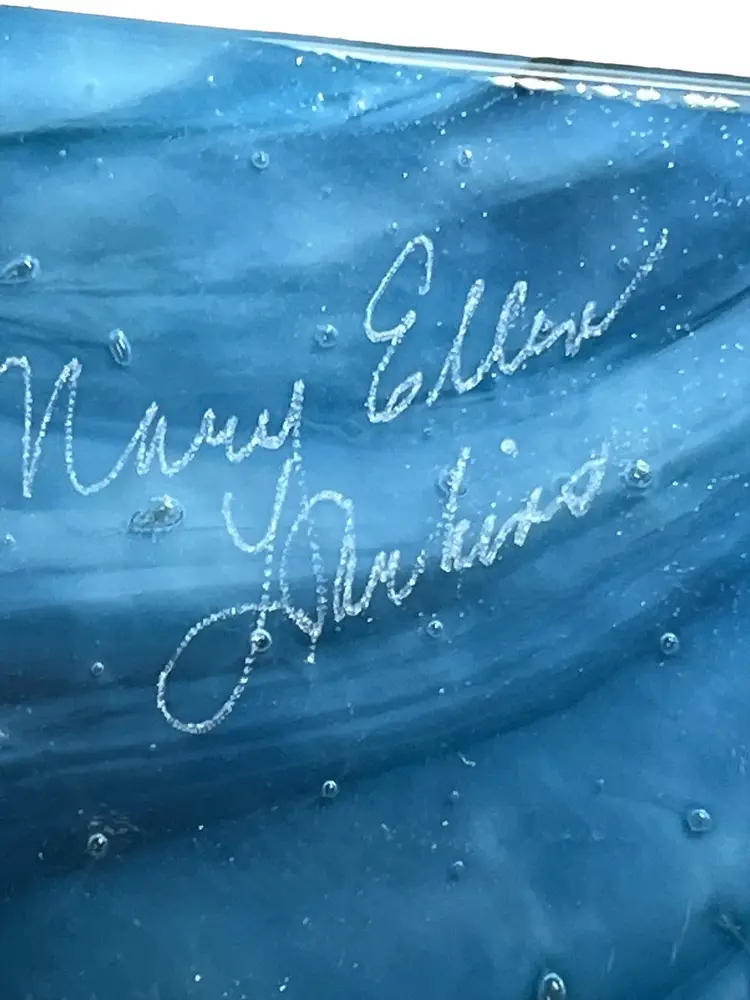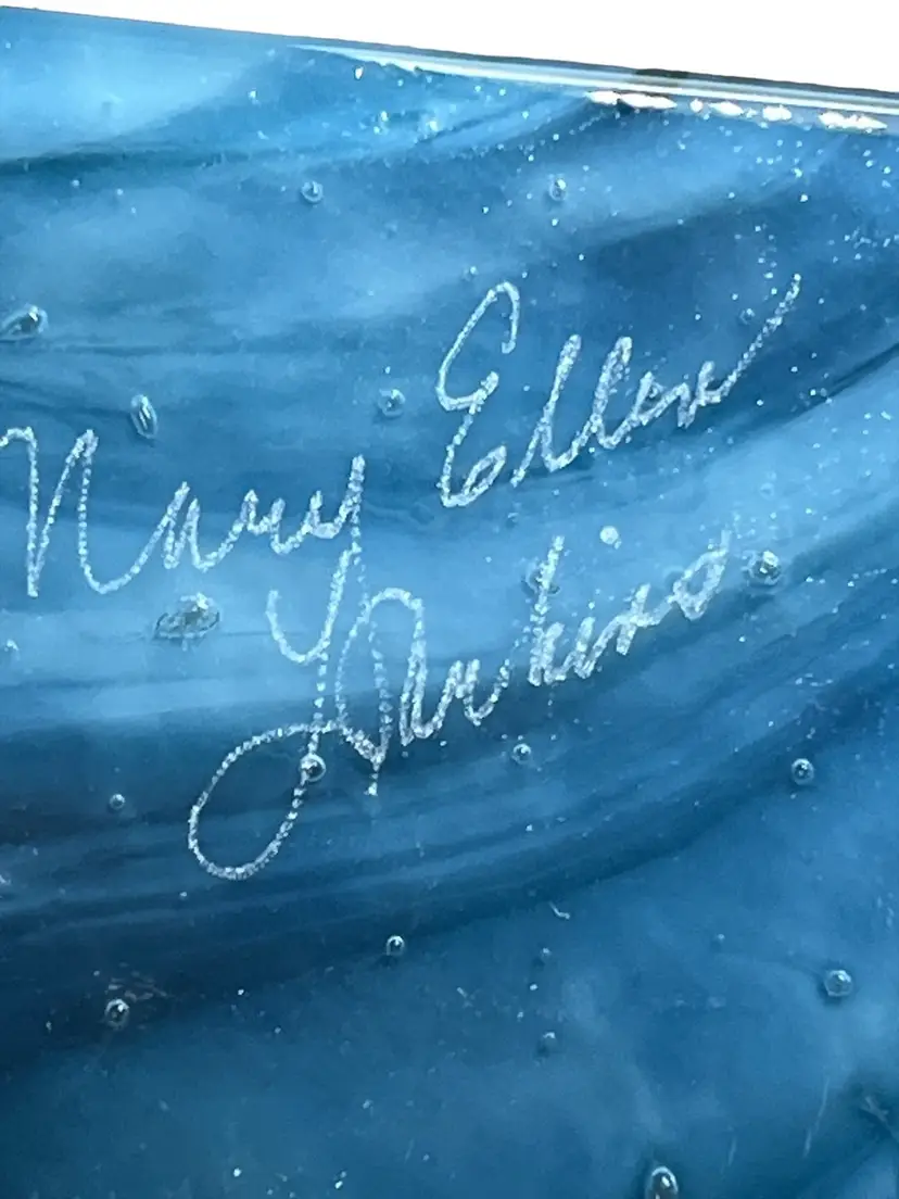 This amazing piece of art was made by Mary Ellen Larkins out of Charlottesville Va. It really needs to be displayed upright so you can get the full array of colors and movement that runs through it. In one position you see mountains but flip it and it becomes a rushing waterfall! At first glance you just see undulating blues and whites but, tilt it slightly and the iridescent turquoises, pinks, greens and other colors come to life! It is in nice used condition it does have some scratches.