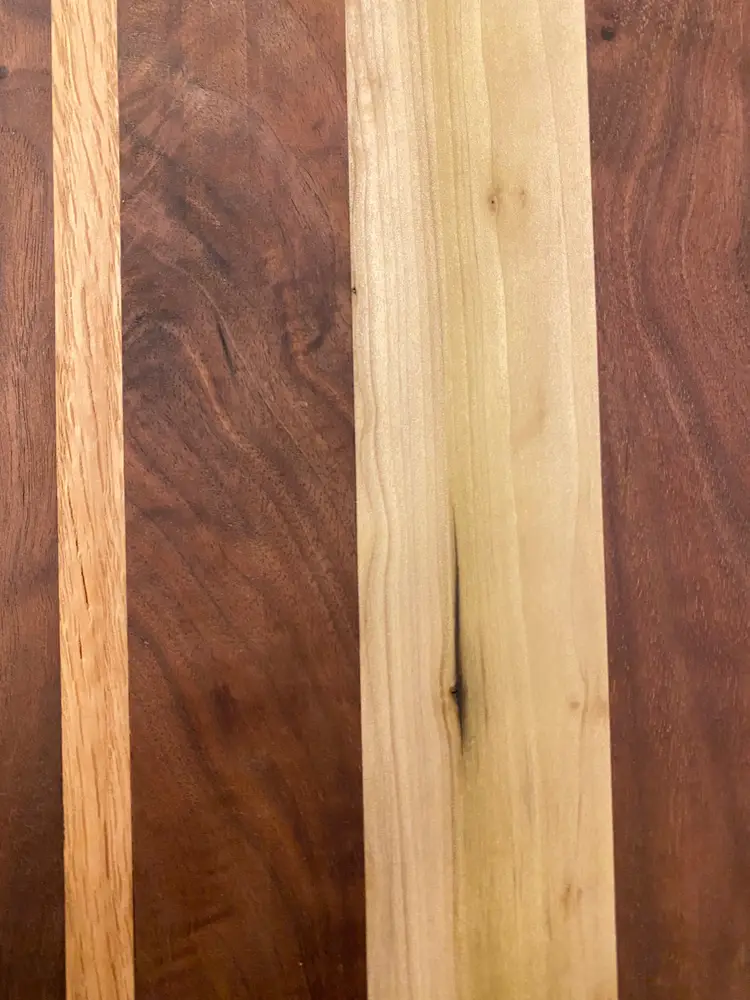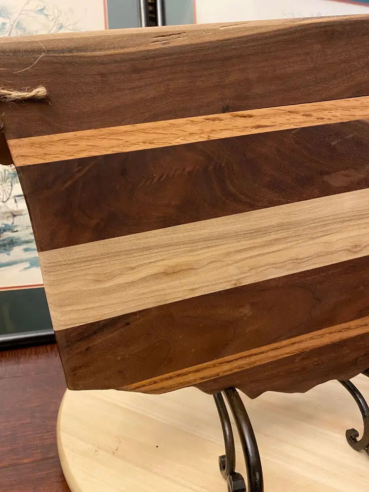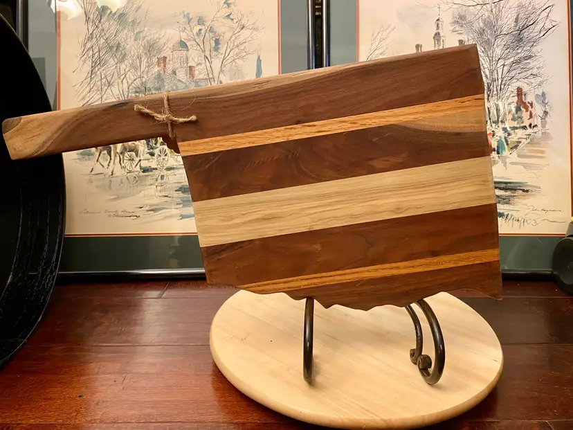 Cutting board charcuterie board decor designed in the shape of Oklahoma. This gorgeous cutting board is custom made, appears to be made of hickory hardwoods and walnut, maple. This one-of-a-kind cutting board is perfect for food preparation or for serving appetizers, meats, cheese and desserts. It can be hung on a wall or used as a stunning accent piece on a countertop or kitchen island. The varied wood grain exhibits the true beauty of the wood.