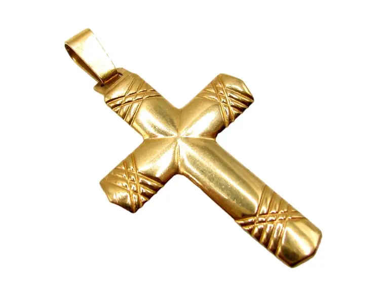 This wonderful vintage 18k gold cross features a woven striped etch design.