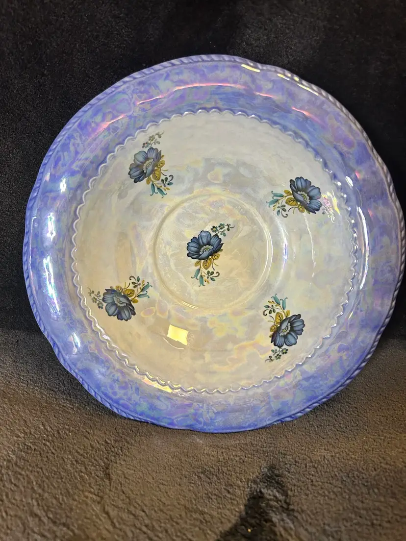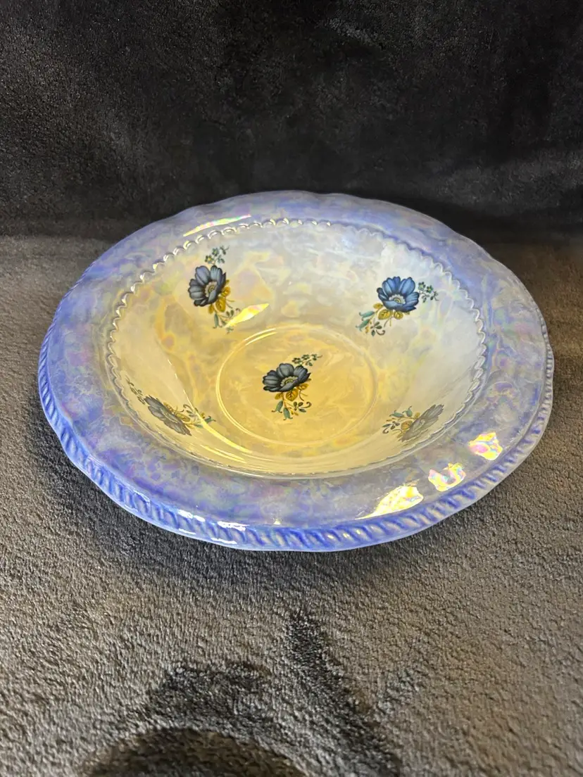 This Lustreware dish features beautiful blue flowers on a ceramic and porcelain material. The dish exhibits a stunning lustre finish, giving it a unique and decorative appeal. Its origins and age are unspecified, adding to its mysterious charm