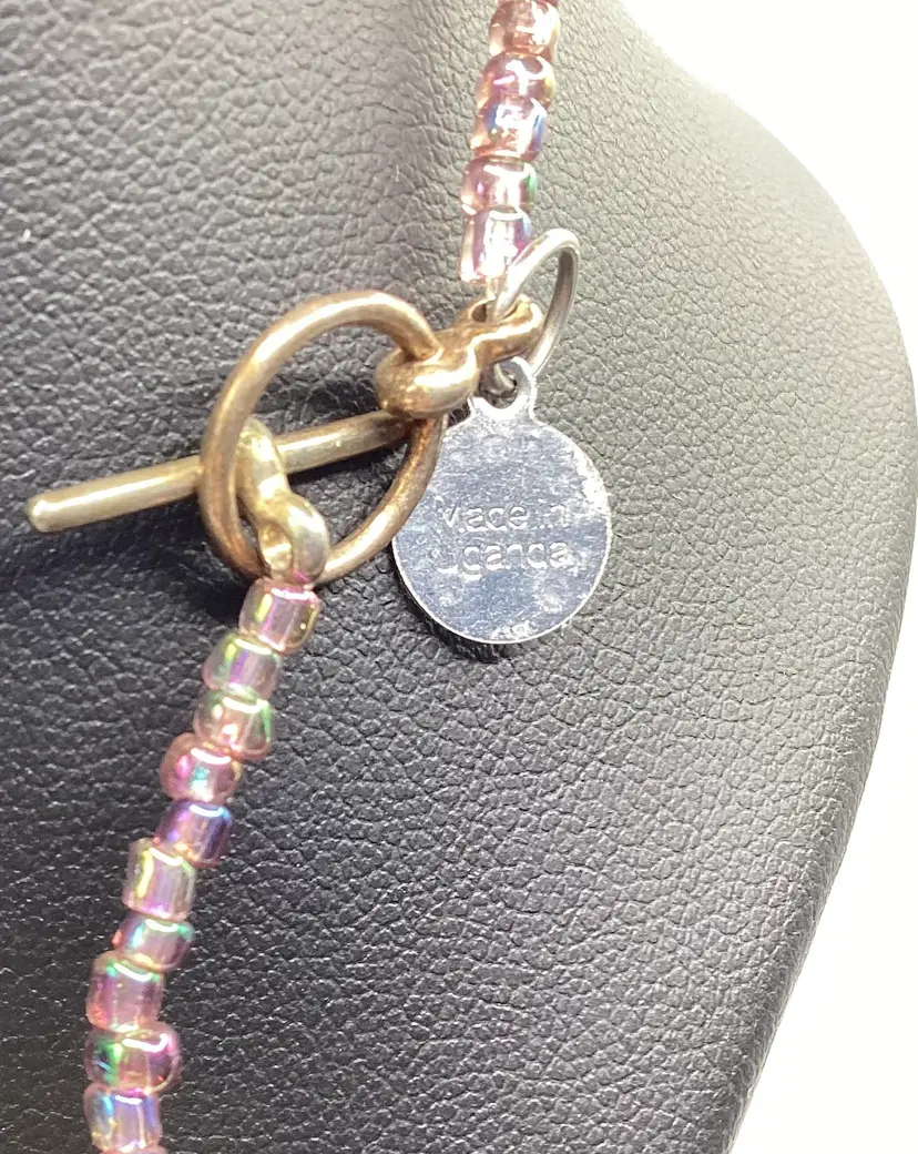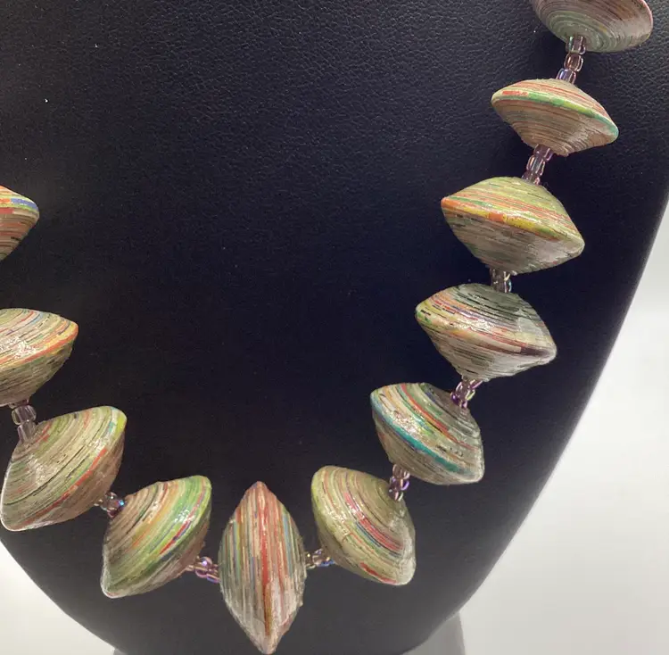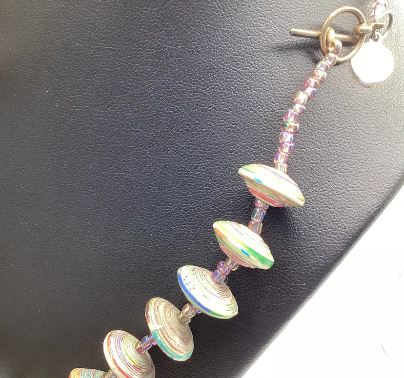 Brand: BeadforLife Identifier: Hang tag / Made in Uganda Features: Paper Rolled Beads / Seed bead spacers / AMAZING colors / Toggle Clasp Material: Paper Pattern/Design: Disc shaped beads w/seed beads Color: Multi colored (Again AMAZING color due to the disc shape) Measurements: Length - 20” and Widest Bead - 1” Condition: Used / Excellent Condition / Truly a work of art / No issues As is and explained to the best of my knowledge. Please reach out if you have questions!