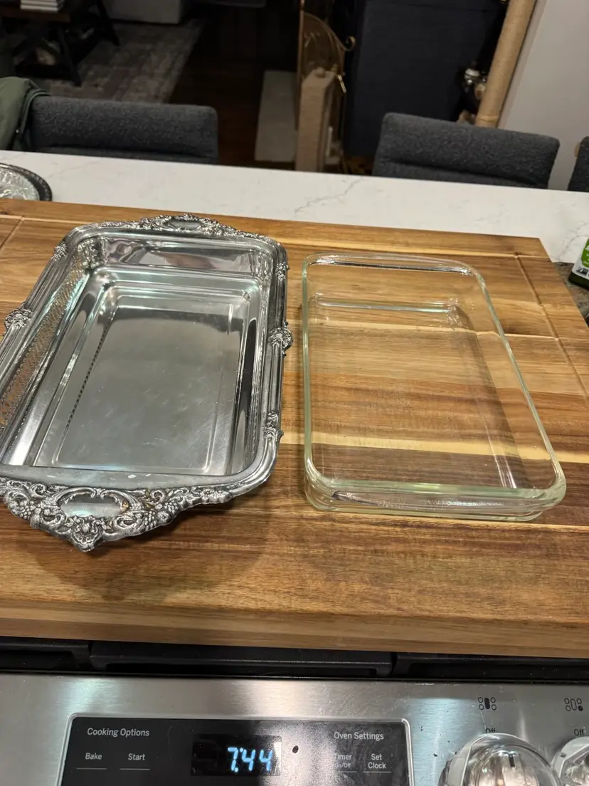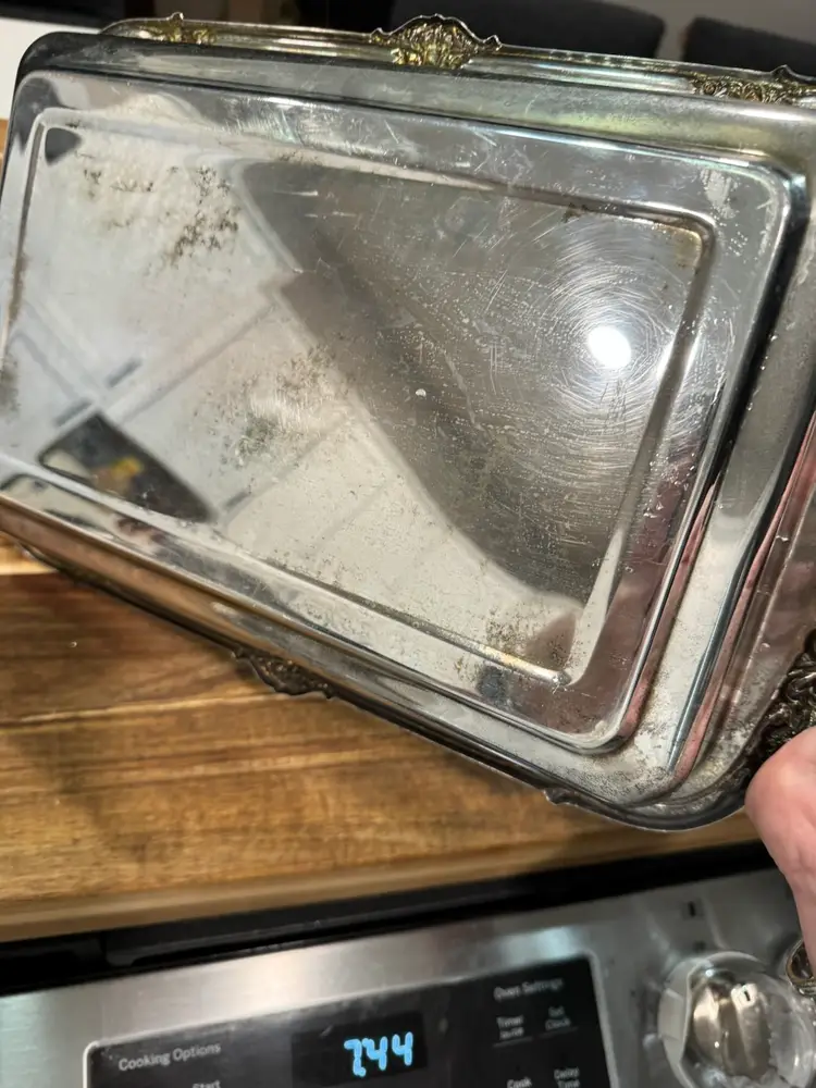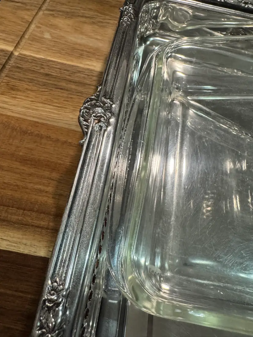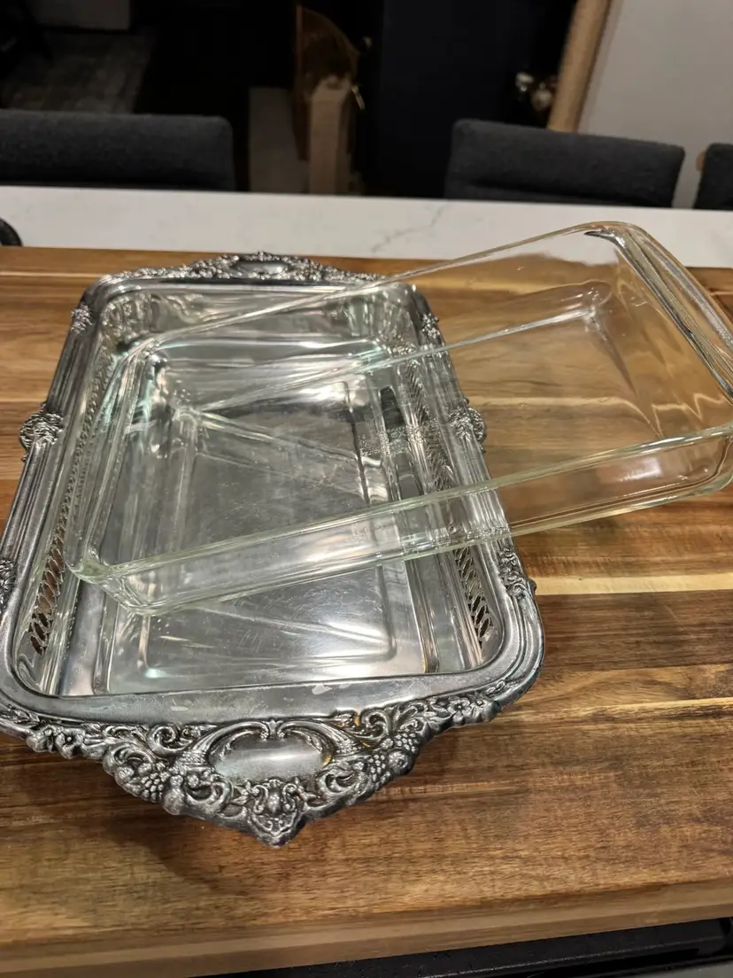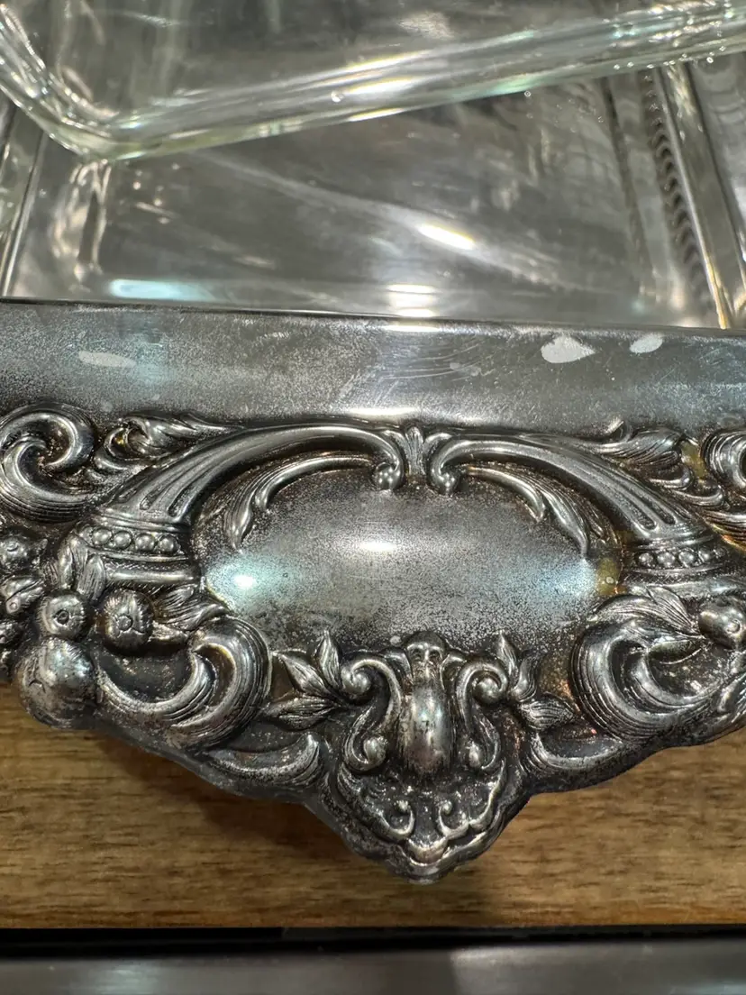 I’m not sure if the insert came with this but it fits perfectly. Baroque style silver plate. 17x10