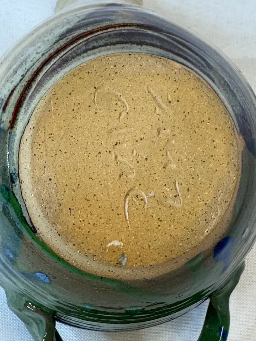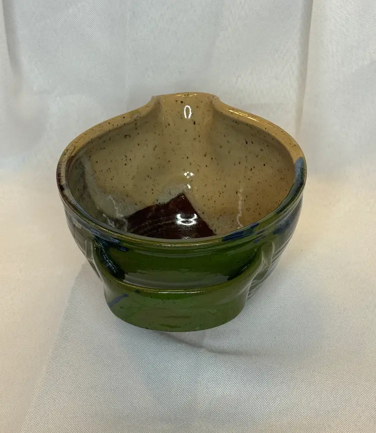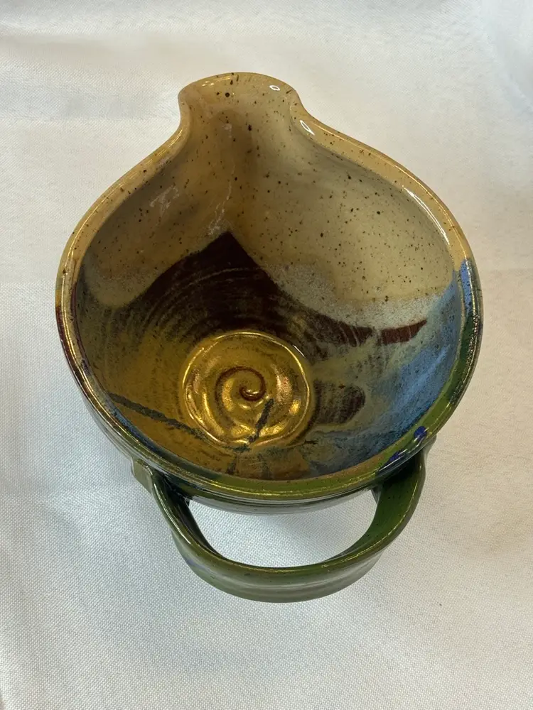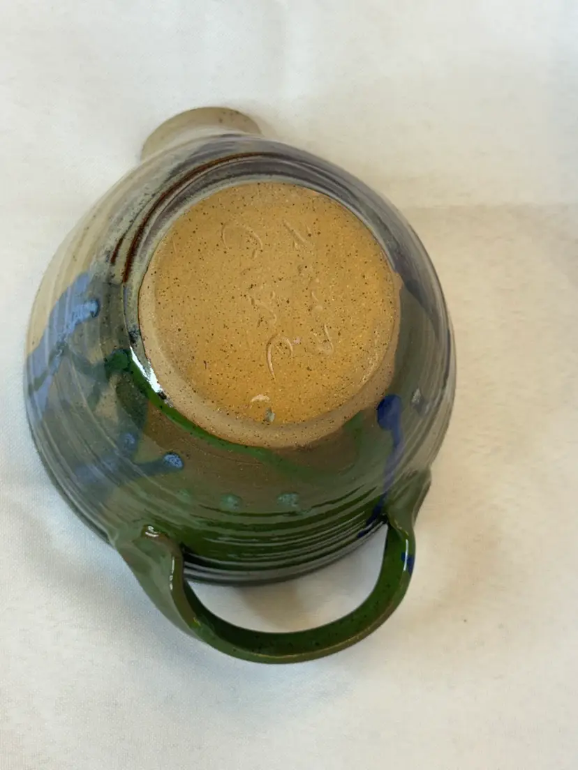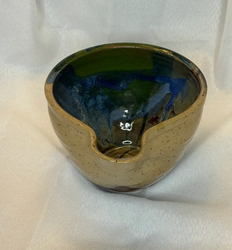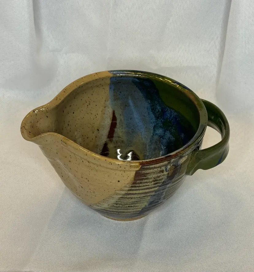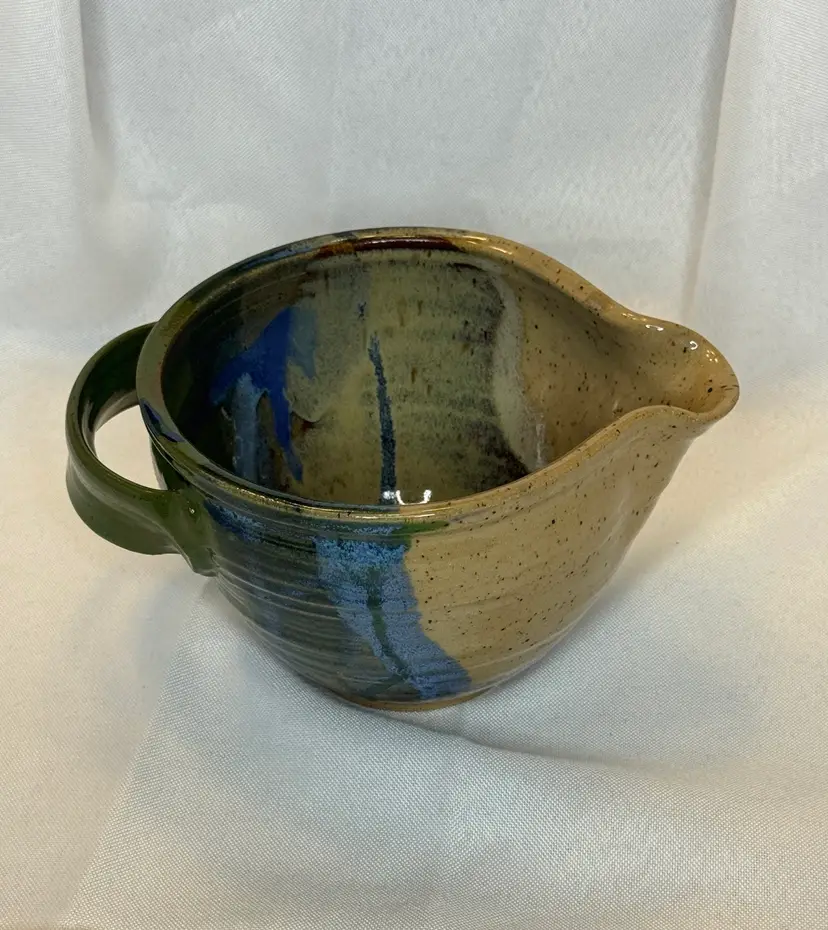 This hand-thrown art pottery mixing bowl is by Triny Cline of Byrd Mountain Pottery. It's a stoneware piece with a blue, tan, and green glaze, featuring a spout and handle. It is 5” deep and 6.5” across (7.5” across to spout).