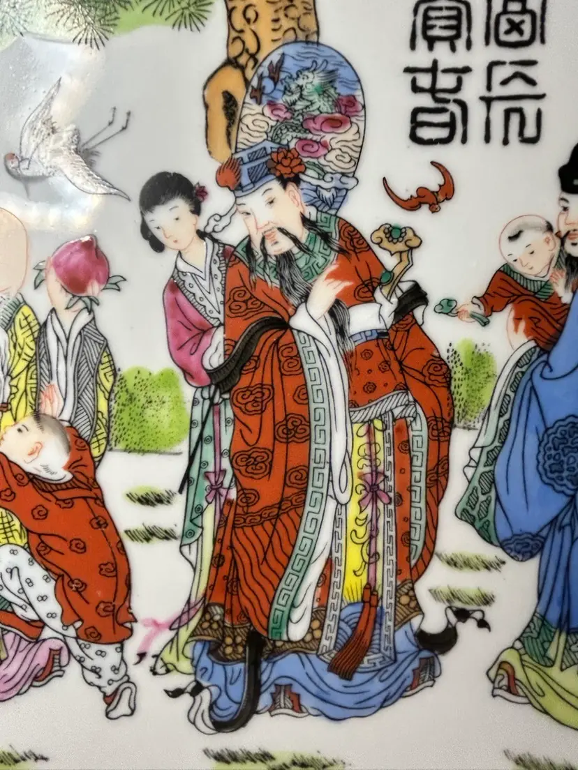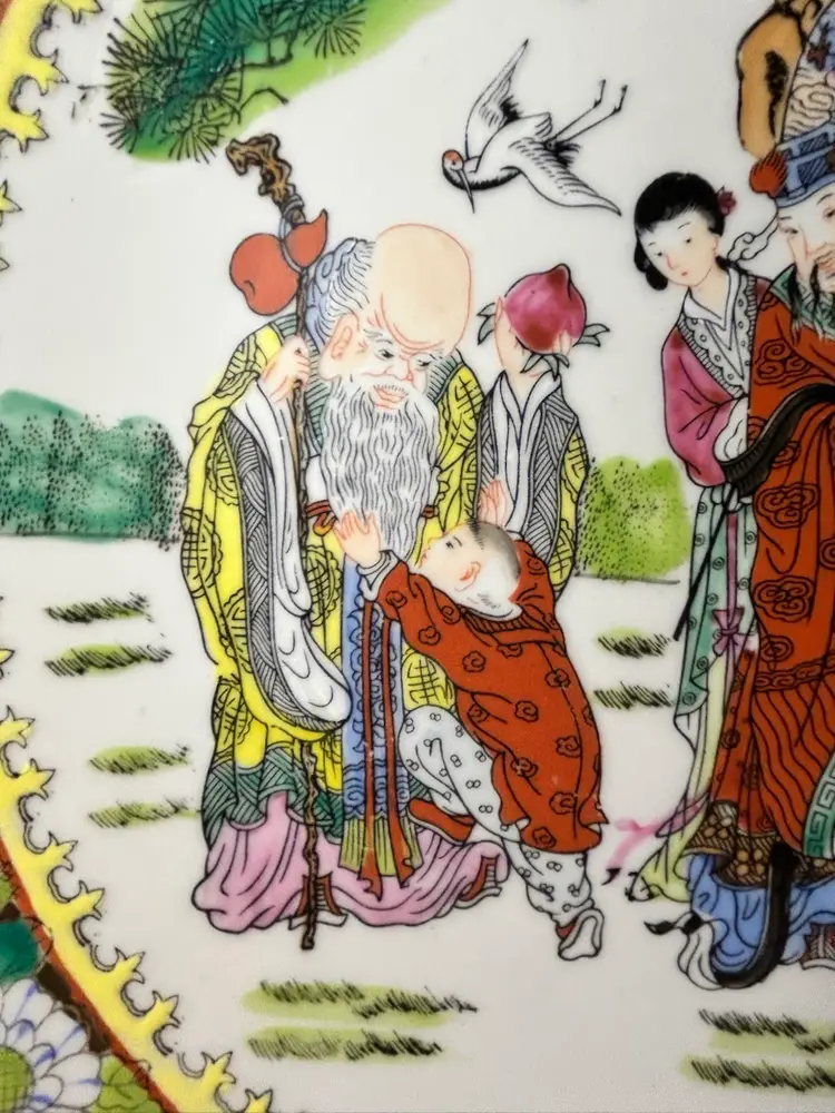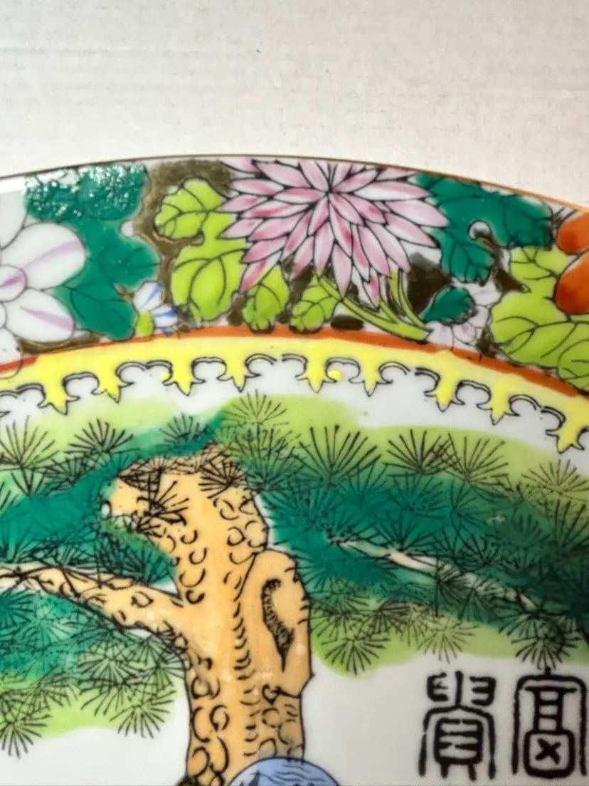 This is a vintage Chinese Famille Rose porcelain plate. The term "Famille Rose" refers to a type of Chinese porcelain that originated in the 17th century and is decorated with hand-painted enamels, predominantly in pink, white, yellow, and green. The style was produced until the early 1900s, with a revival in the 1960s.