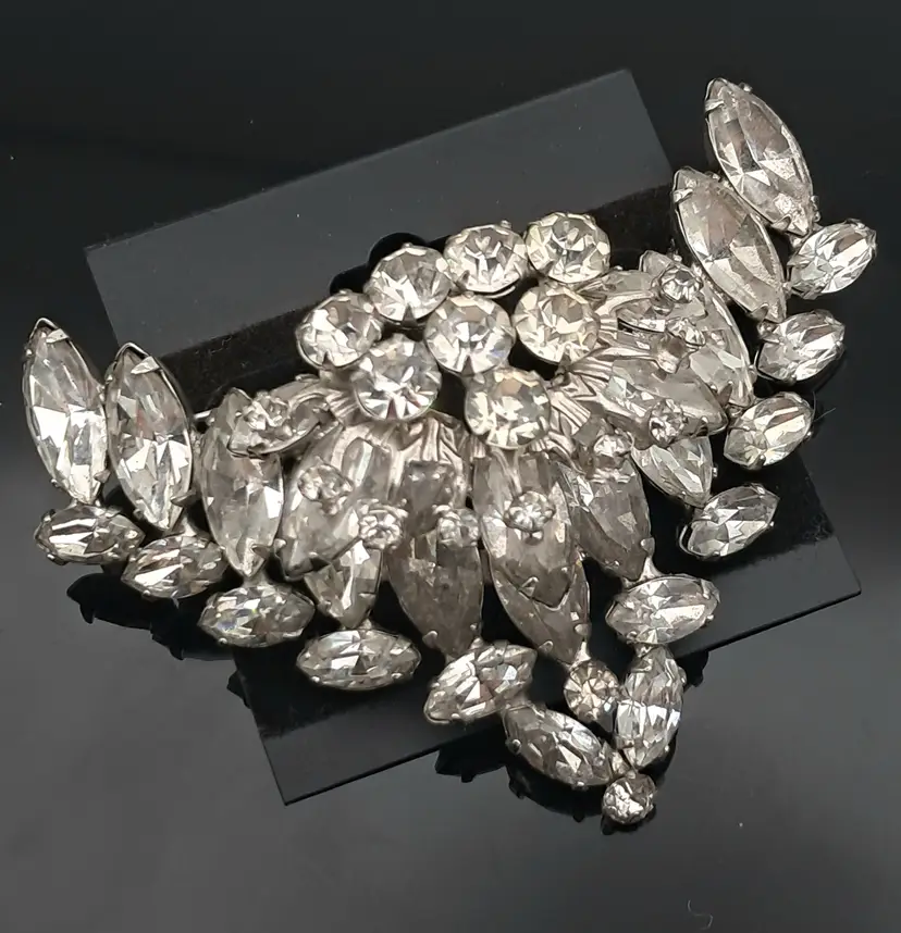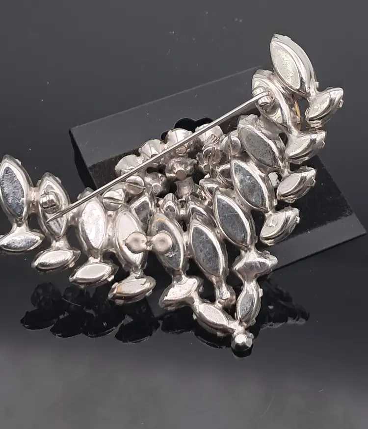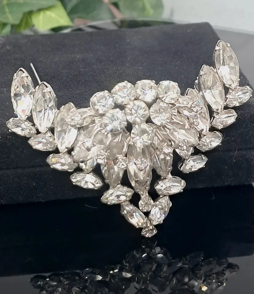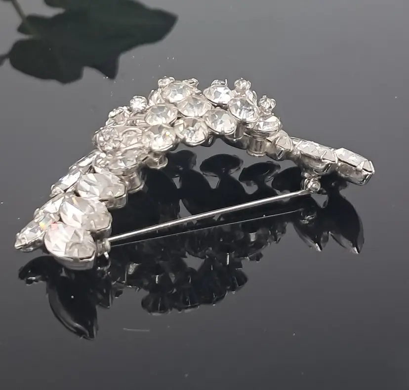The gorgeous pin has a very unusual V shape with the front layered on. Absolute gorgeous with the only call out is the place on back where it looks like someone may have stabilized or repaired it. 1 7/8" wide. Would be great pin to hold a blossom or two.
