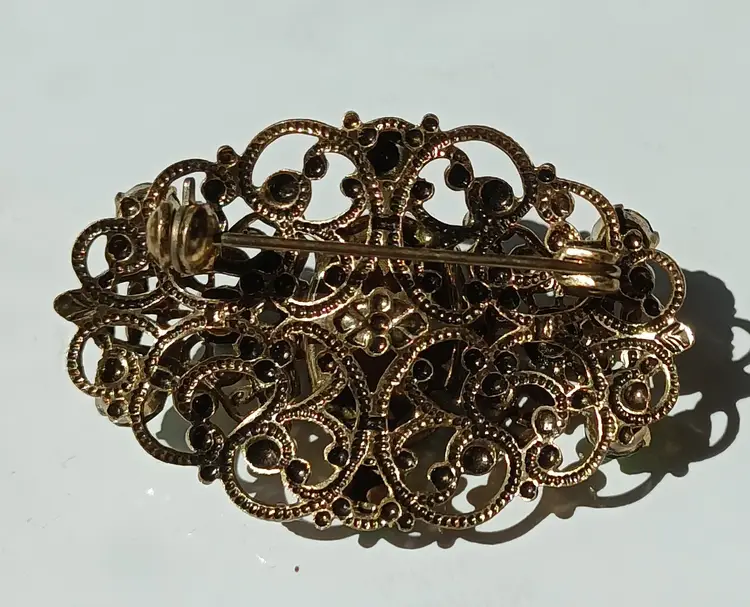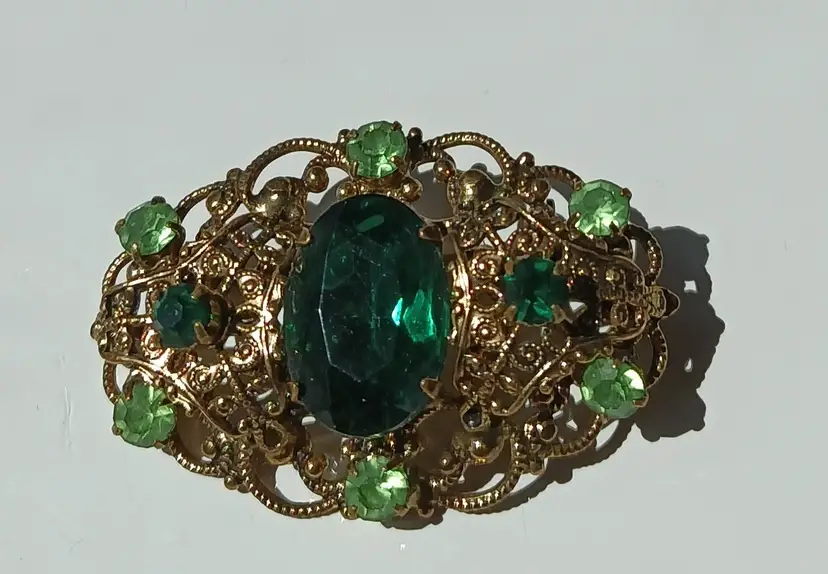 Gorgeous Vintage Czech Glass Brooch In 3 Shades of Green! Exceptional Filigree Design! No Markings; 2" L x 1.25 " W! A Stunner!